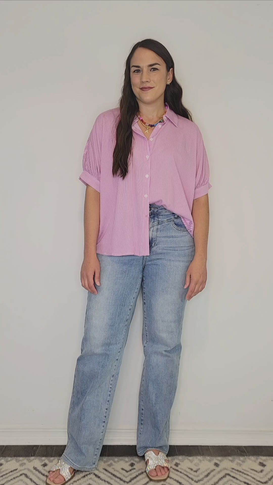 Details: So cute! This barbie pink and white stripe button up bouse is so adorable! Collared with white buttons. Lightweight and flowy fit. Soft and comfortable material. Dolman cuffed 1/2 sleeves and the perfect length. Very slightly longer in the back. Loving it with a french tuck! She looks cute with jeans or white denim.