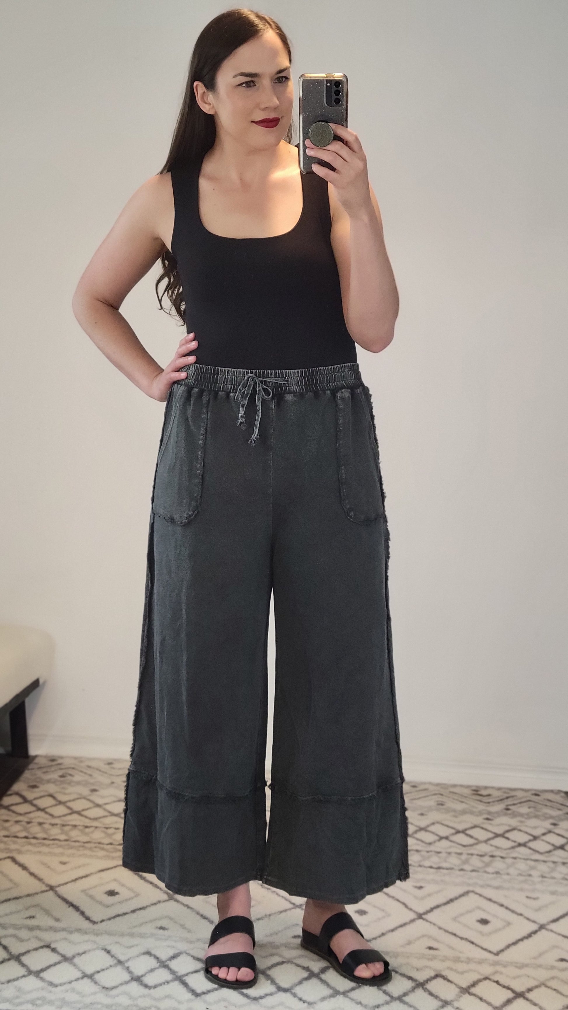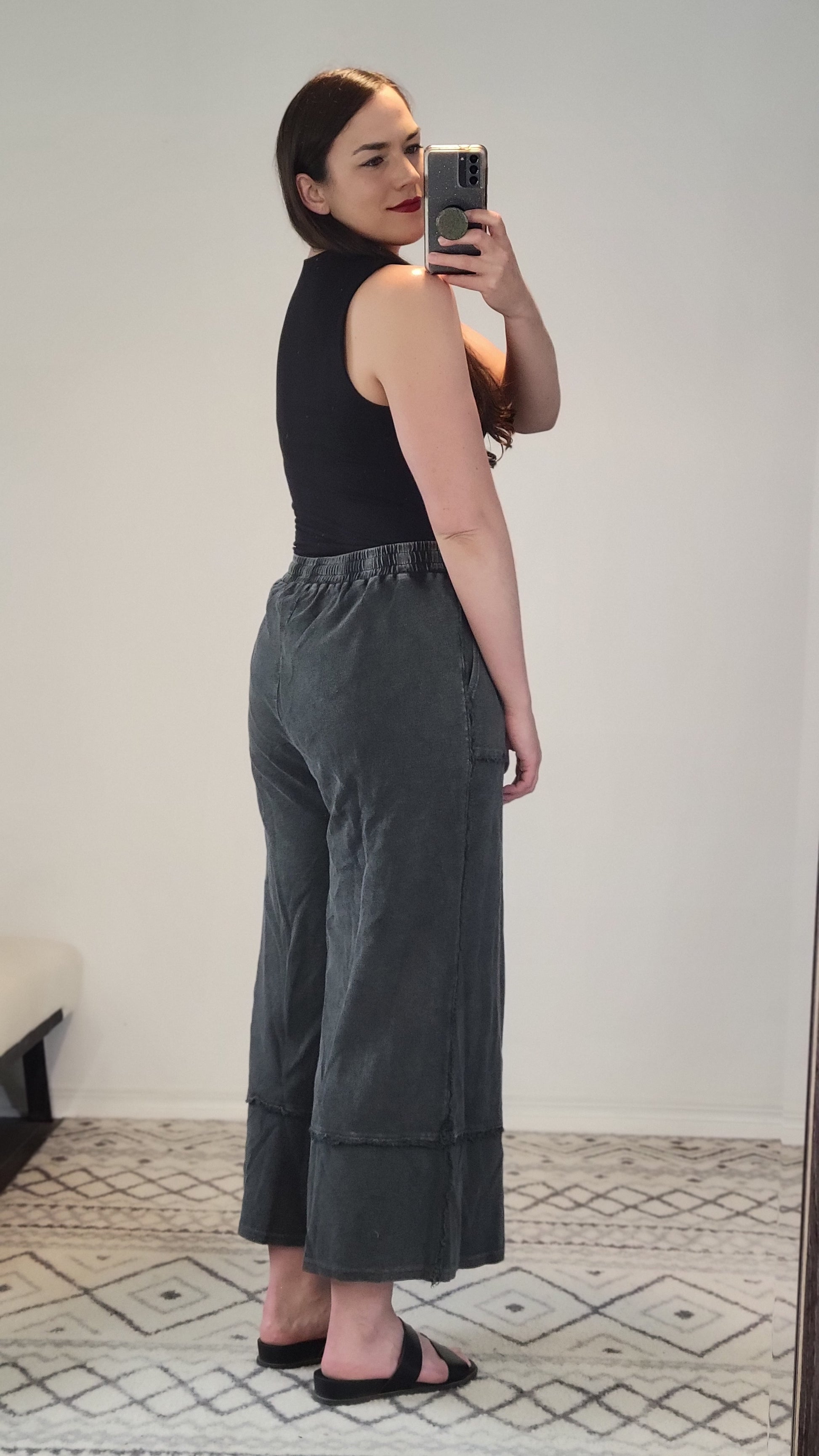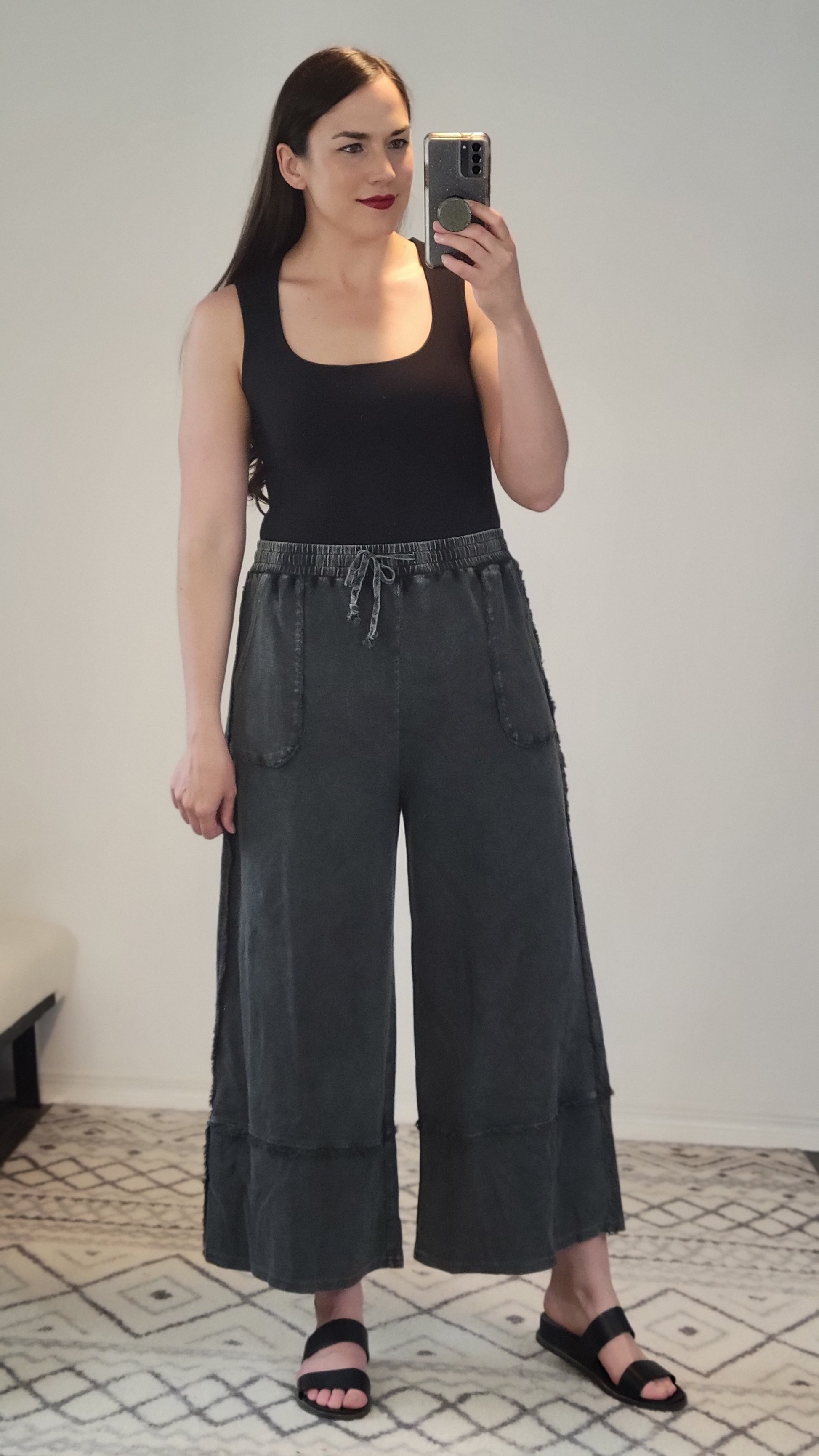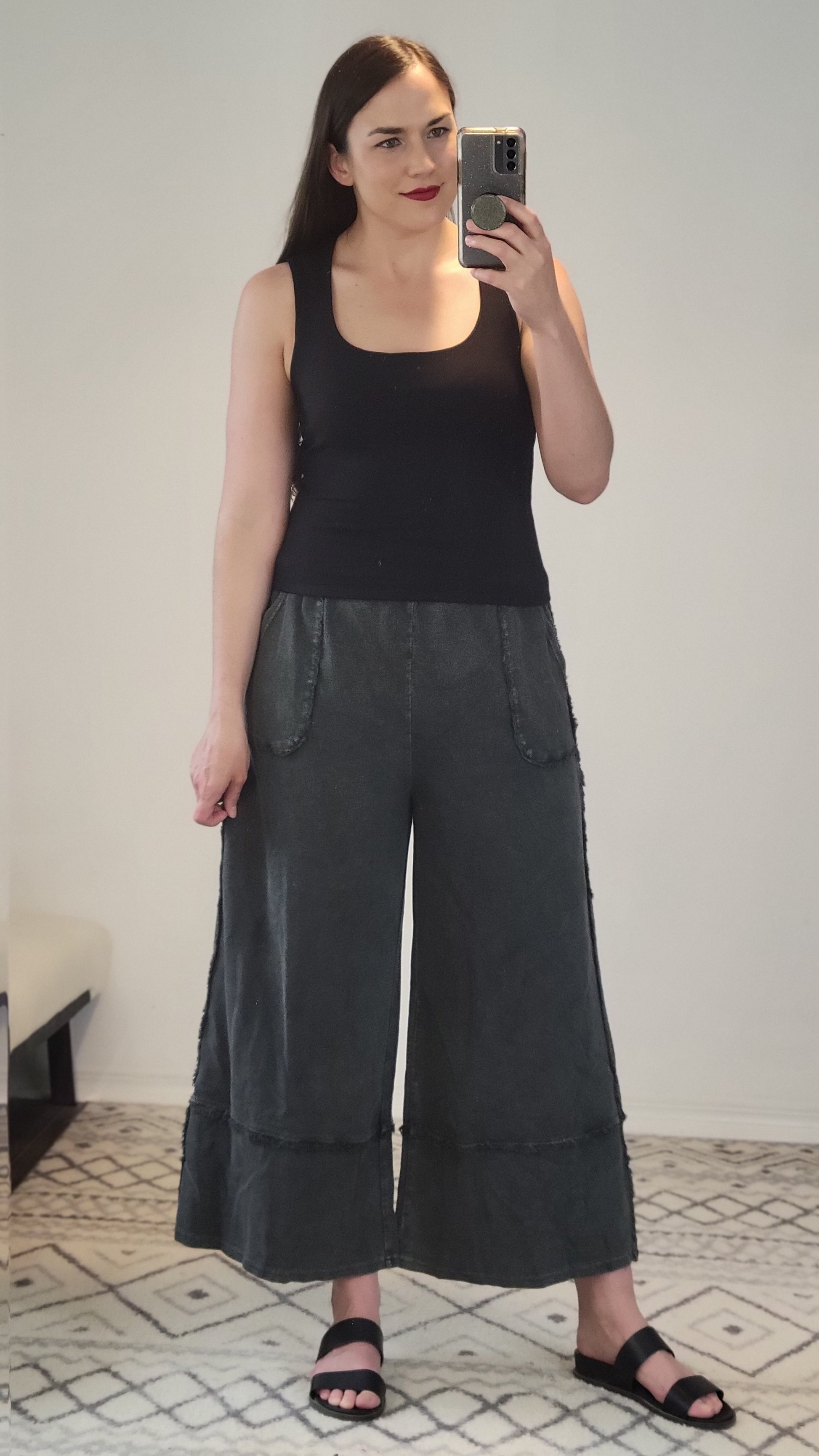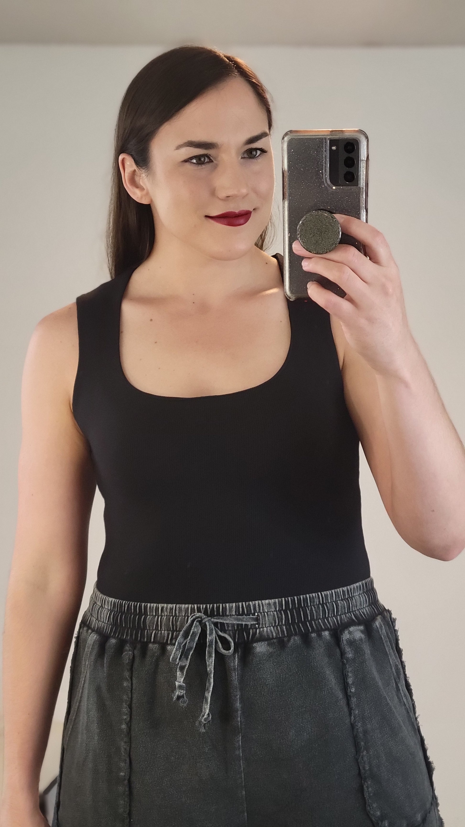 Details: The elevated basic you need! Outstanding quality, dreamy SOFT, and stretchy! The double layer is lightweight and smoothes everything. You can wear it with a regular bra. The square neck is beautiful and the length is perfect for tucking into high waist bottoms without a lot of extra material. You can also leave it untucked: let it hit the jean line and create a rushed look.