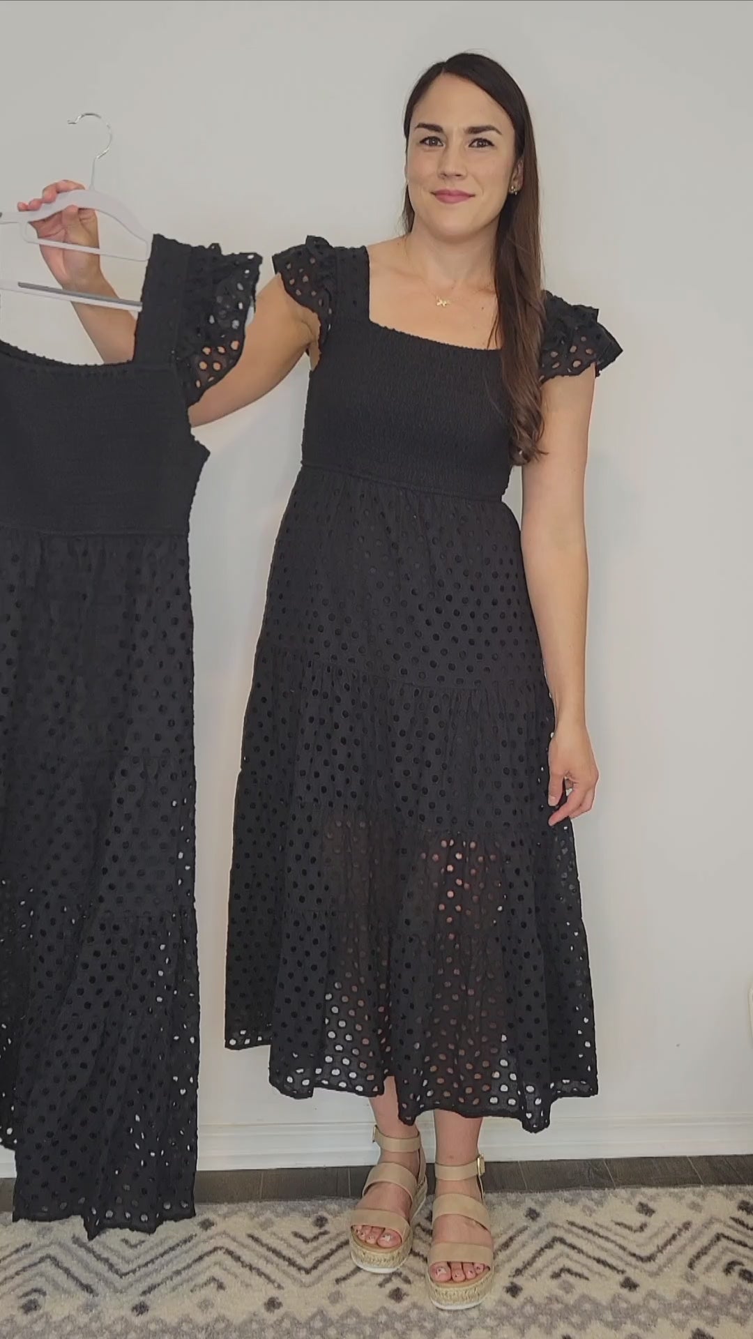 Details: This midi dress with pockets is gorgeous! We love the thick straps for wearing a regular bra and the flutter sleeves are so cute. Smocking along the bodice. The skirt flows and has sewn tiers. It is lined. The eyelet details are beautiful. Dress it up with heels or wear it with sandals.