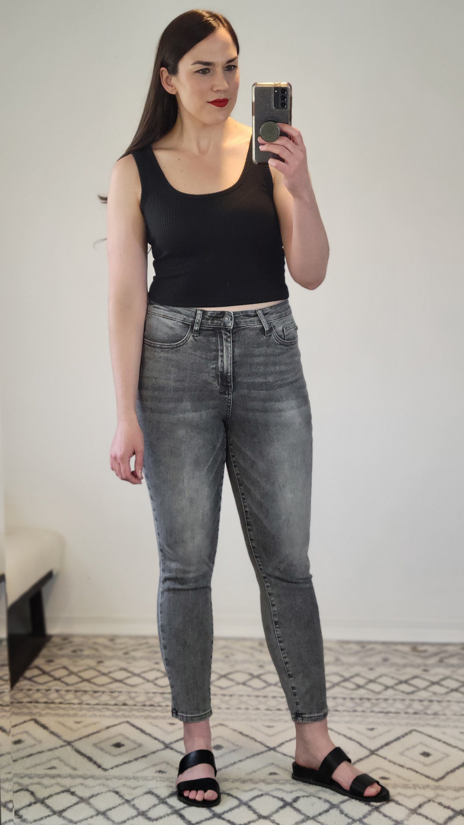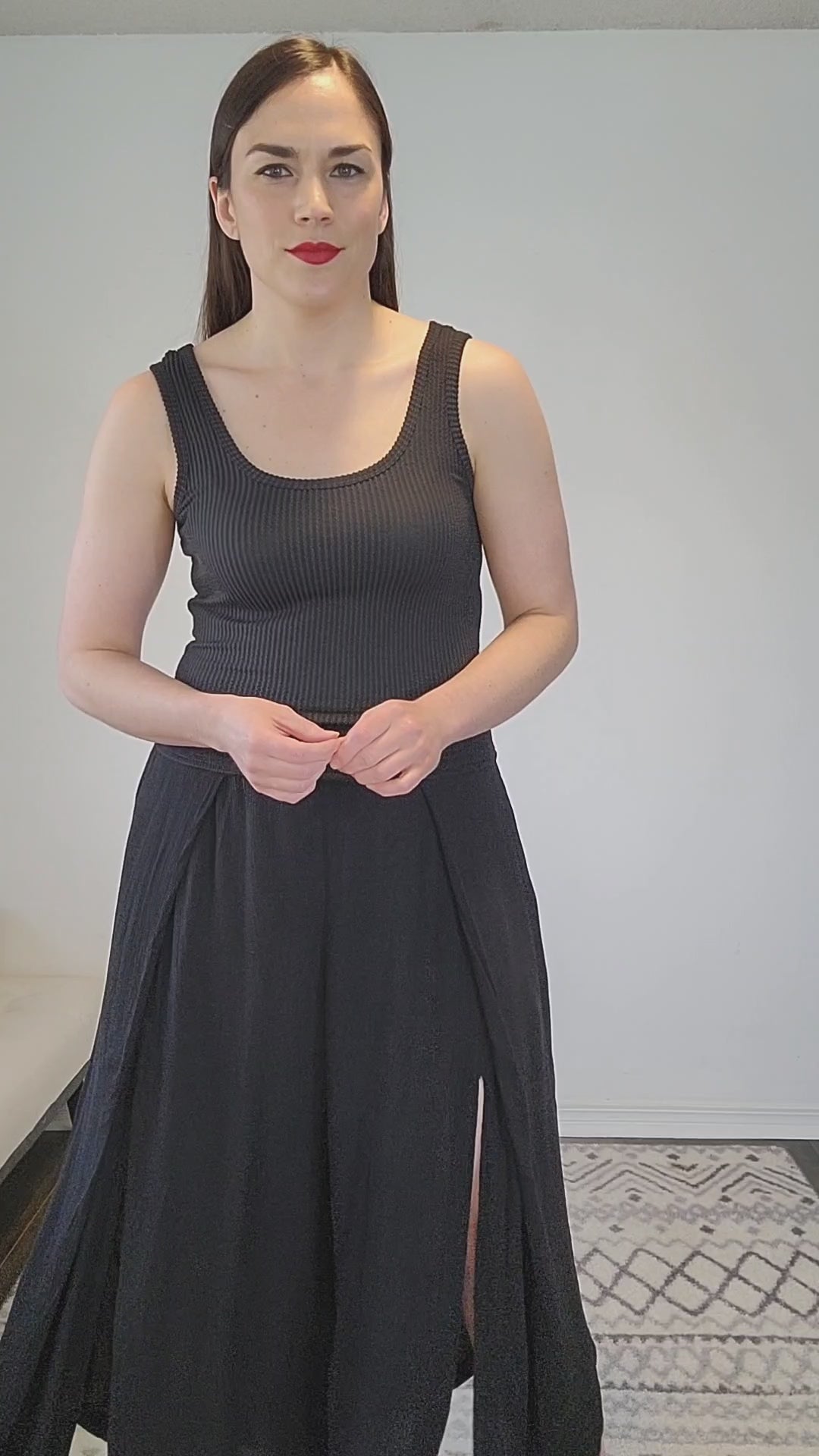 Details: You will love this two tone black and charcoal ribbed scoop neck tank top! Soft stretchy material and a good length for a crop top. So versatile! Pair with your favorite high waisted pants.