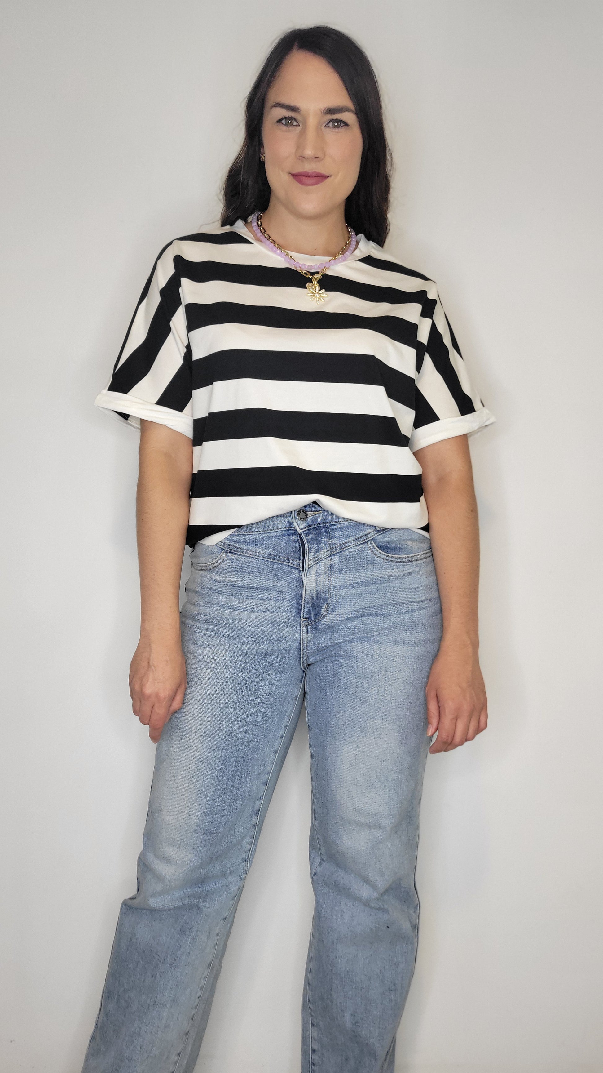 Black/ White Stripe Half Sleeve Drop Shoulder Top “Riley” (L)