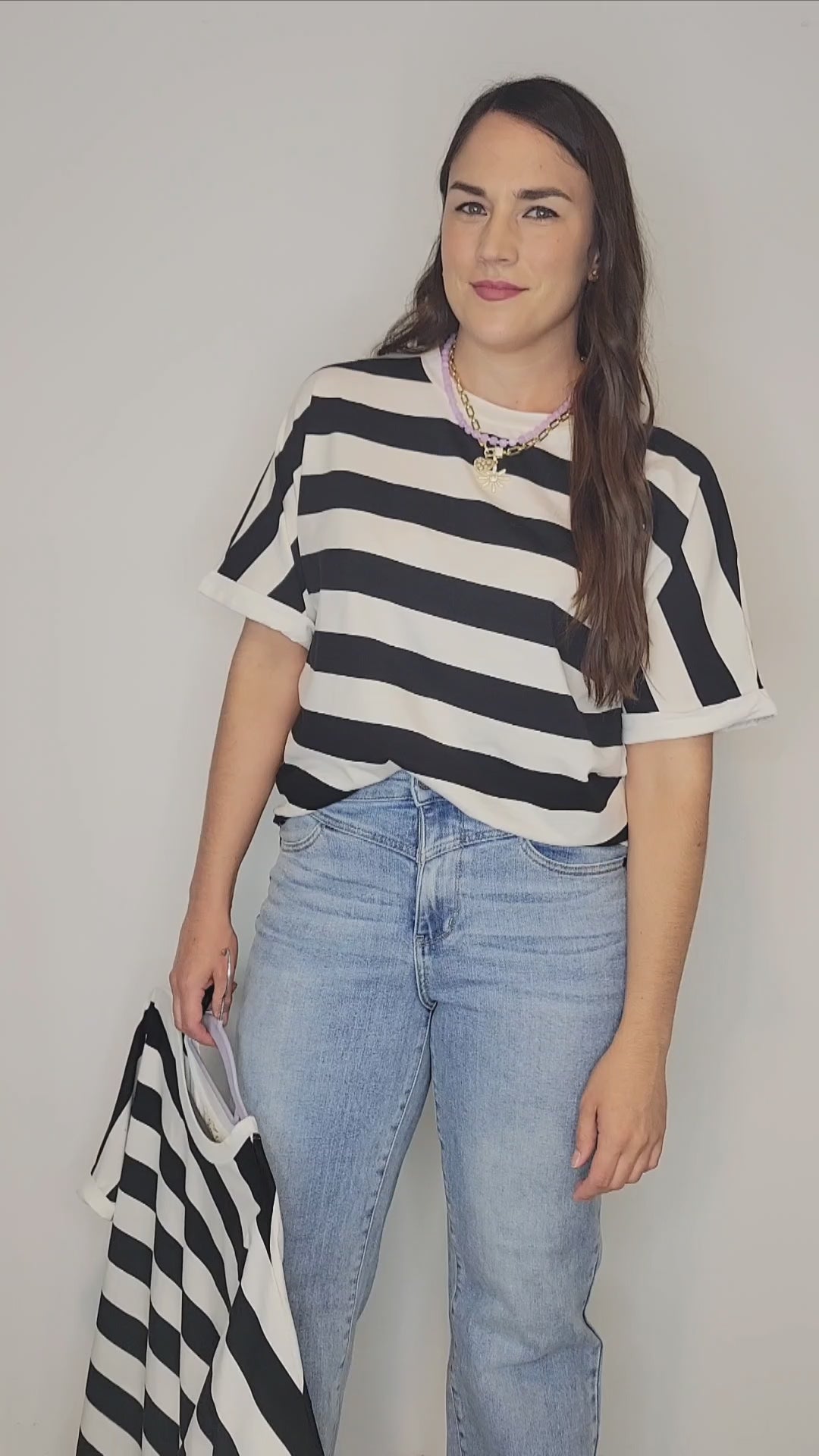 Details: You will love this new black and white stripe top! The drop shoulder and half sleeve that’s cuffed really gives the top a trendy modern look. It's regular bra friendly and a great length. It has a modest crew neckline. It’s a boxy flowy fit. Soft, comfortable, and quality material and not see through. Some stretch. This one is so versatile for mixing and matching!
