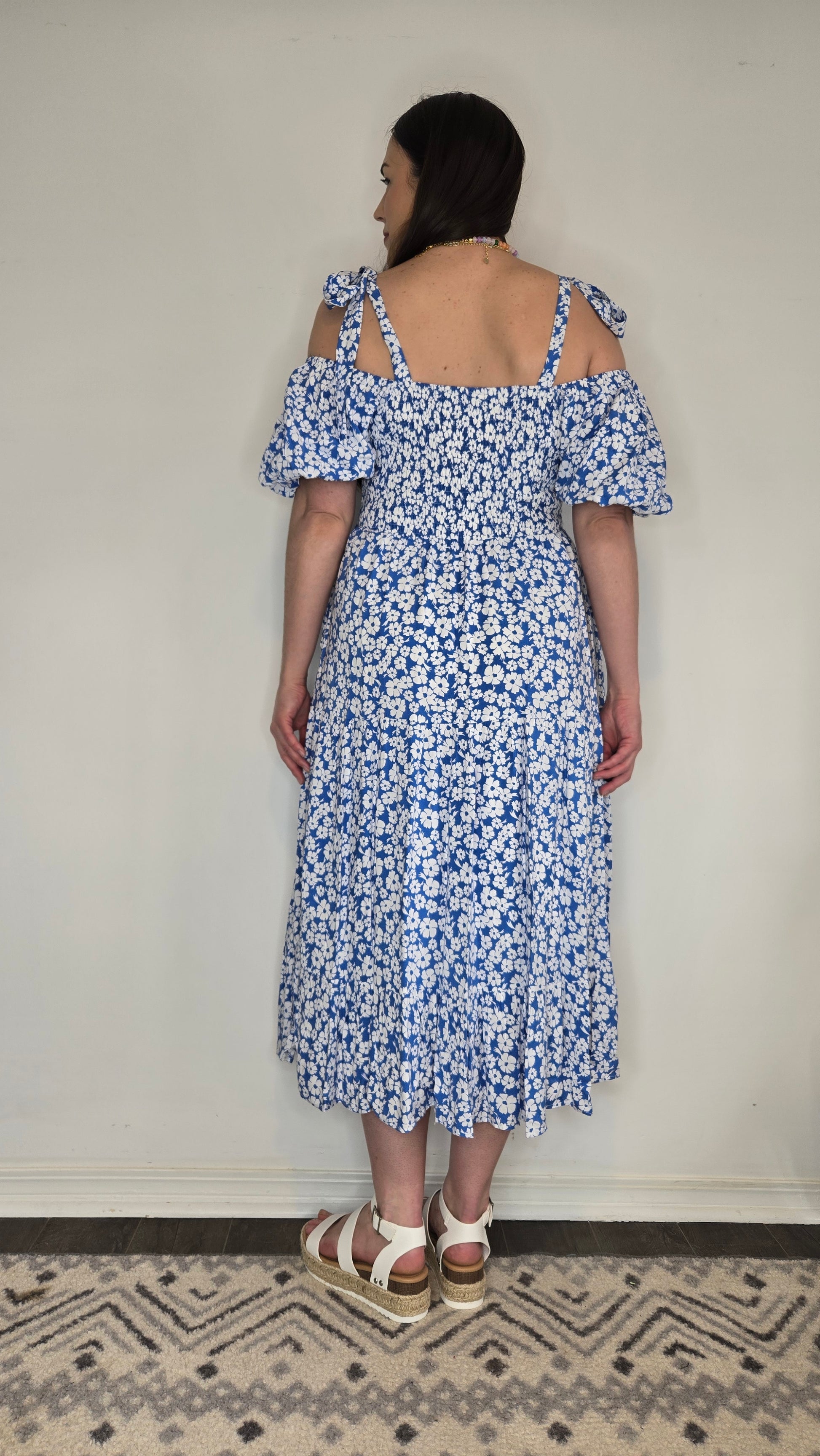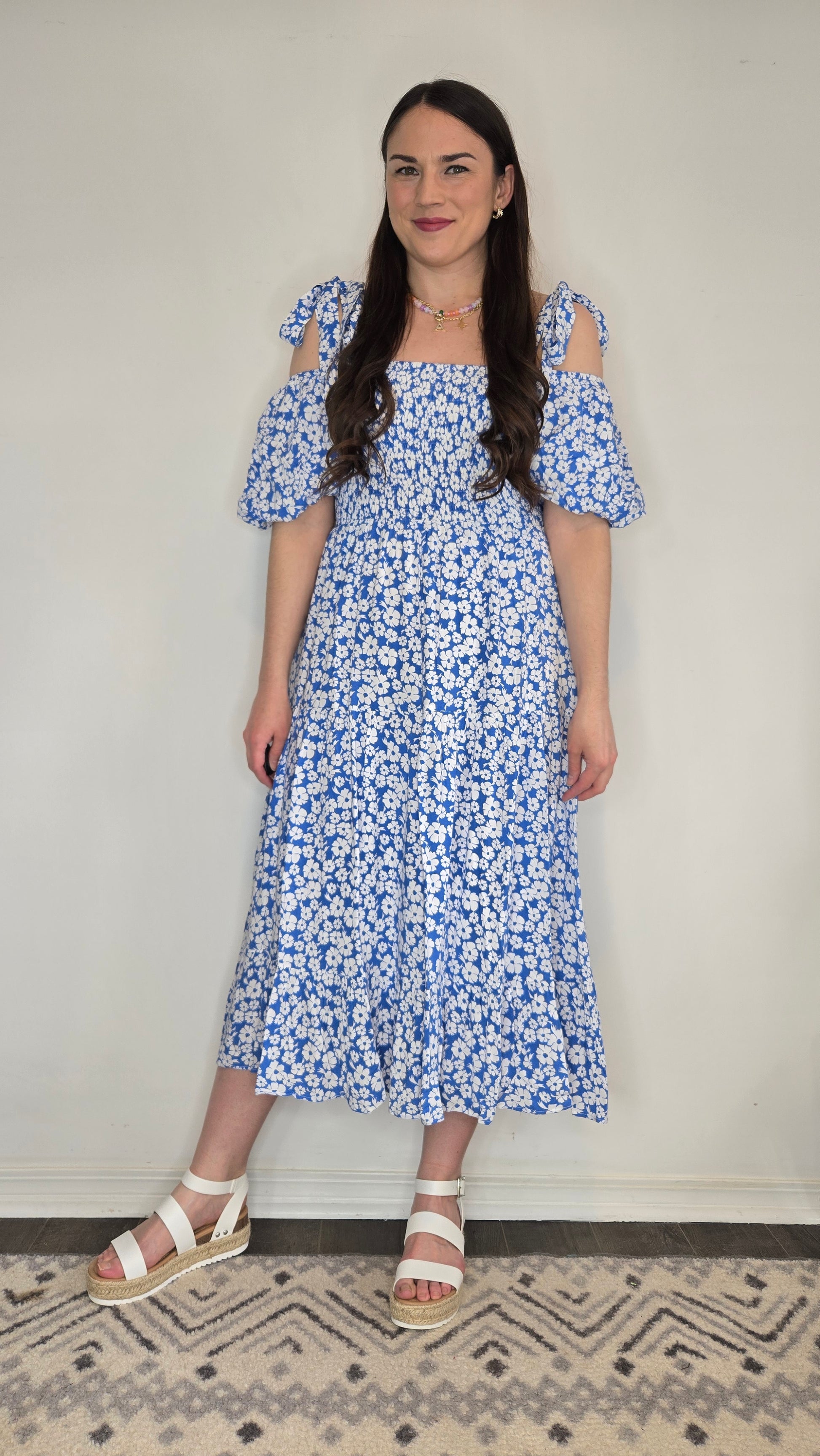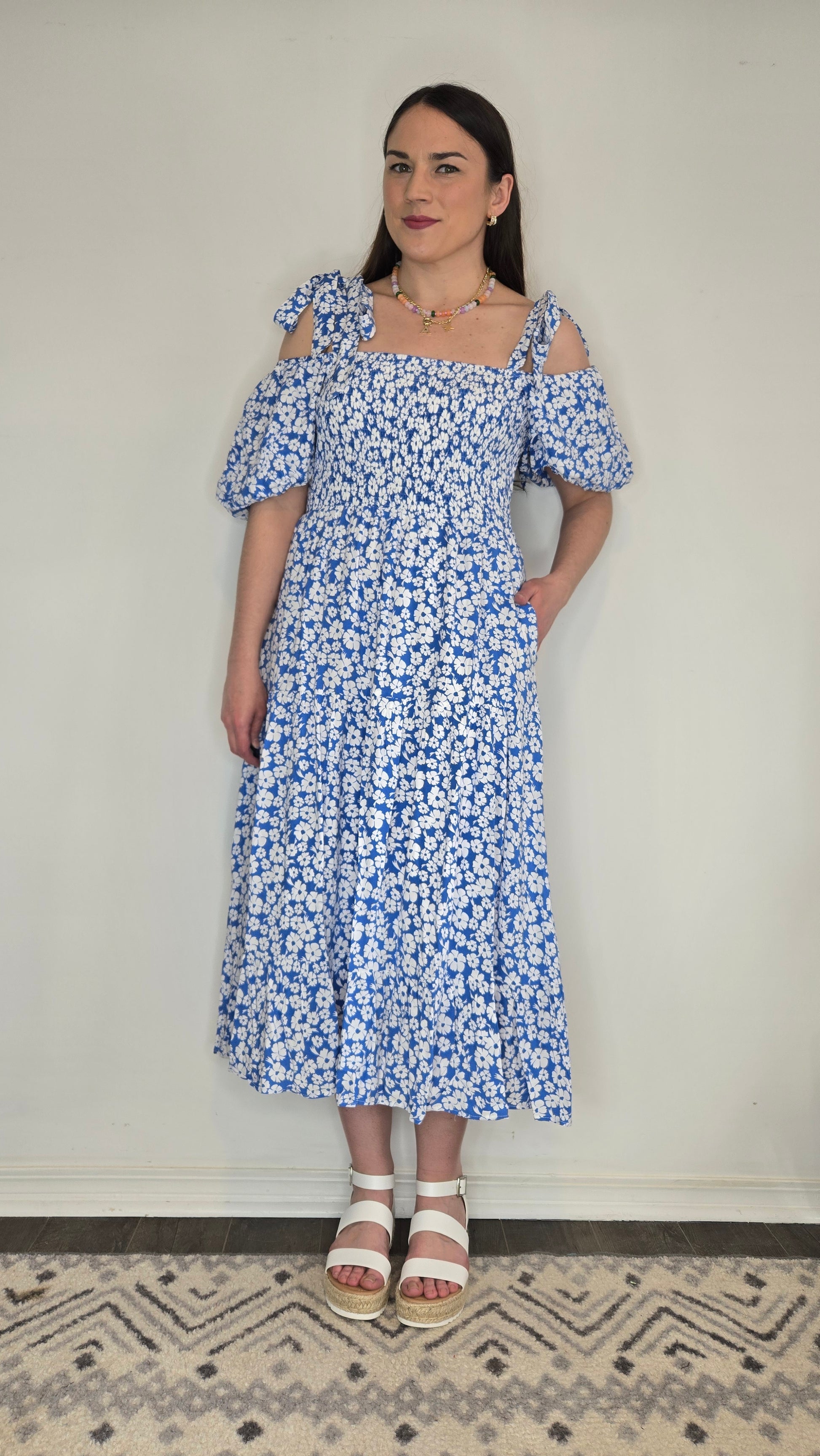 Effortlessly feminine and perfect for spring and summer, this blue floral midi dress is a must-have for your warm-weather wardrobe. Designed with a smocked bodice for a comfortable and flattering fit, it features delicate bow-tie straps that sit over the shoulder and the puff sleeves can be worn on or off the shoulder for a versatile look. The lightweight fabric is fully lined for coverage, and side pockets add a practical touch. The flowy midi-length skirt makes it ideal for Easter, bridal showers, or a casual day out. Whether paired with sandals for a relaxed feel or dressed up with heels, this floral-print dress is perfect for embracing the season in style.