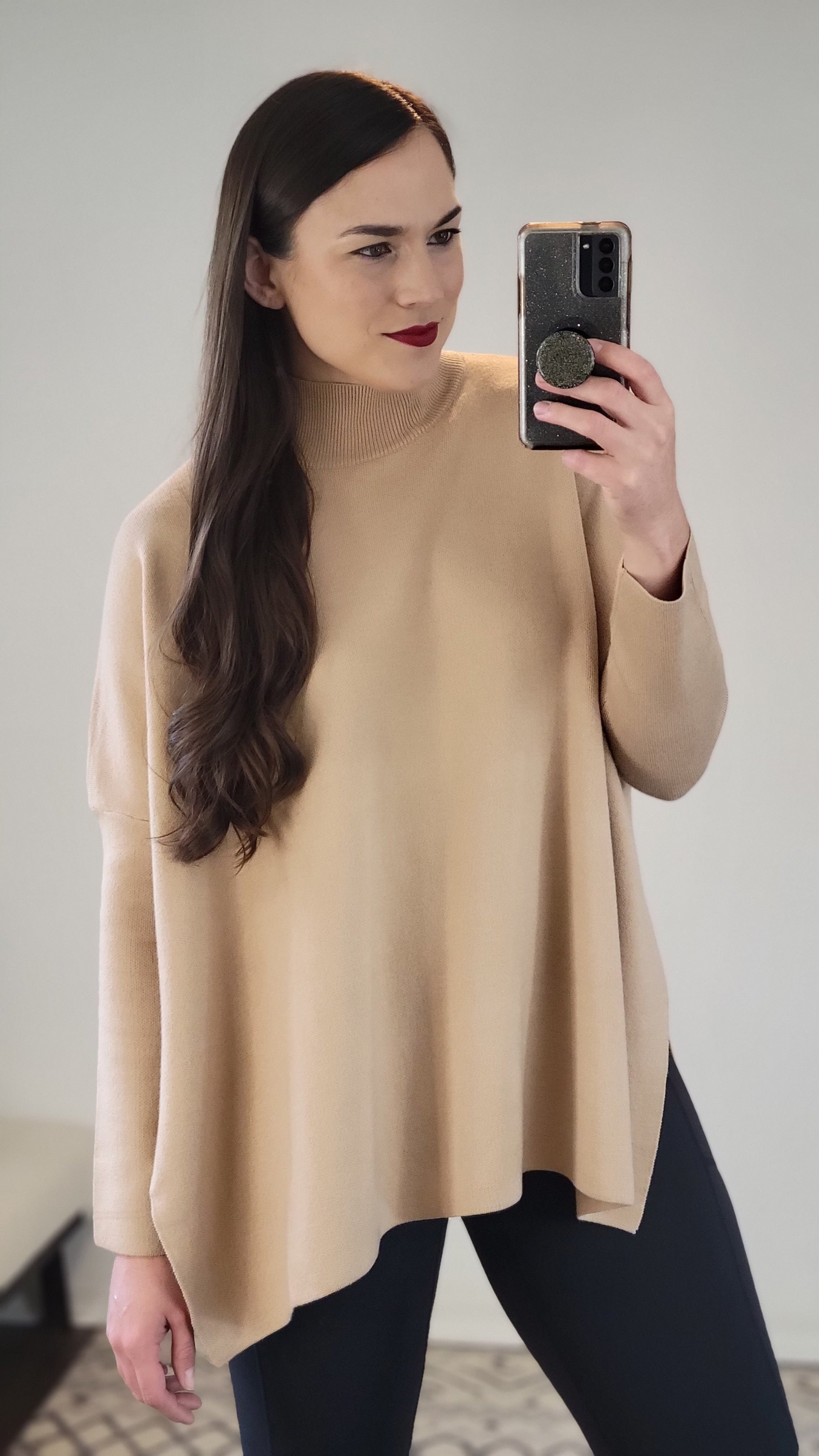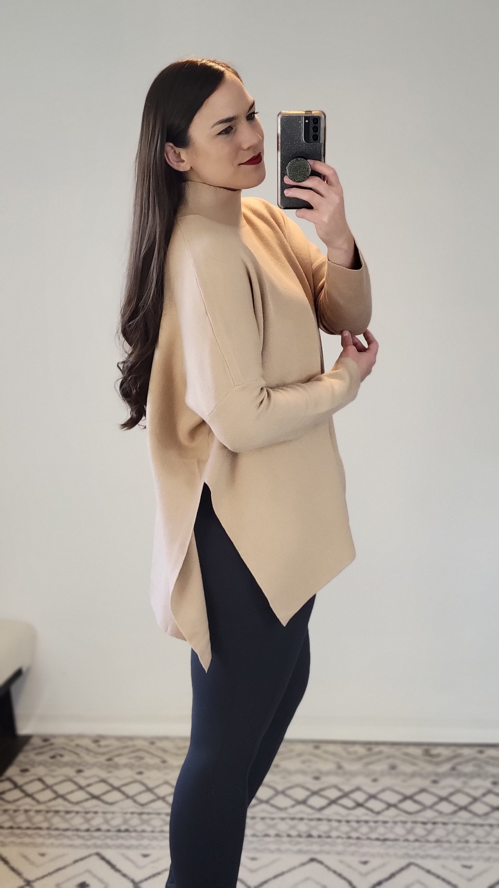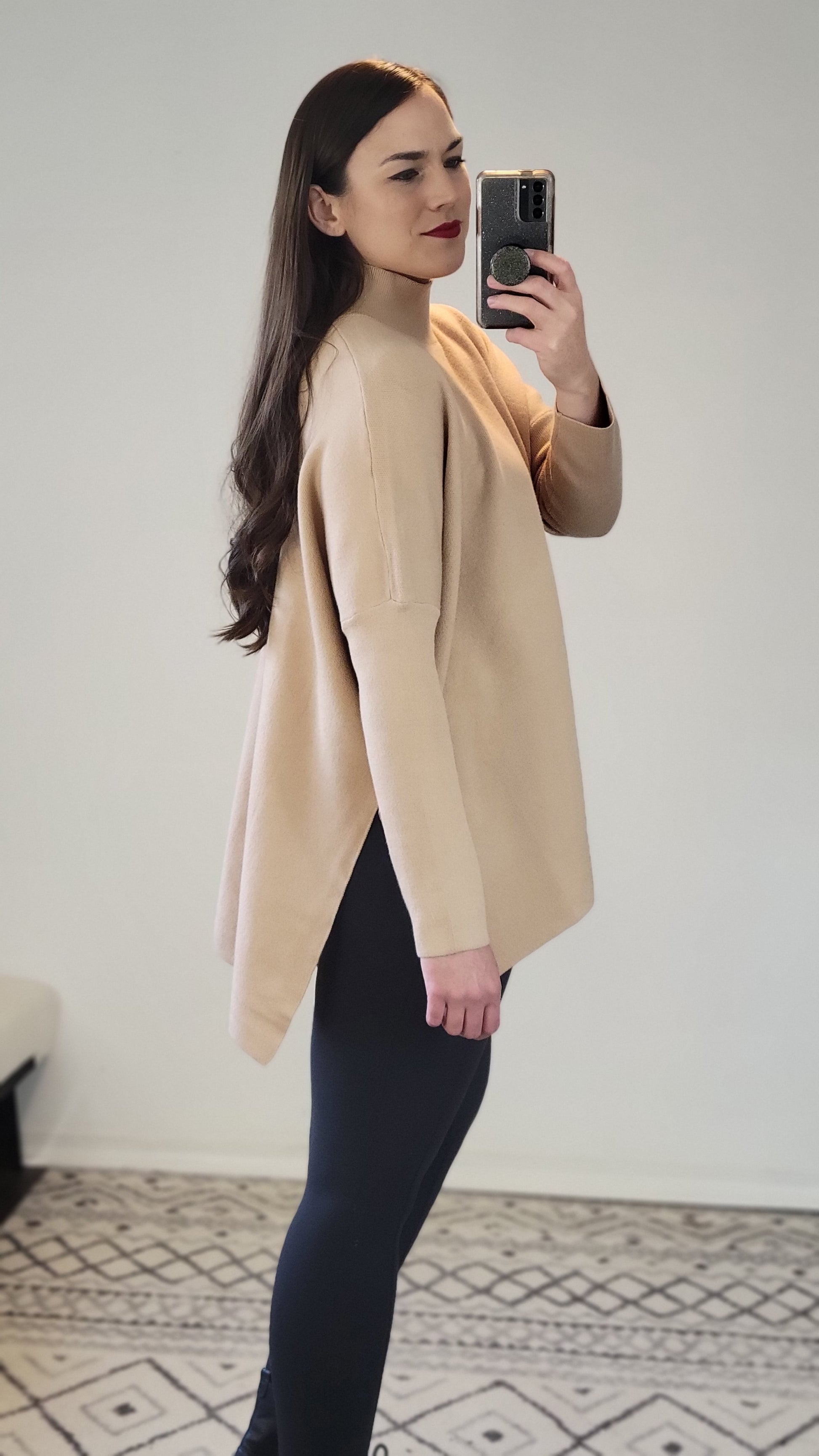 Details: It feels like you are wearing a super soft lightweight blanket! The ribbed detailing on the mock neck is a comfortable fit. We are loving the flowy slits on the sides! Pair it with leggings and sneakers, or dress it up with some black Judy Blues and cute boots! This will be a go to sweater! The neutral color is perfect! Â