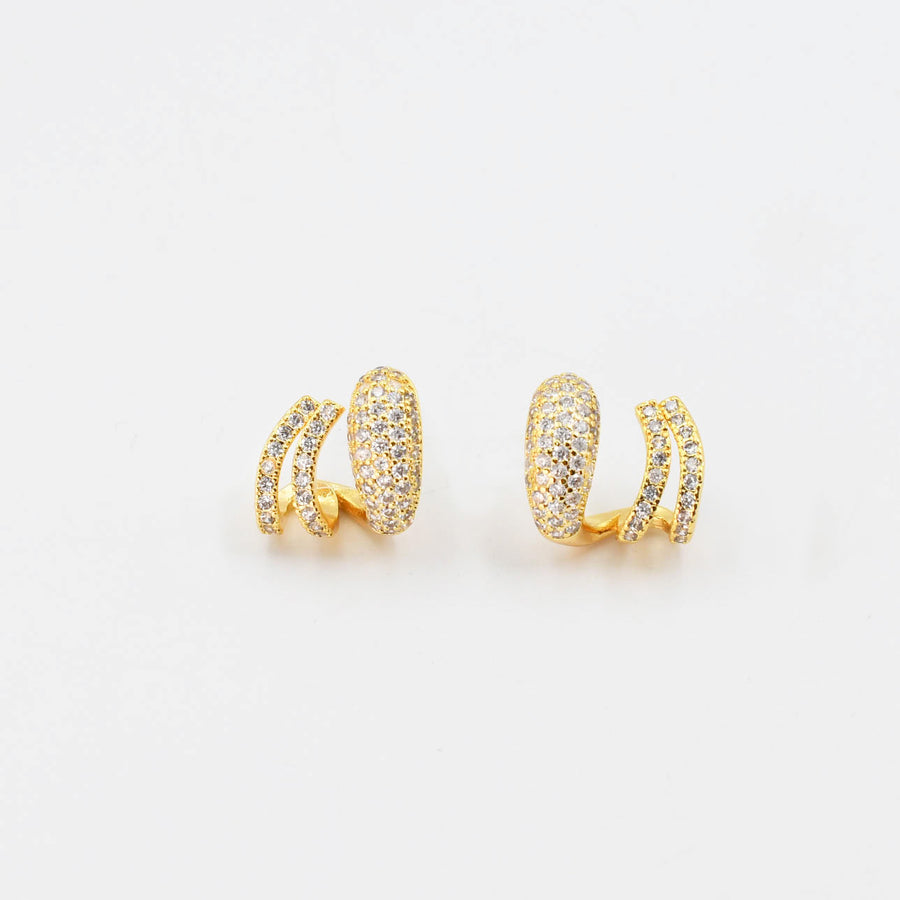 Add a touch of glamour to your look with these dazzling gold-plated crystal earrings. Featuring a unique triple-band design encrusted with shimmering crystals, these earrings are perfect for making a statement at any occasion. Lightweight and elegant, they seamlessly combine luxury with everyday wearability. Whether you're dressing up for a wedding, a night out, or simply elevating your everyday style, these earrings are sure to turn heads.Â