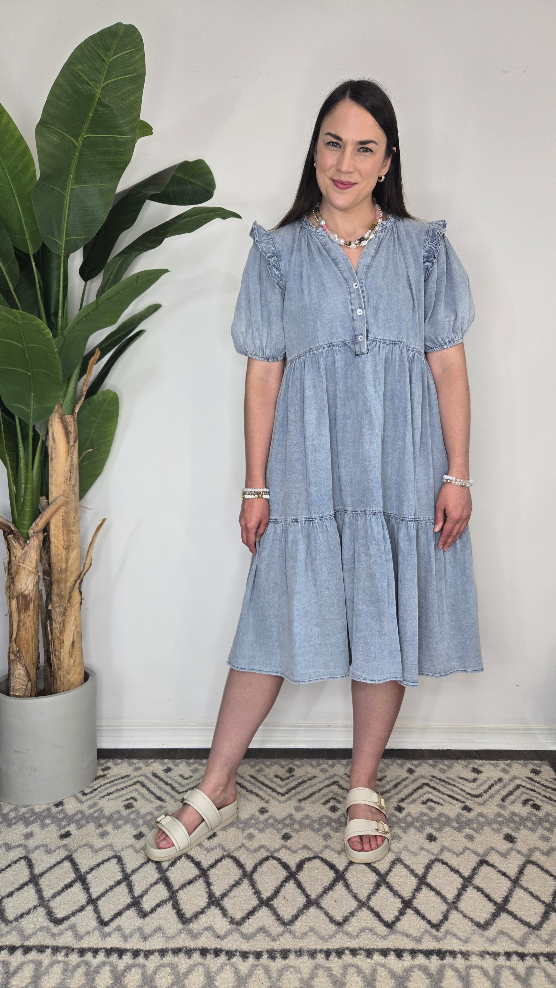 Description: Easy, breezy, and full of charm—this chambray midi dress is made for warm days and casual moments. It features a soft, lightweight 100% cotton fabric, a tiered silhouette, and delicate frill details along the shoulders and neckline. The short peasant sleeves and button-up slit neck give it just the right amount of vintage flair, and yes—it has nice practical deep pockets. Pair it with sneakers or sandals and wear it everywhere from the farmers market to brunch with friends.