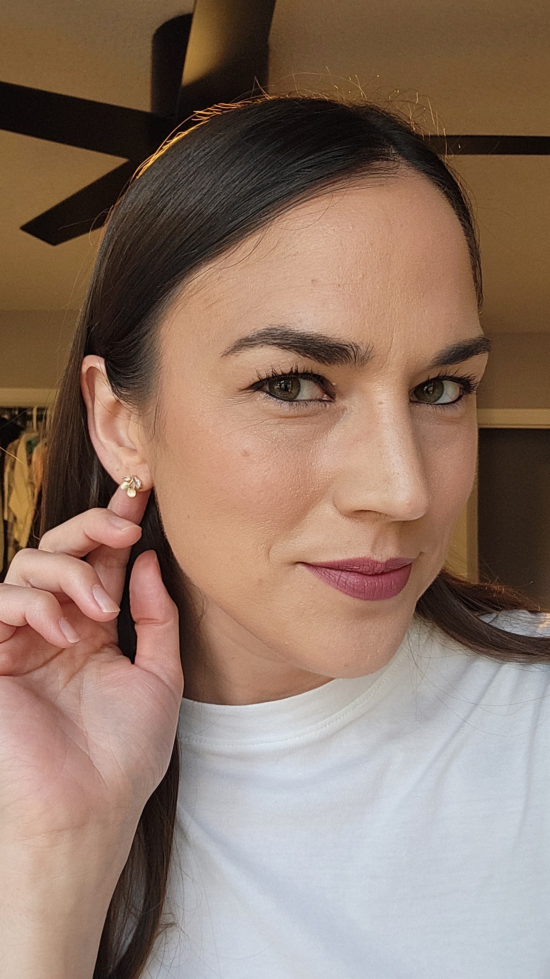 This adorable earring set features three pairs of gold-plated studs, perfect for adding a cute and subtle sparkle to any look. The set includes delicate bow-shaped studs with clear stones, charming cherry-shaped studs with smooth gold accents, and classic crystal-like studs for a timeless touch. These earrings are ideal for mixing and matching, making them a versatile addition to your jewelry collection. Whether you're dressing up or keeping it casual, this set adds a playful and elegant flair to any outfit