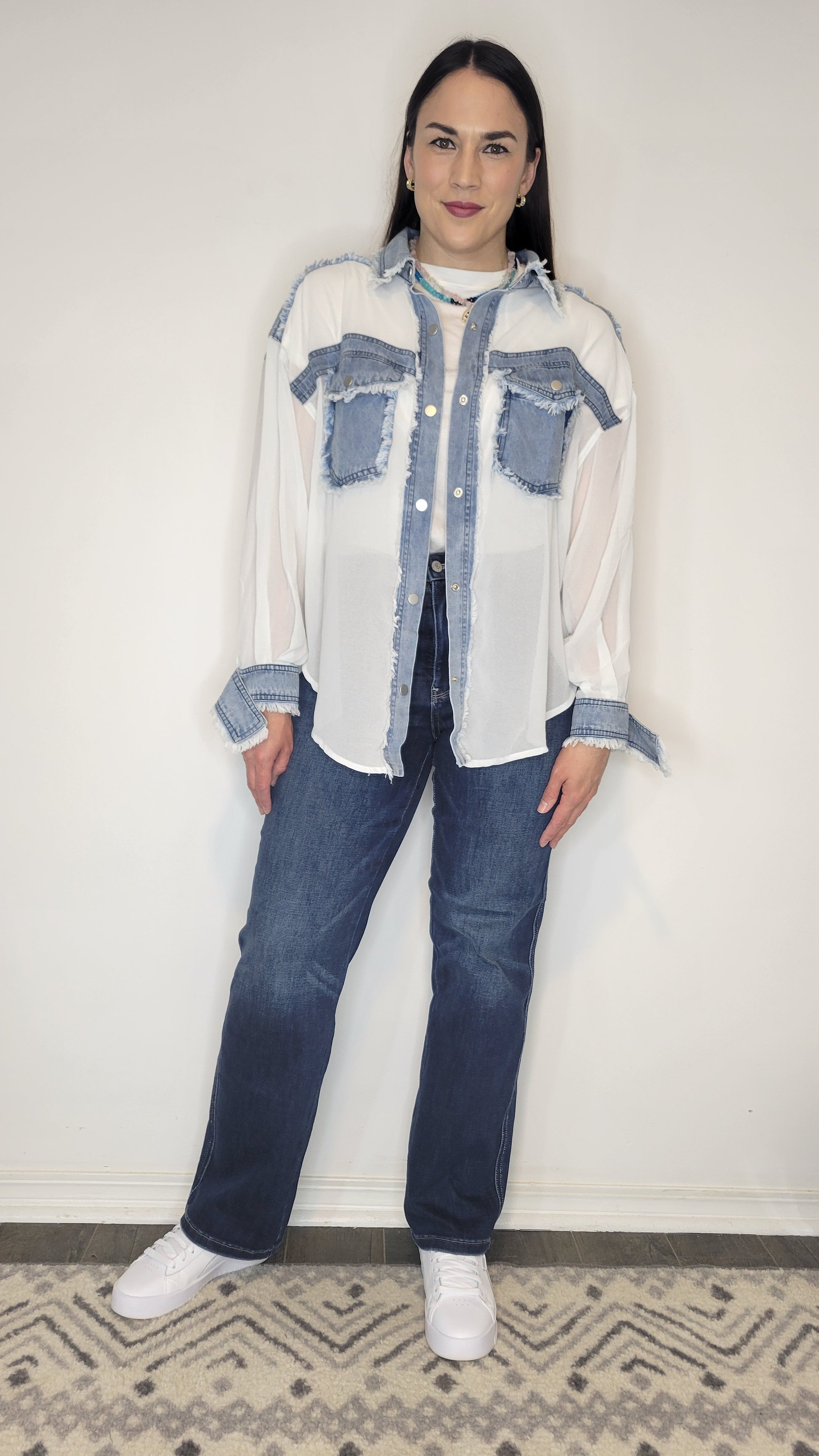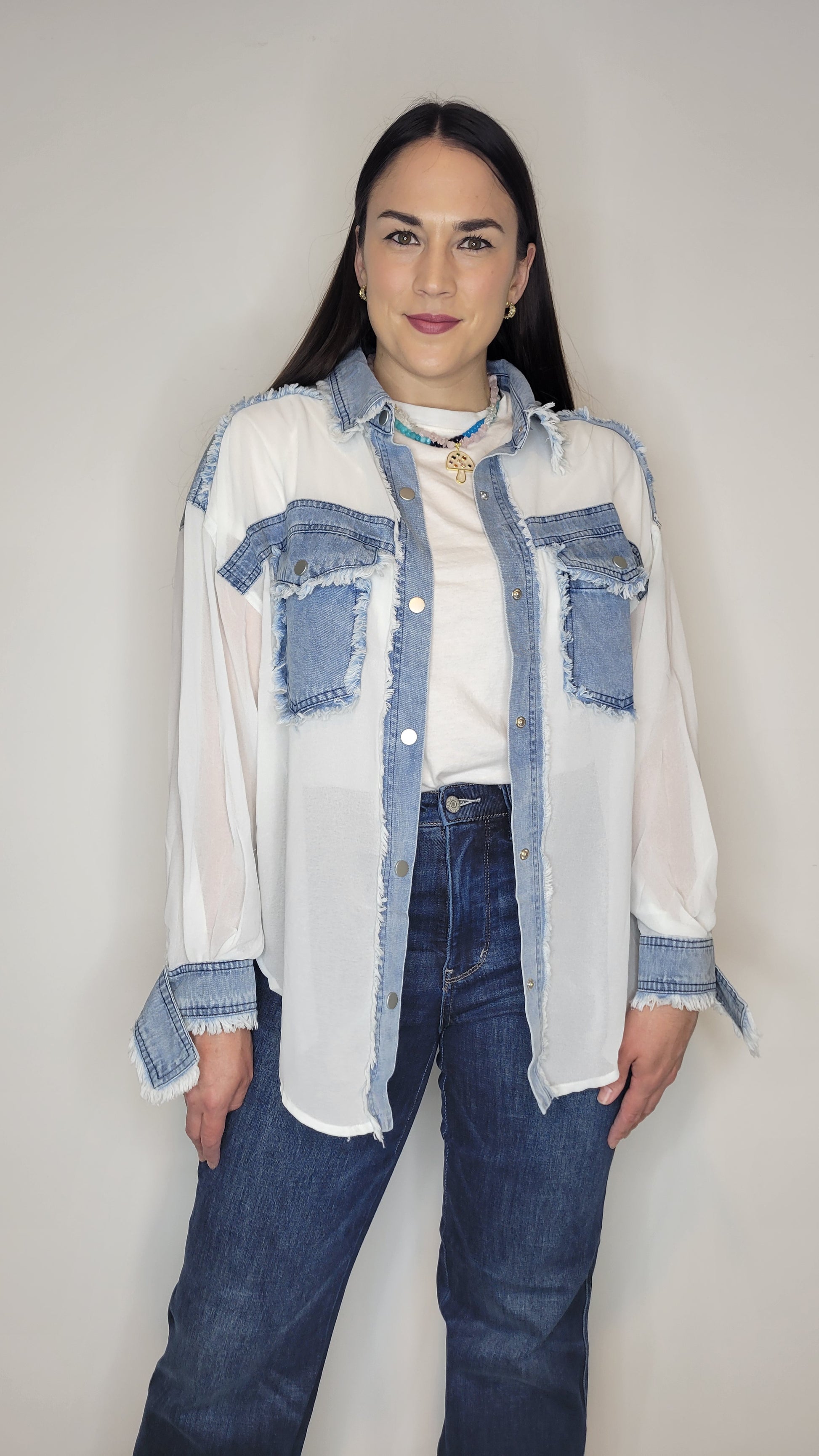 Details: This stylish denim-trim shacket blends a relaxed fit with a chic, versatile design. The shacket features a soft, sheer body with contrast denim accents on the chest pockets, button-up front, and cuffs, giving it a cool, layered look. The raw edge detailing on the denim adds a trendy, distressed vibe that’s perfect for casual, everyday wear or layering over tees for a relaxed, yet polished, appearance. Pair this shacket with your favorite jeans and sneakers for an effortless, fashion-forward look.