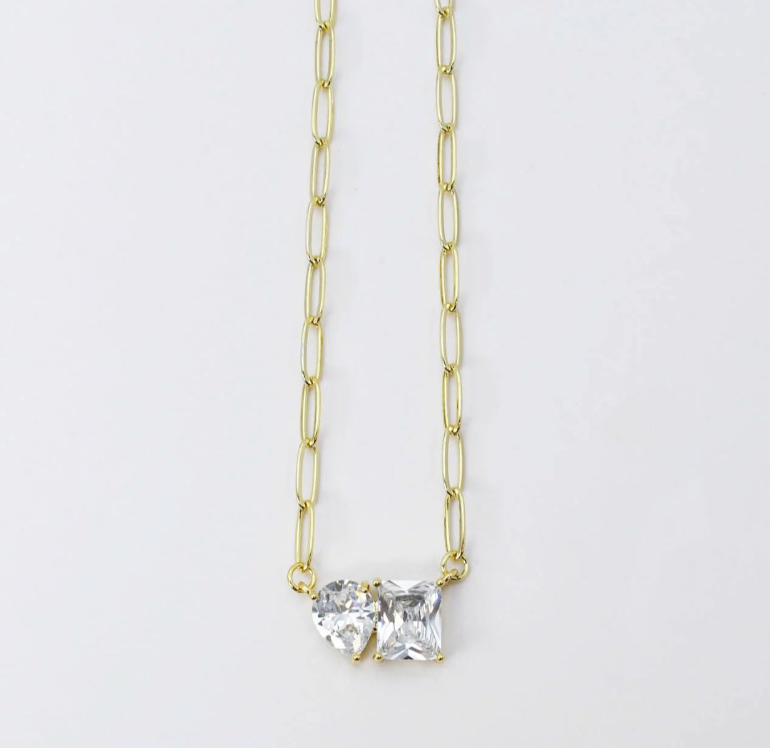 This elegant gold-plated necklace features a stunning duo of crystals—one pear-cut and one emerald-cut—nestled side by side for a look that’s both romantic and refined. The delicate paperclip chain adds a modern touch while keeping the design lightweight and easy to layer. Whether worn alone or styled with other pieces, this necklace brings a timeless sparkle to any outfit.