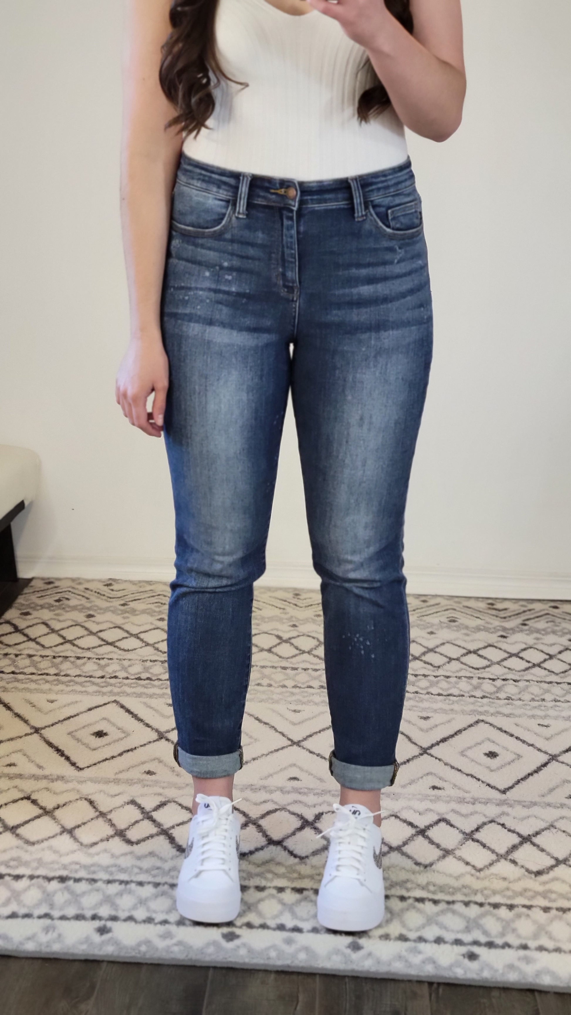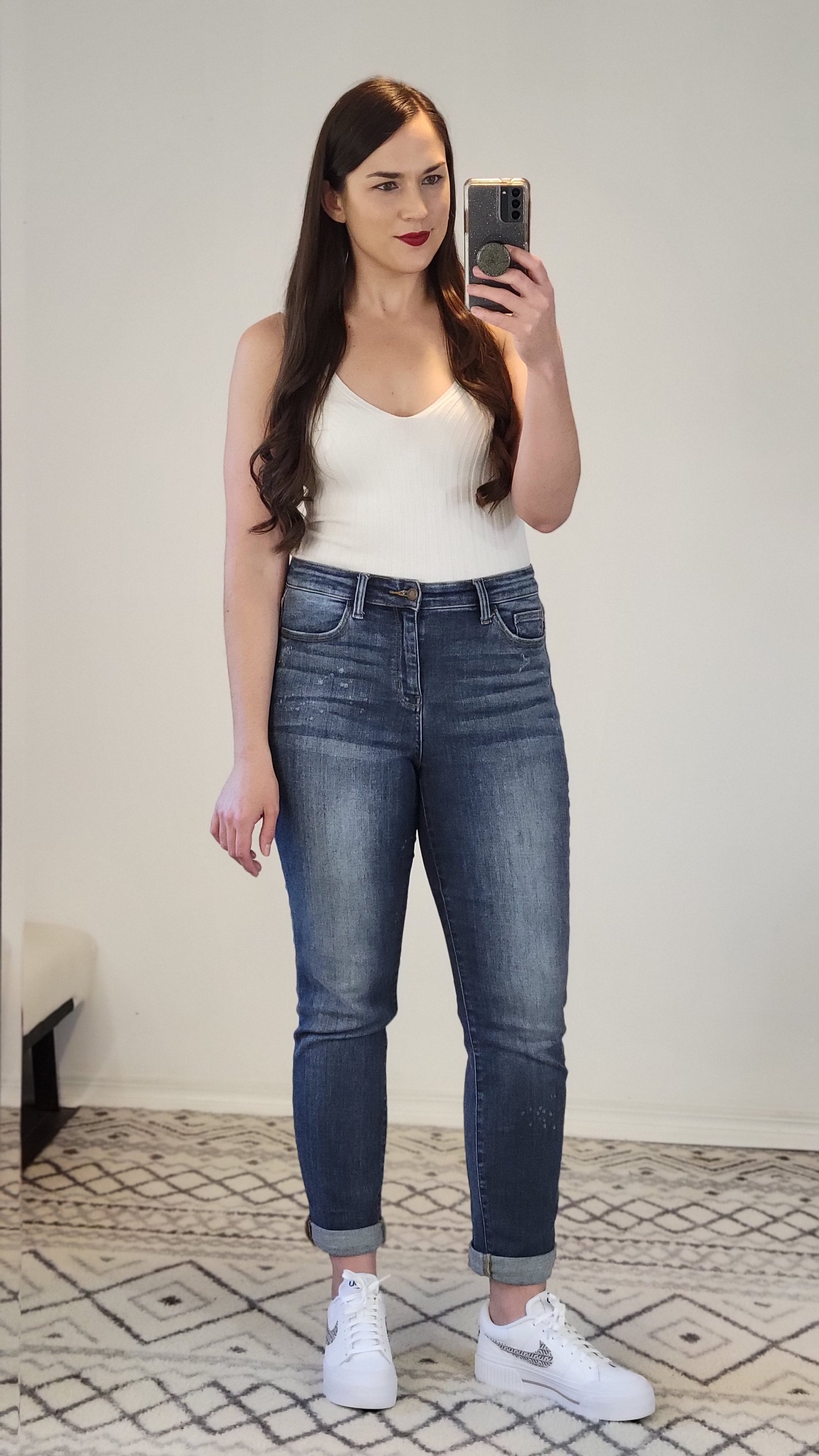 Sizing Tip: I am about 5’7 165 pounds, and I am generally a Size 9/29 in Judy Blue Jeans. In the Boyfriend Jeans I can size down one to the 7/28 though. You can size down one from your normal Judy Blue Skinny Size, but you don't have to. (I am a size 11/29 in KanCans).
