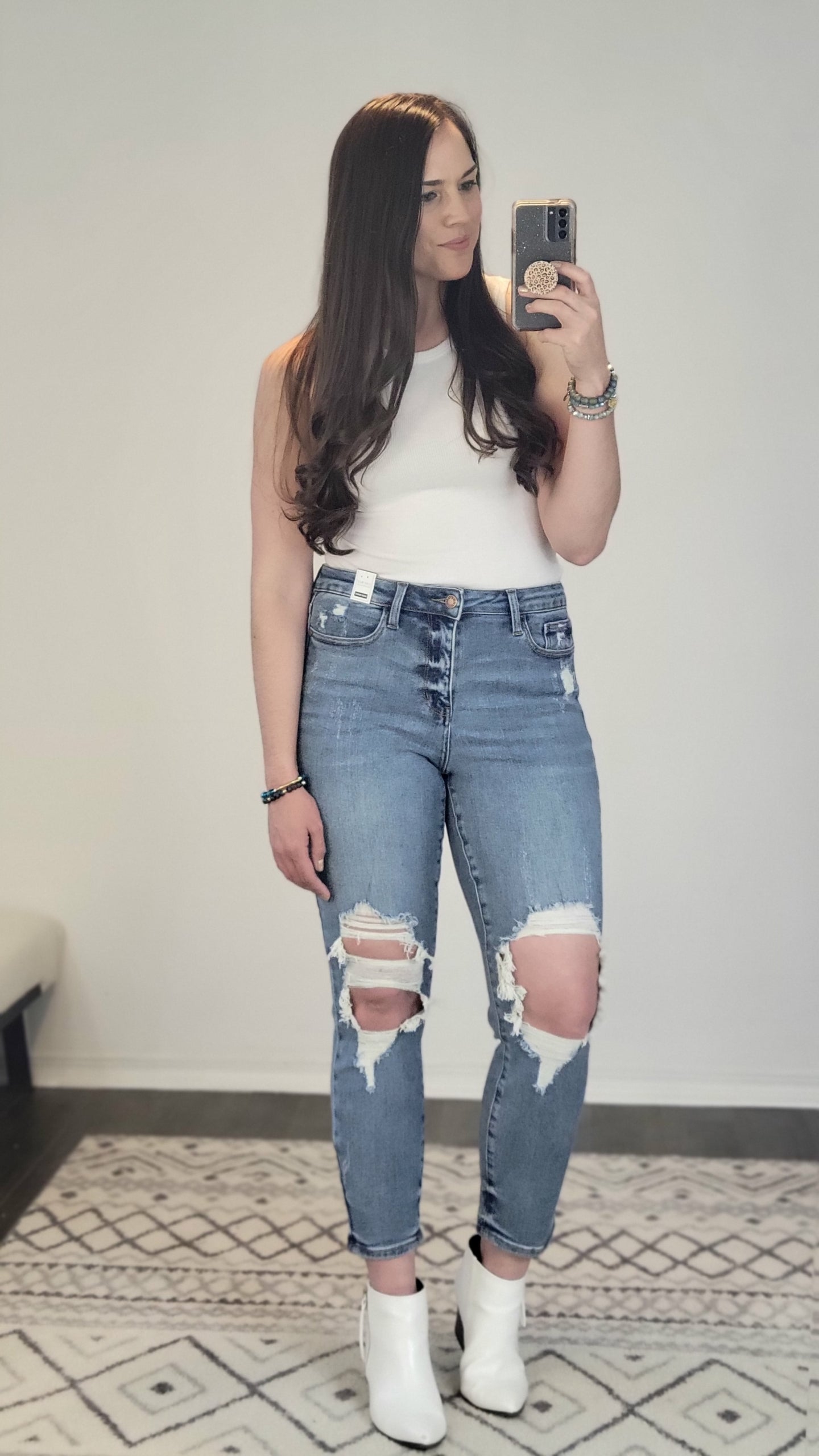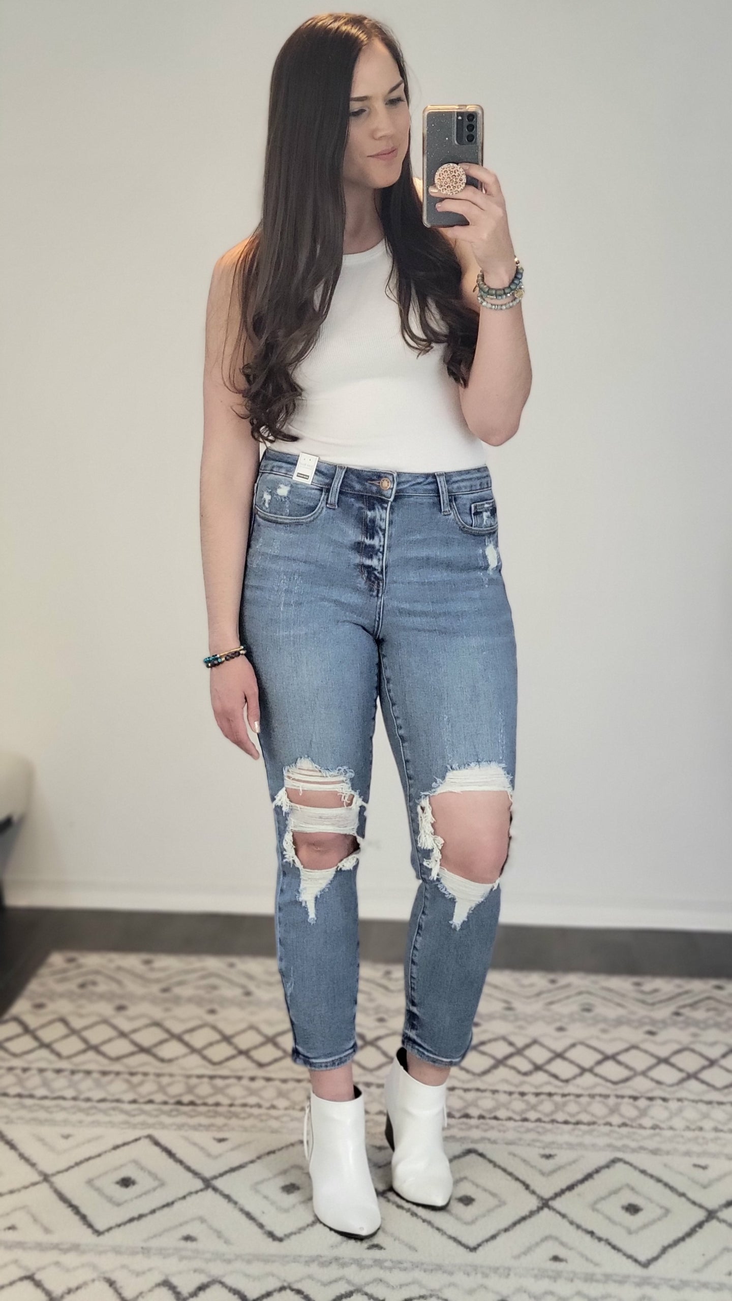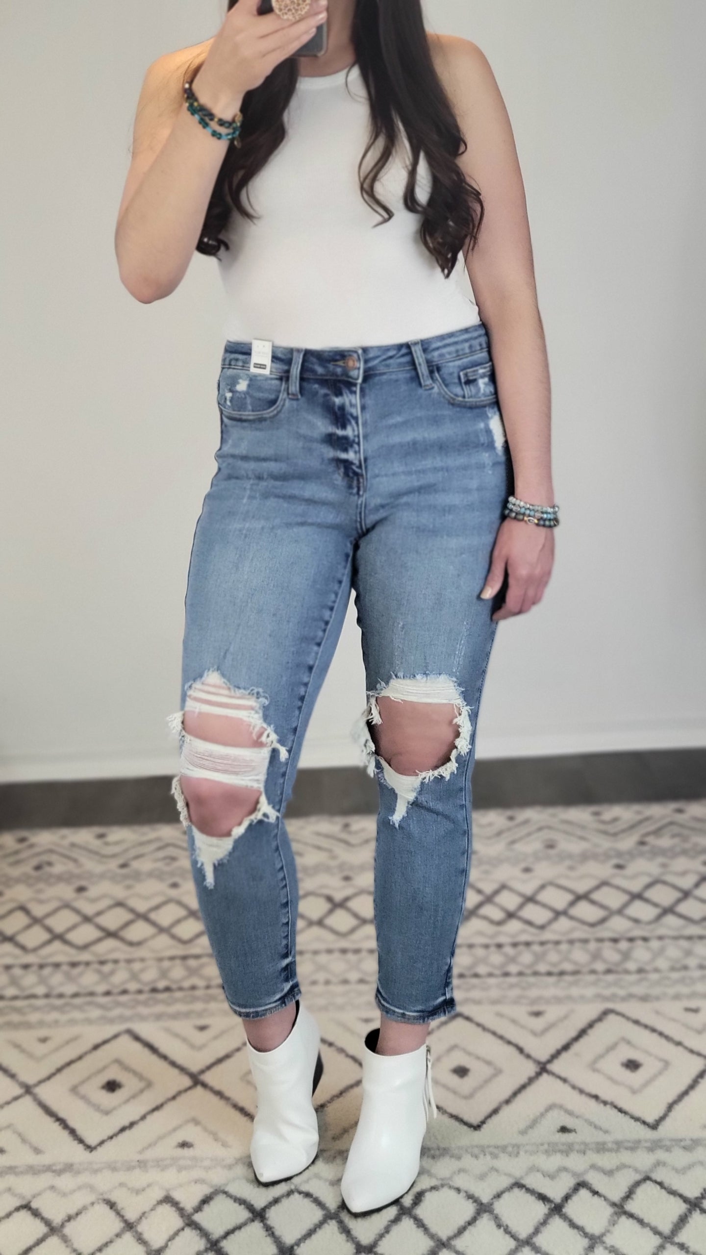 Sizing Tip: Can size down from your Judy Blue true size since this pair is a “boyfriend” fit. Their boyfriend fit seems to be a little more roomy in the waist. I am about 5’7 165 pounds, and I am generally a Size 9/29 in Judy Blue Jeans. I sized down to the 7/28. (I am a size 11/29 in KanCans).