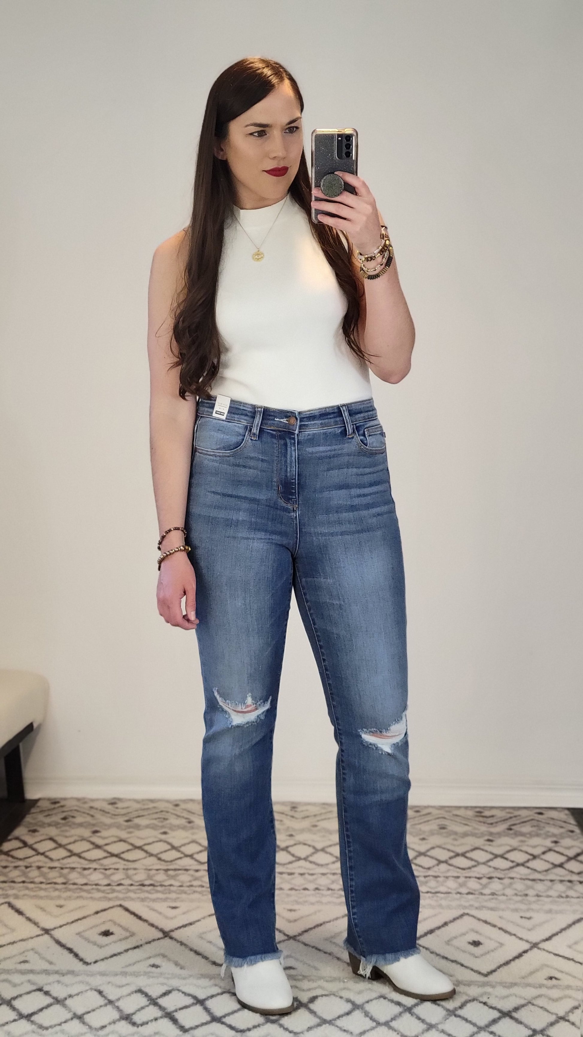 Sizing Tip: I am about 5’7 165 pounds and a 34B, and I am generally a Size 9(29) in Judy Blue Skinny Jeans and that is what I am wearing for this straight leg. I have a little room in the waist. Can size down if inbetween. (I am a size 11/29 in Kancans.) The raw edge makes them easy to hem.