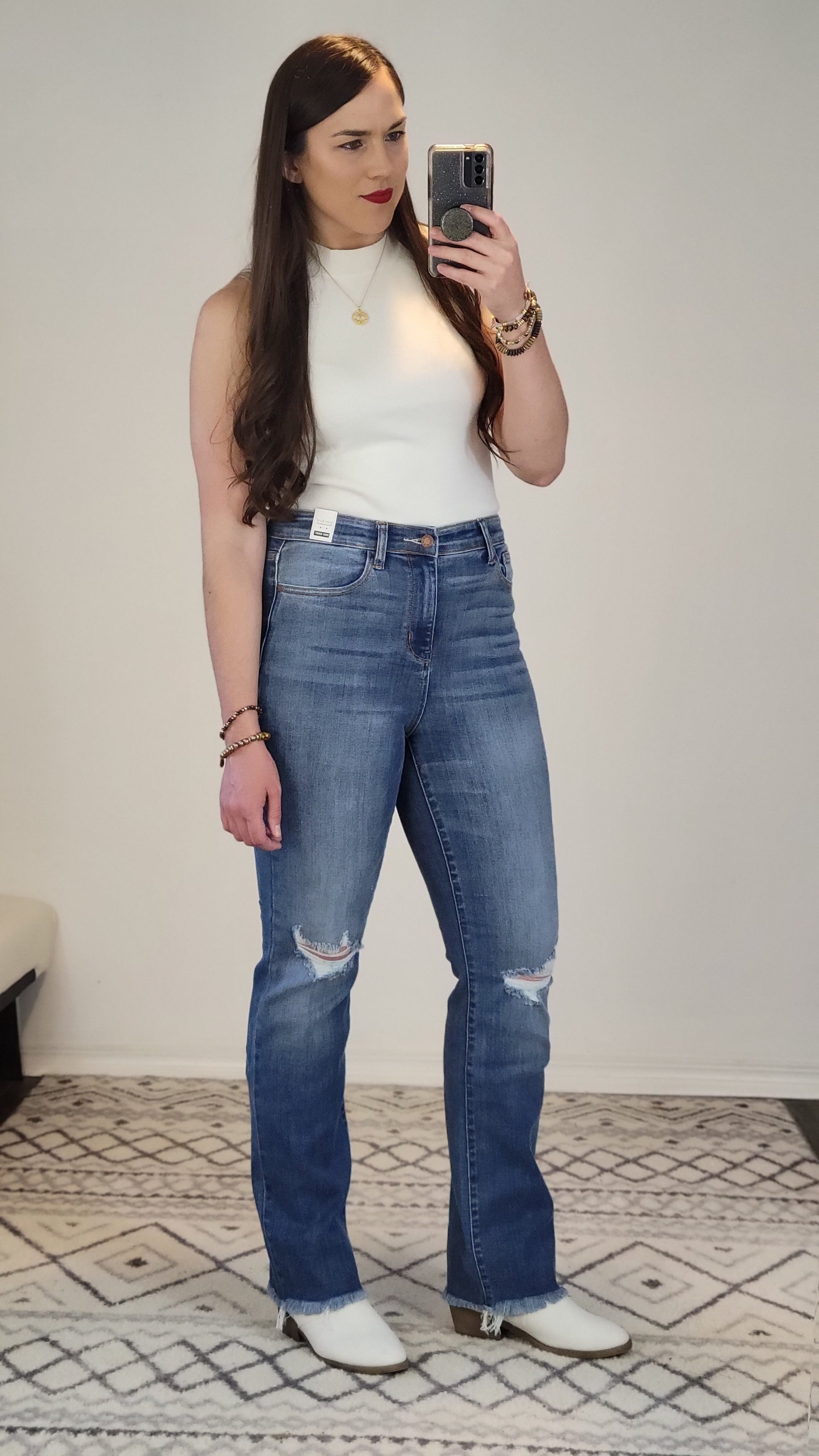 Details: Must Have Judy Blues Denim! Amazing Stretch and Soft Quality Comfort! Destroyed Knees. Fray Hem. Contouring. Whisker Detailing. 10.75” High Rise and 32.5” Inseam.