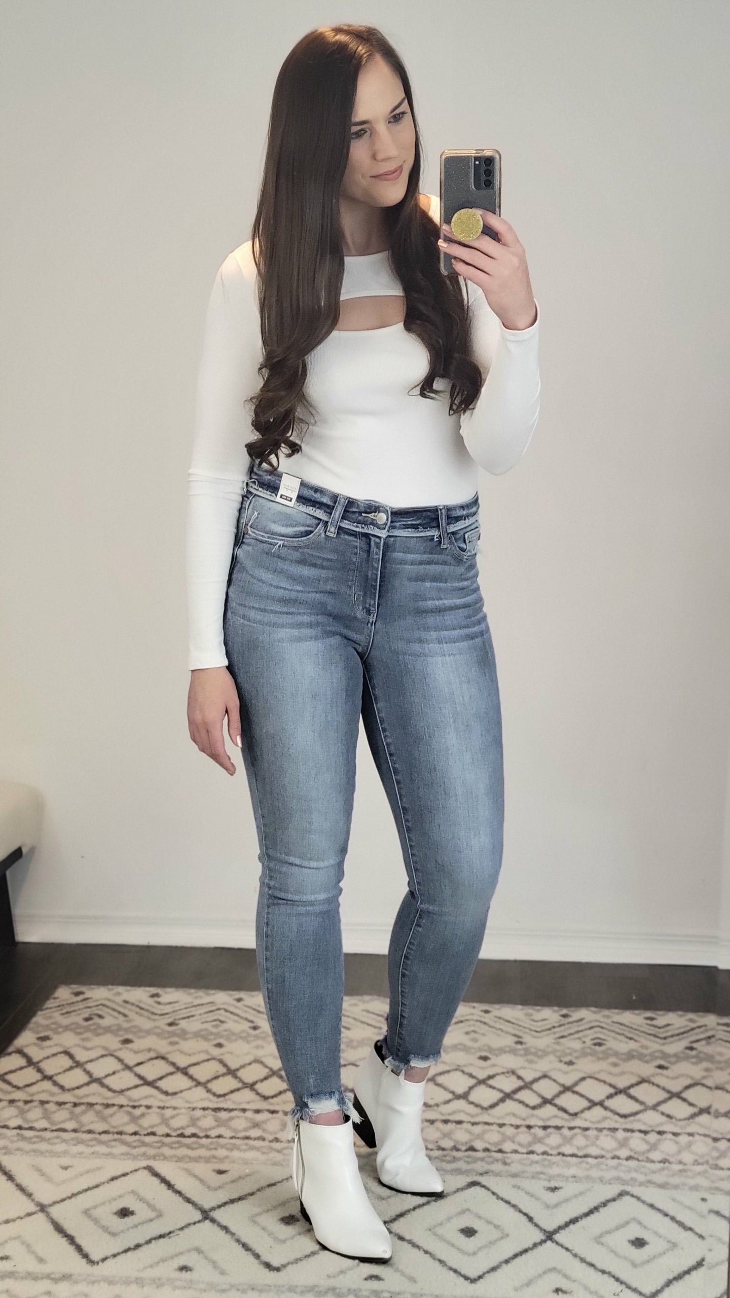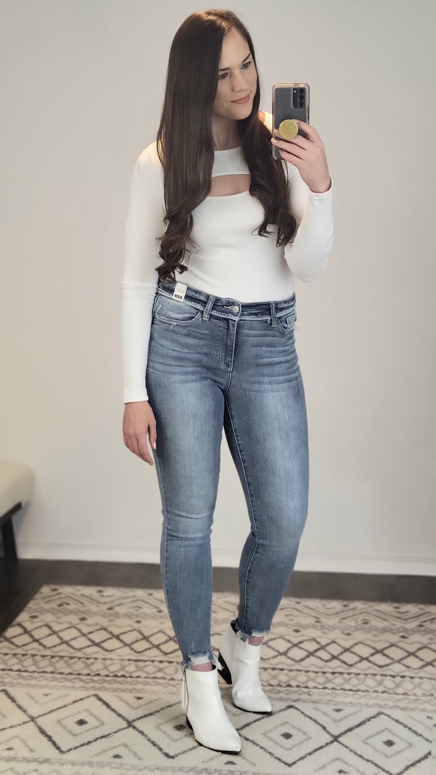 Sizing Tip: Fit True to Size for Judy Blue Skinny. I am about 5’7 165 pounds, and I am generally a Size 9/29 in Judy Blue Jeans, and that’s what I am wearing! (I am a size 11/29 in KanCans). Size down one from a department store size.