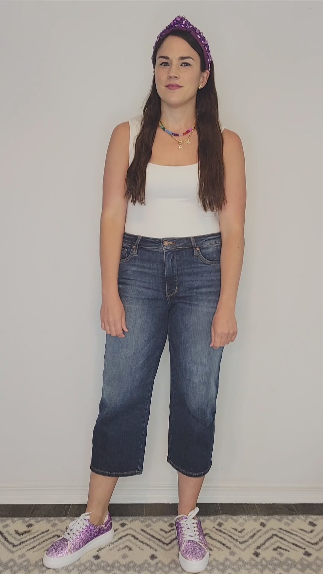 Details: You are going to love these trendy Judy Blue jeans! These dark wash cropped wide leg jeans are so soft, stretchy, and comfortable. Loving the whisker detailing, slimming contouring, and no destruction or holes. 10” Mid Rise and 24” Inseam.