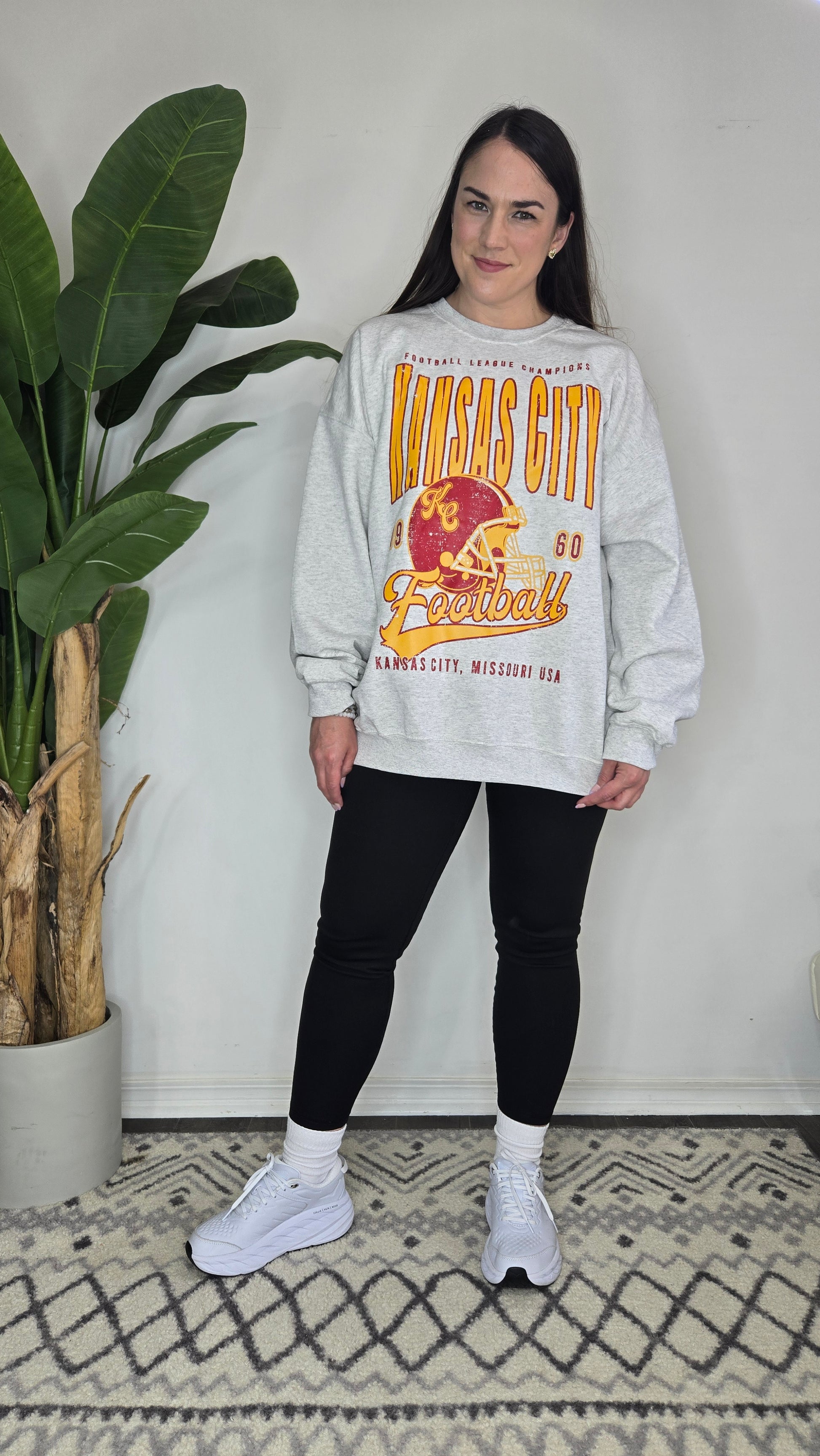 Description: Show your pride in cozy style with our Oversize Kansas City Football Sweatshirt. This soft, heather gray crewneck features a bold vintage-inspired graphic with classic red and gold accents that celebrate Kansas City spirit. The relaxed fit makes it perfect for game days, lounging, or layering up for cooler weather. Pair it with leggings, jeans, or joggers for the ultimate laid-back look while cheering on the Chiefs!