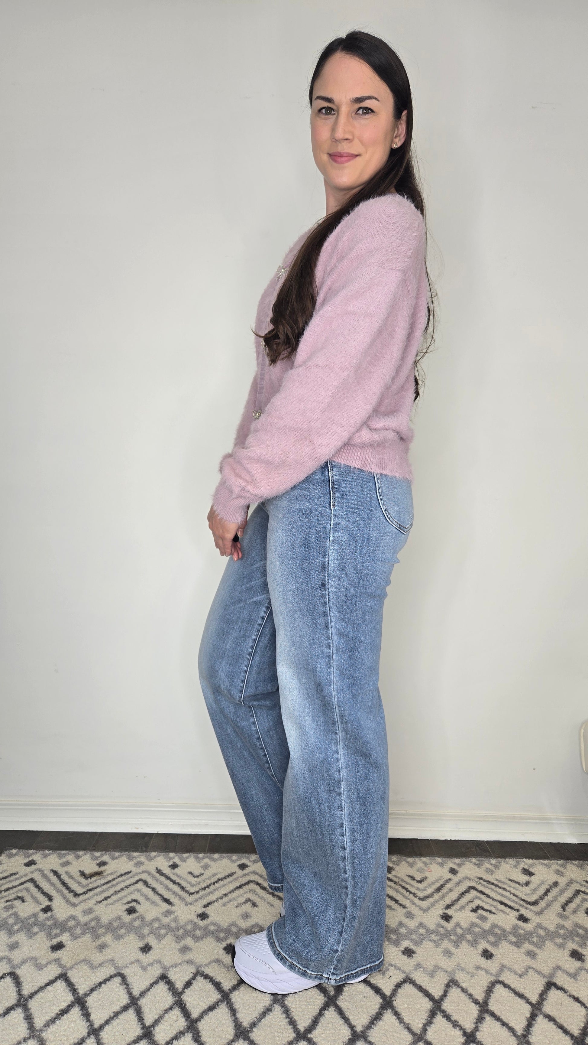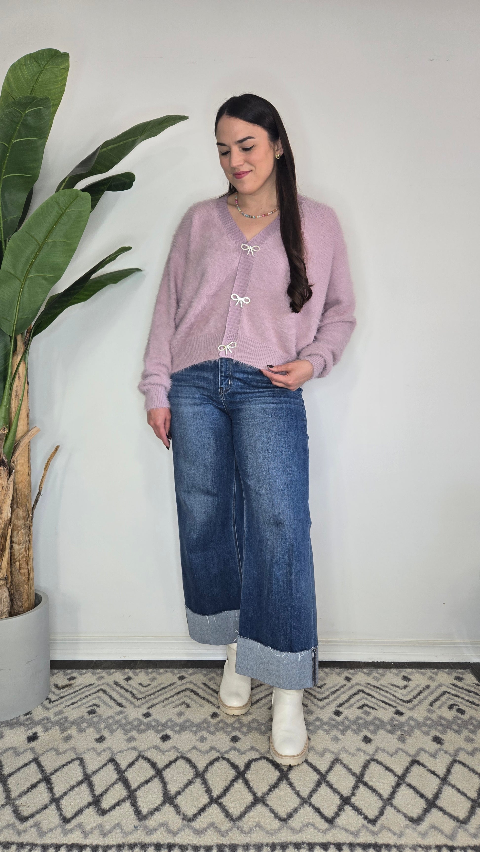 Description: Sweet, soft, warm, and full of charm. This lavender fuzzy cardigan brings a cozy texture with a flirty twist, thanks to its rhinestone bows that sparkle just enough (removable for washing). The slightly cropped fit pairs perfectly with high-rise denim, while the ultra-soft yarn makes it feel like a hug in sweater form.Â