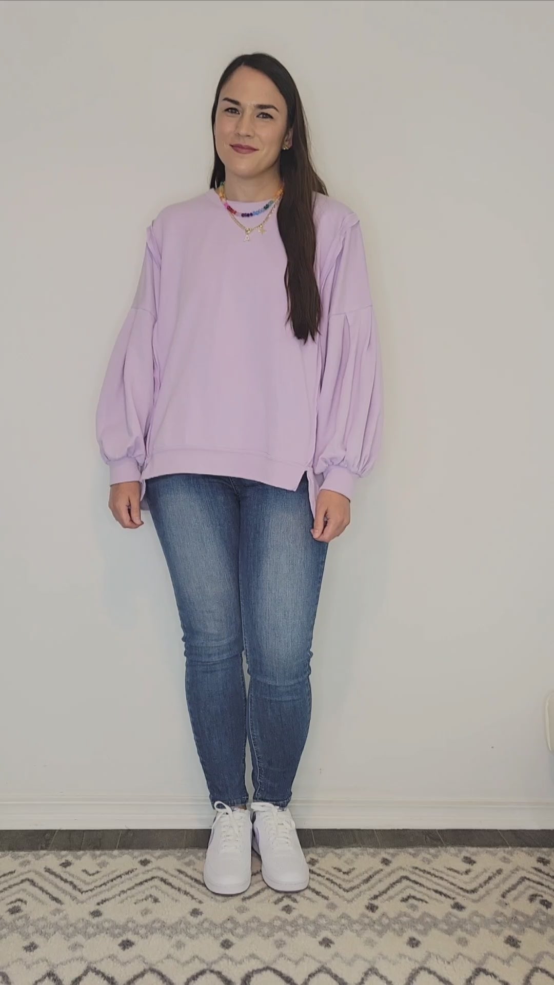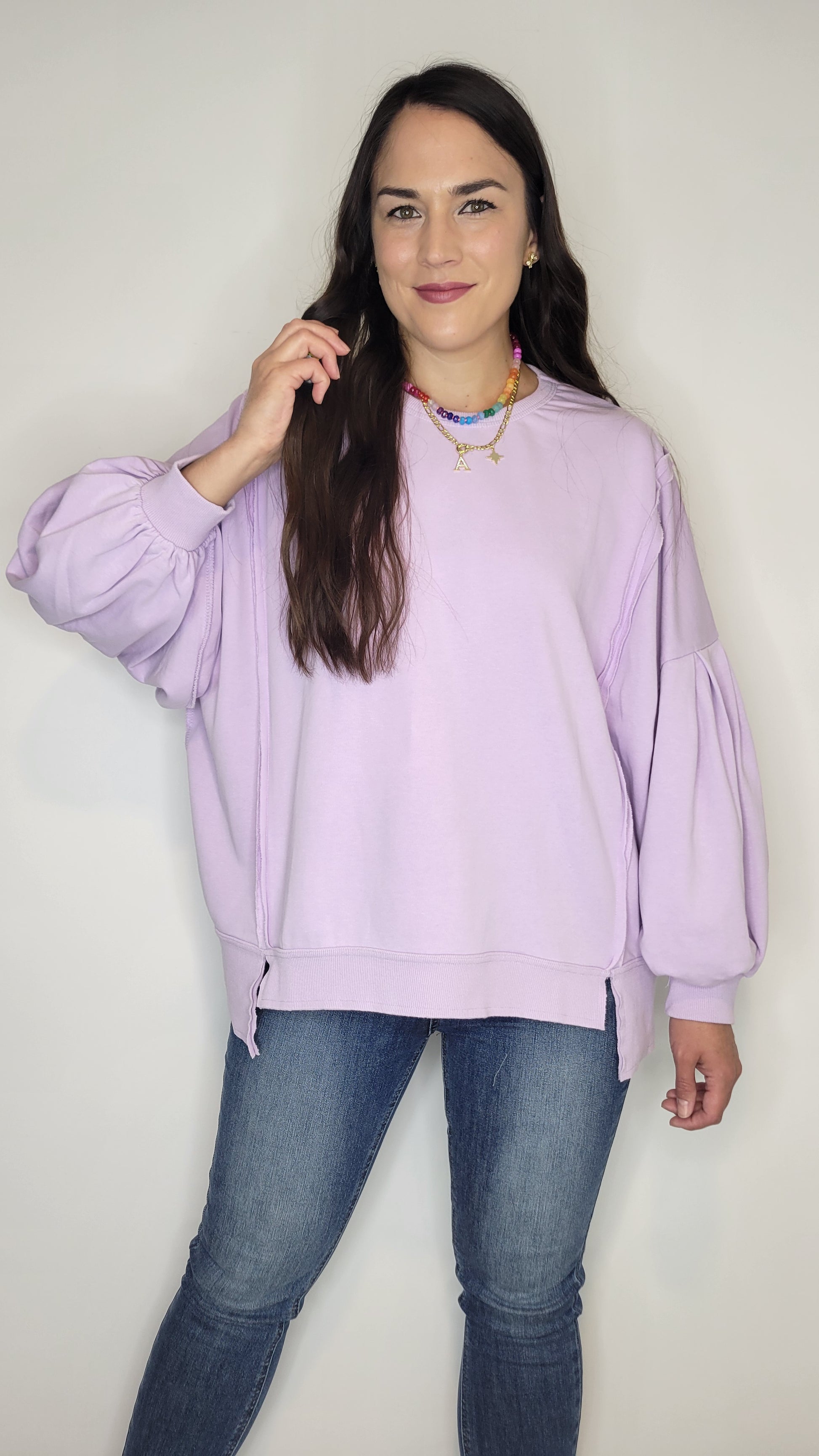 Details: This lavender sweatshirt is perfection. Lightweight for a sweatshirt, comfortable, and quality material. Oversize and cozy feel. Stitch detailing and front slits. Ribbed contrast material on the sleeve cuffs and hem. We love the modest crew neck, slight drop shoulder, and balloon sleeves! The length makes it great for pairing with leggings and skinny jeans!
