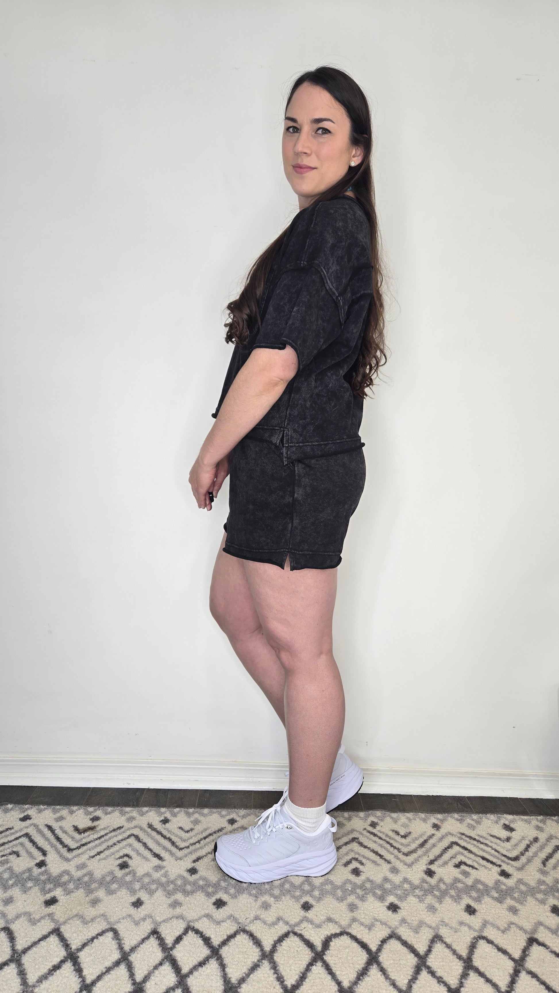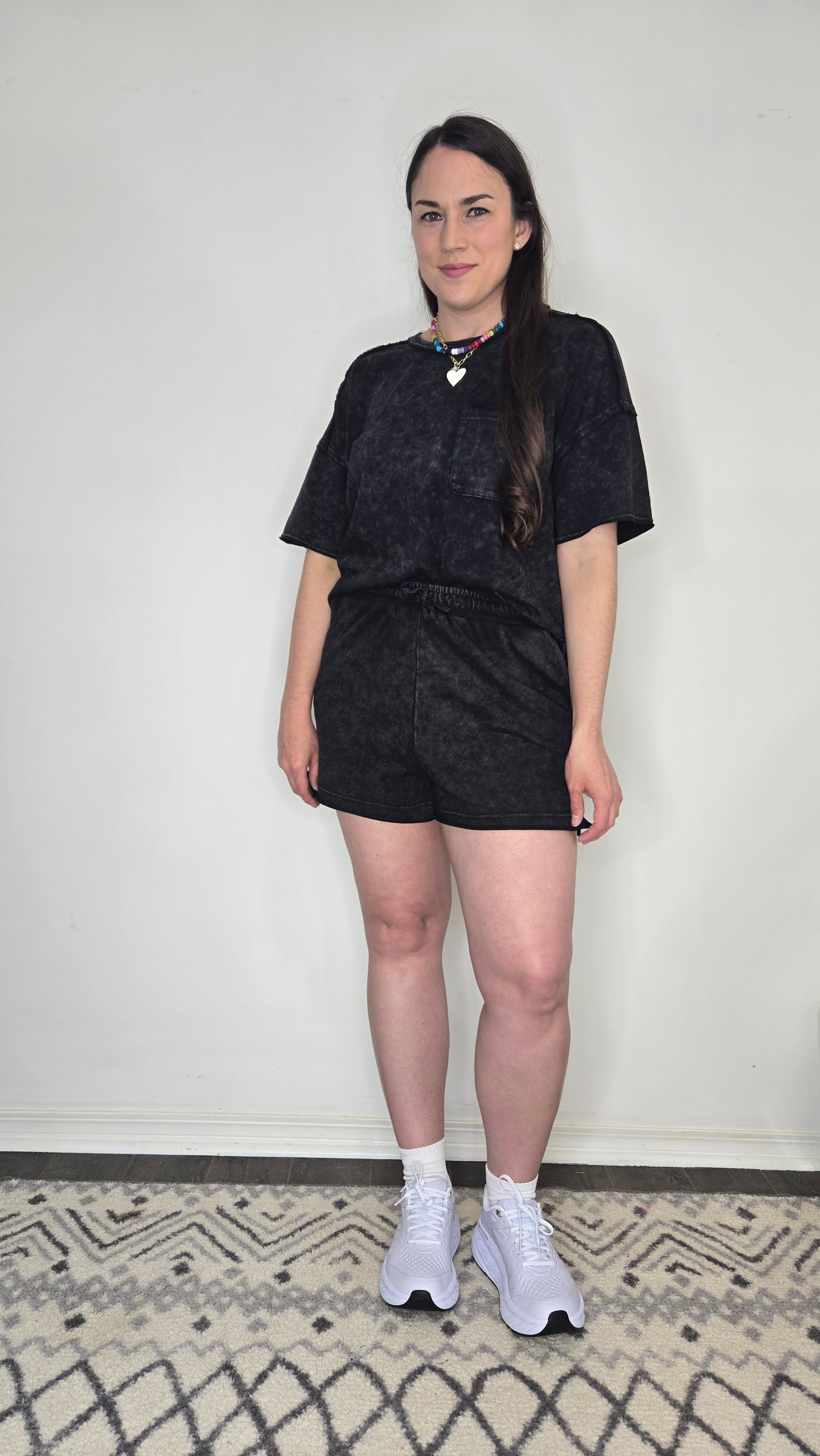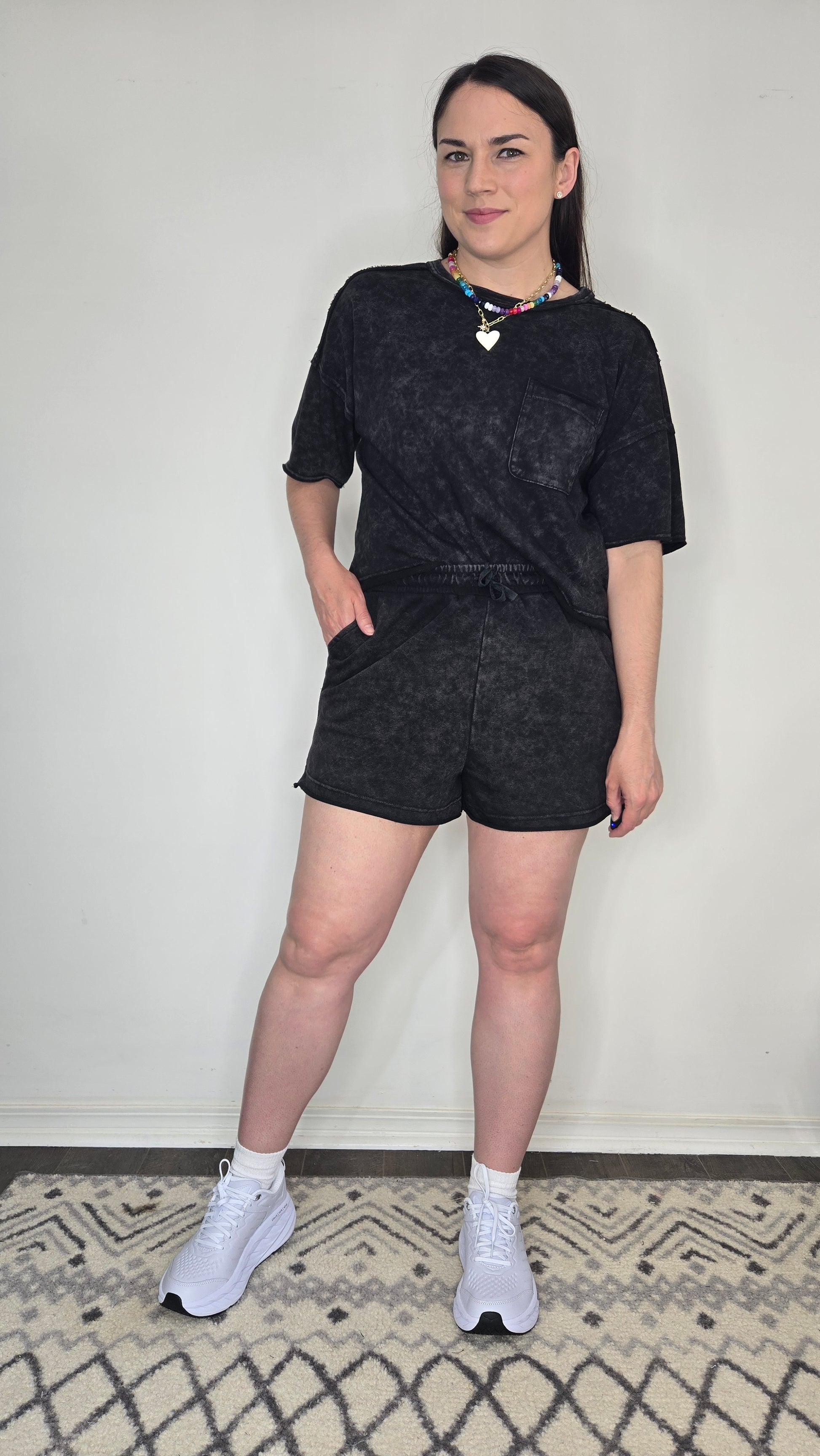 Details: This lightweight black acid washed soft terry lounge two piece set is the perfect blend of comfort and casual style. The top features a relaxed fit with a subtle pocket detail, while the matching shorts offer an easy, flexible feel with their elastic waistband and adjustable drawstring. Whether you're kicking back at home or heading out for the day, this set makes effortless style a no-brainer. It is great as a set, but you can also pair the top with denim, or wear the shorts with other tanks and tops. So many mix and match options.Â