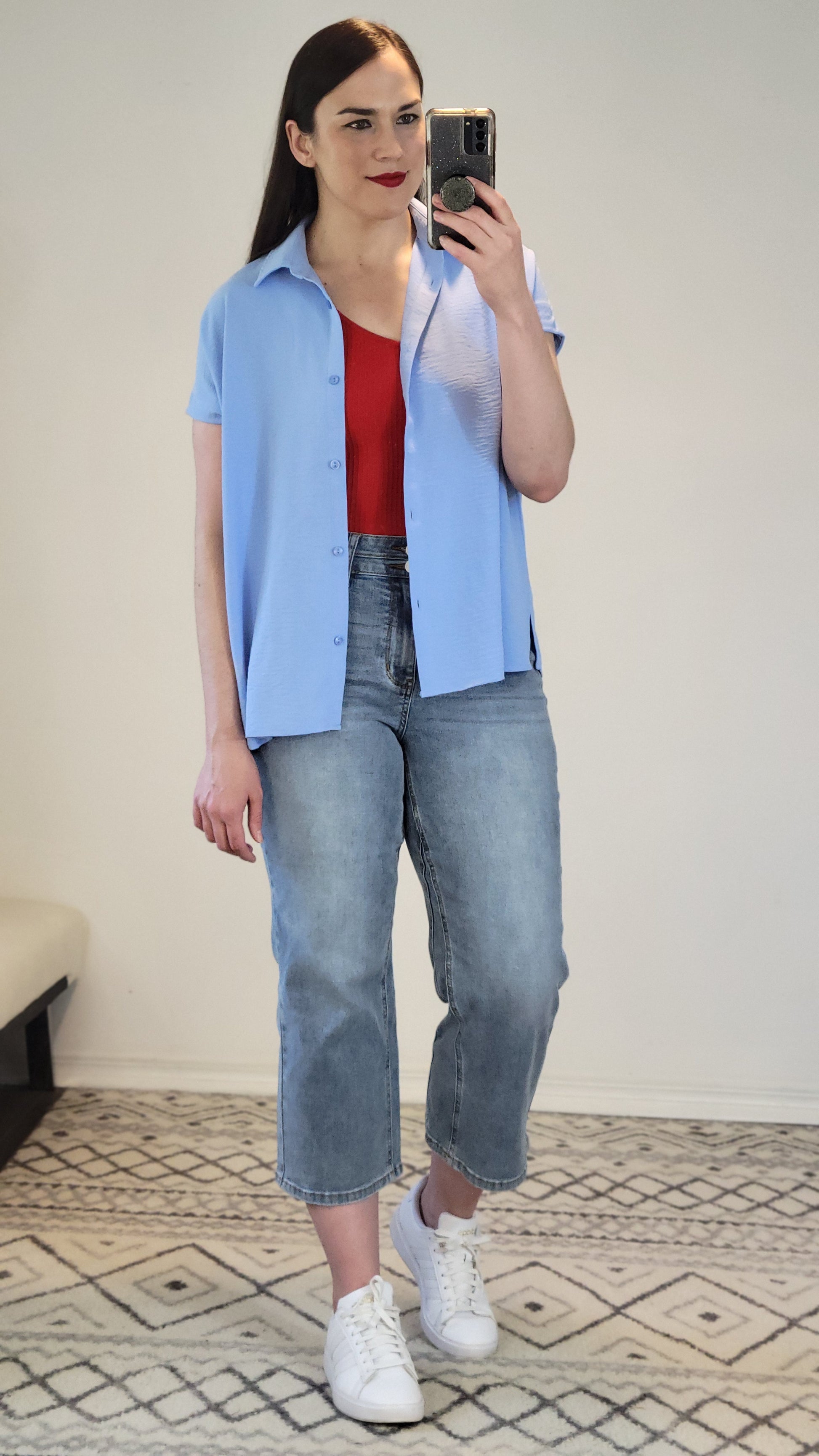 Details: This collared airflow button up top is so soft, lightweight and comfortable. It’s very versatile and can be dressed up or down! The airflow material is one of our favorites because it washes well and looks elevated, but also has some stretch. Wear it buttoned or unbuttoned. You can tuck it, wear it part tucked, or tied. It has a flowy fit, side slits, and a fabulous length! Loving this color paired with a pop of red.
