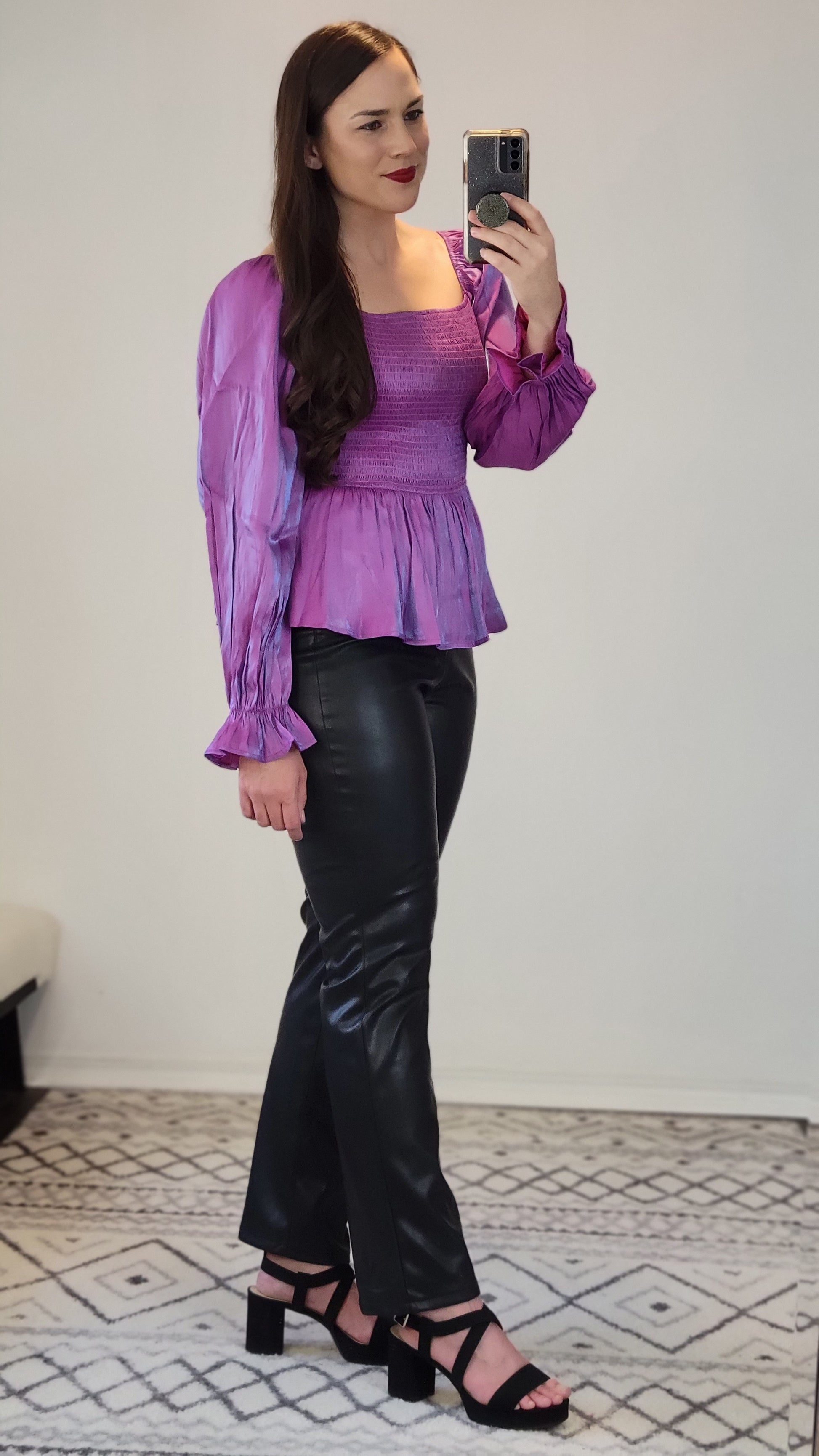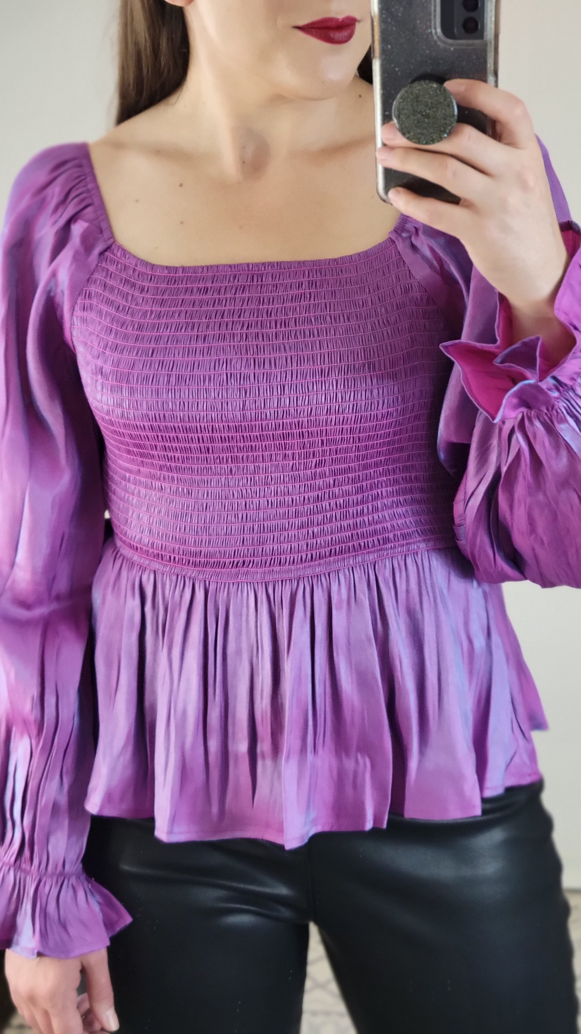 Details: This beautiful chic shimmery metalic top features a smocked bodice with peplum detail, long sleeves, and square neck. The magenta color is gorgeous and the shimmer has hints of blue. Pair it with some black pants and a nice bootie or heels!