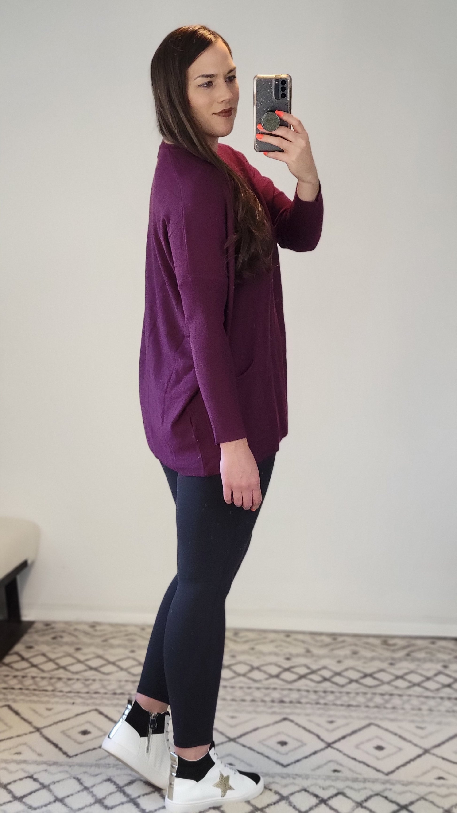 Details: It’s our favorite sweater ever back in yet another color! This oversize knit sweater with a round neck and two pockets in the front is so comfortable, soft, light and flowy. I will be wearing this with black jeggings or jeans and boots for fall and winter and spring. It will be your go-to sweater for leggings! Order one to find out why it is our absolute favorite!