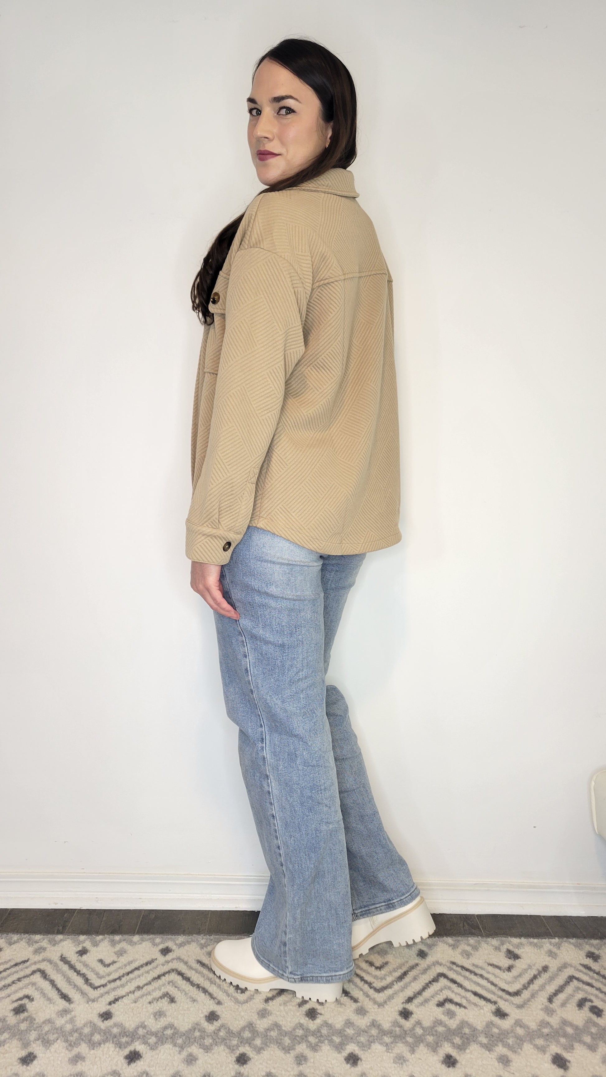 Details: This textured shacket offers a perfect blend of style and comfort. Designed with a structured fit, this versatile jacket features oversized front pockets and classic button details. It is lightweight and allows for effortless layering, while the timeless oatmeal color ensures it complements a variety of looks. Pair it with jeans for a casual outfit, or dress it up with accessories for an elevated ensemble. A must-have piece for transitional weather, this shacket combines the best elements of a shirt and jacket for everyday wear.