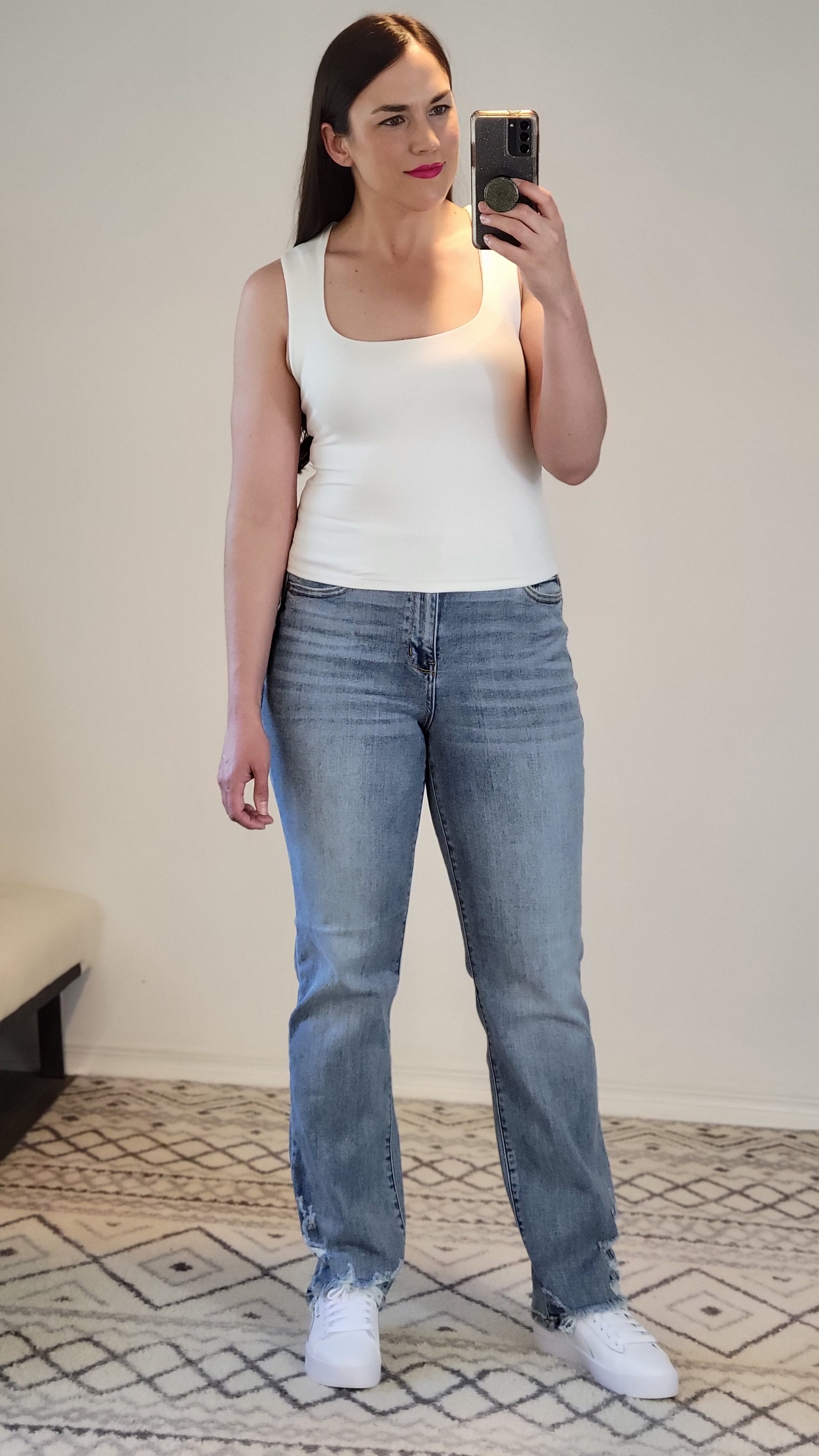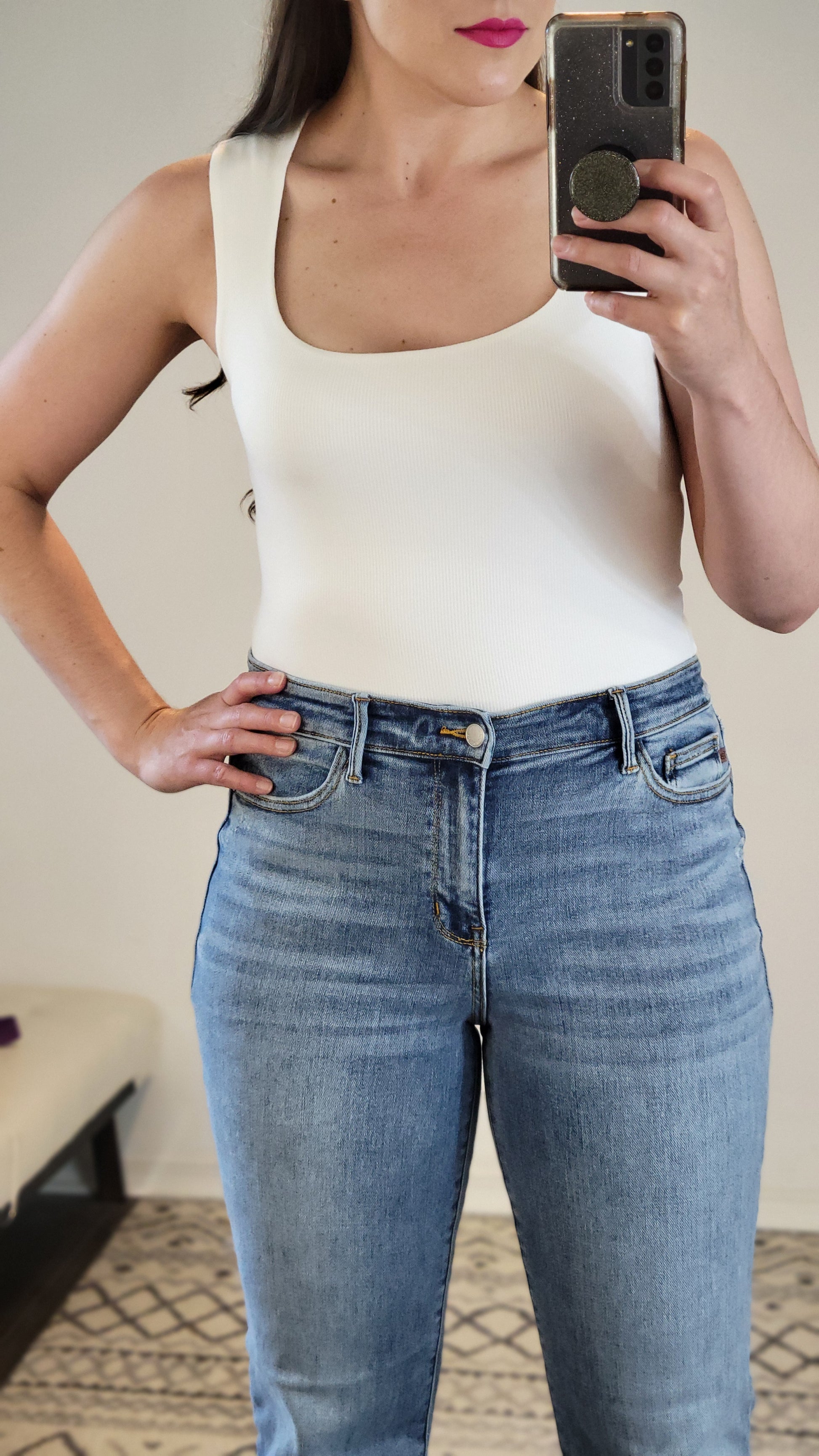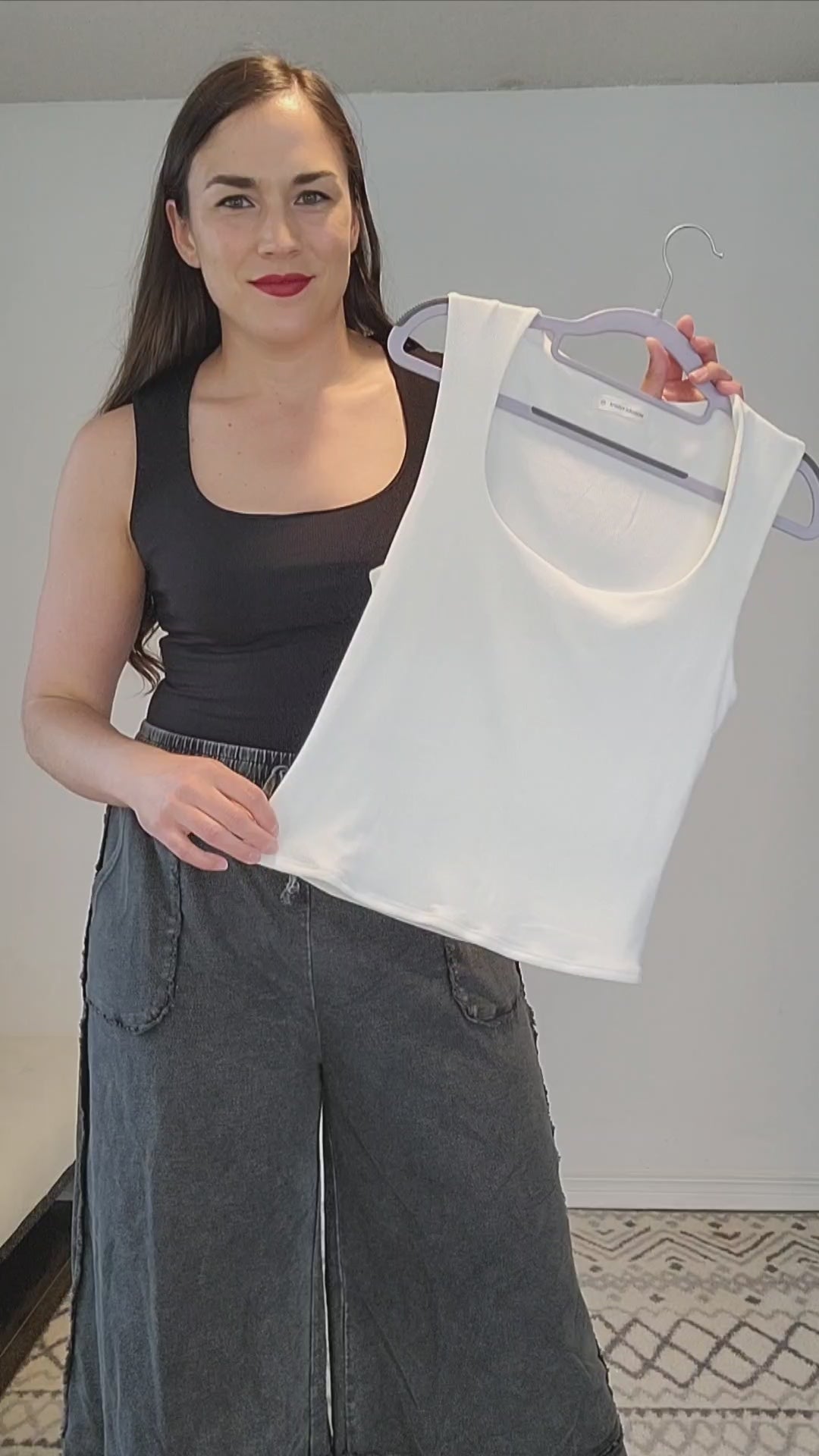 Details: The elevated basic you need! Outstanding quality, dreamy SOFT, and stretchy! The double layer is lightweight and smoothes everything. You can wear it with a regular bra. The square neck is beautiful and the length is perfect for tucking into high waist bottoms without a lot of extra material. You can also leave it untucked: let it hit the jean line and create a rushed look.