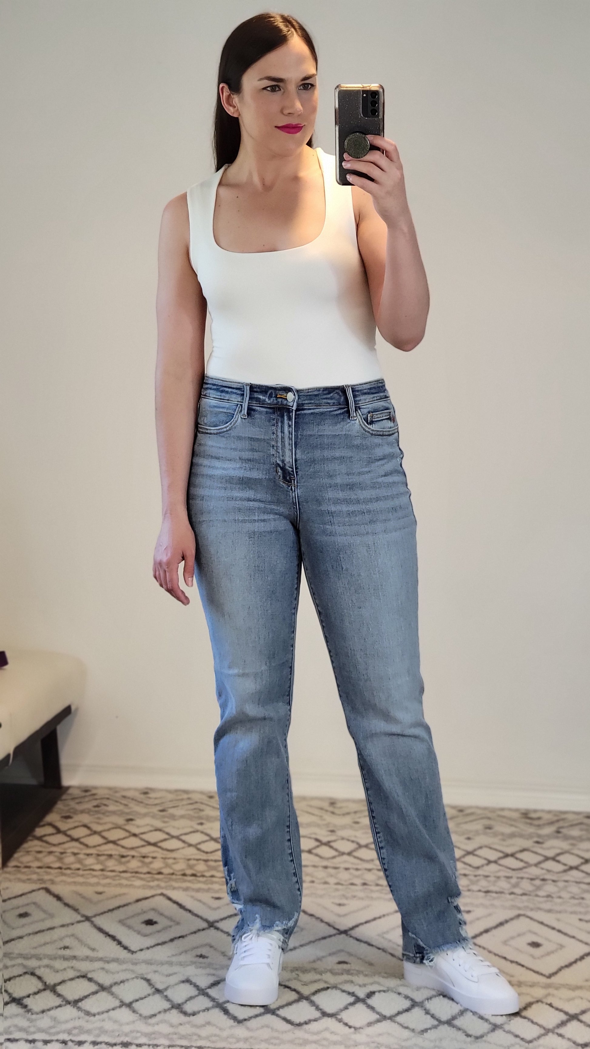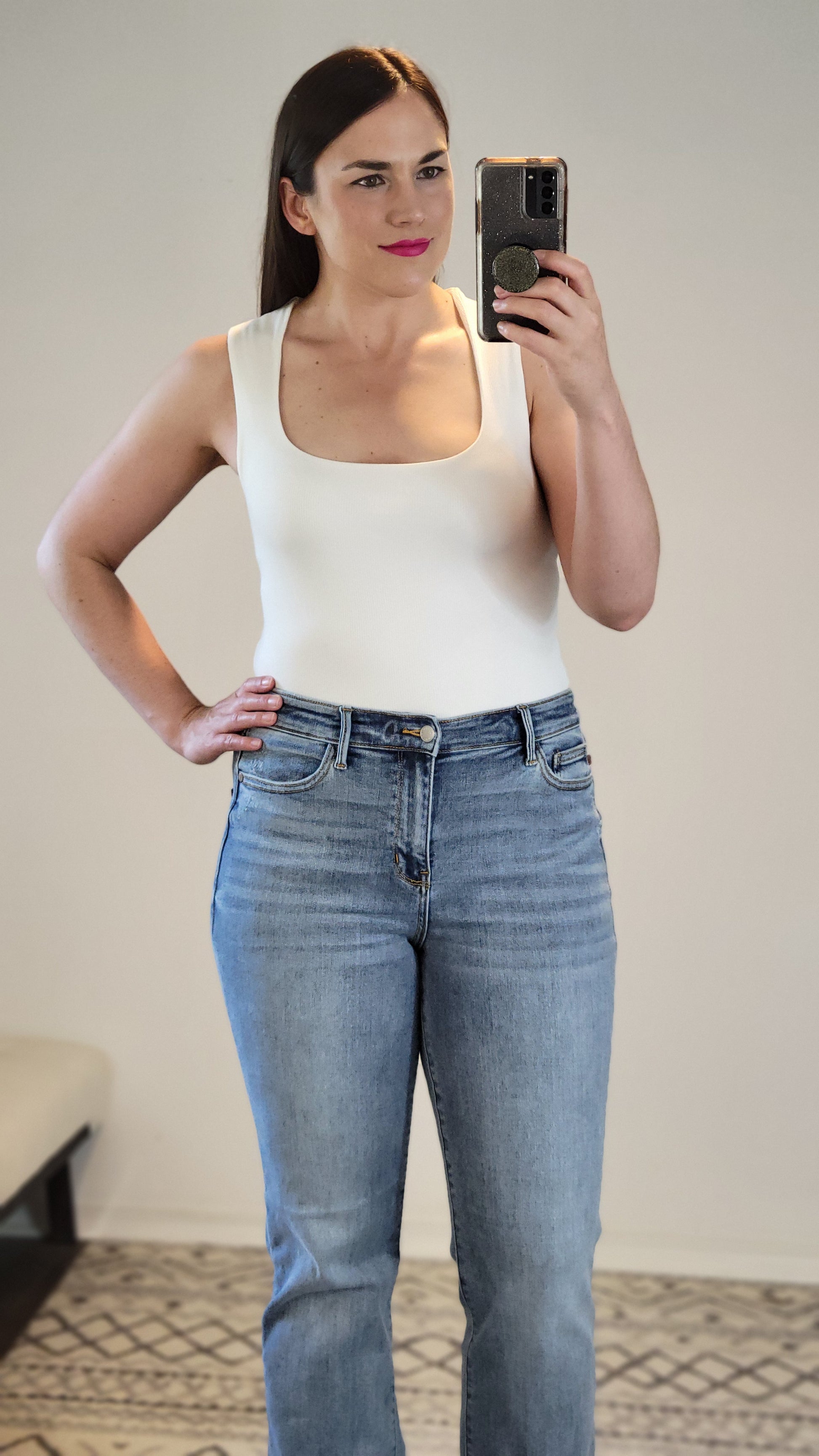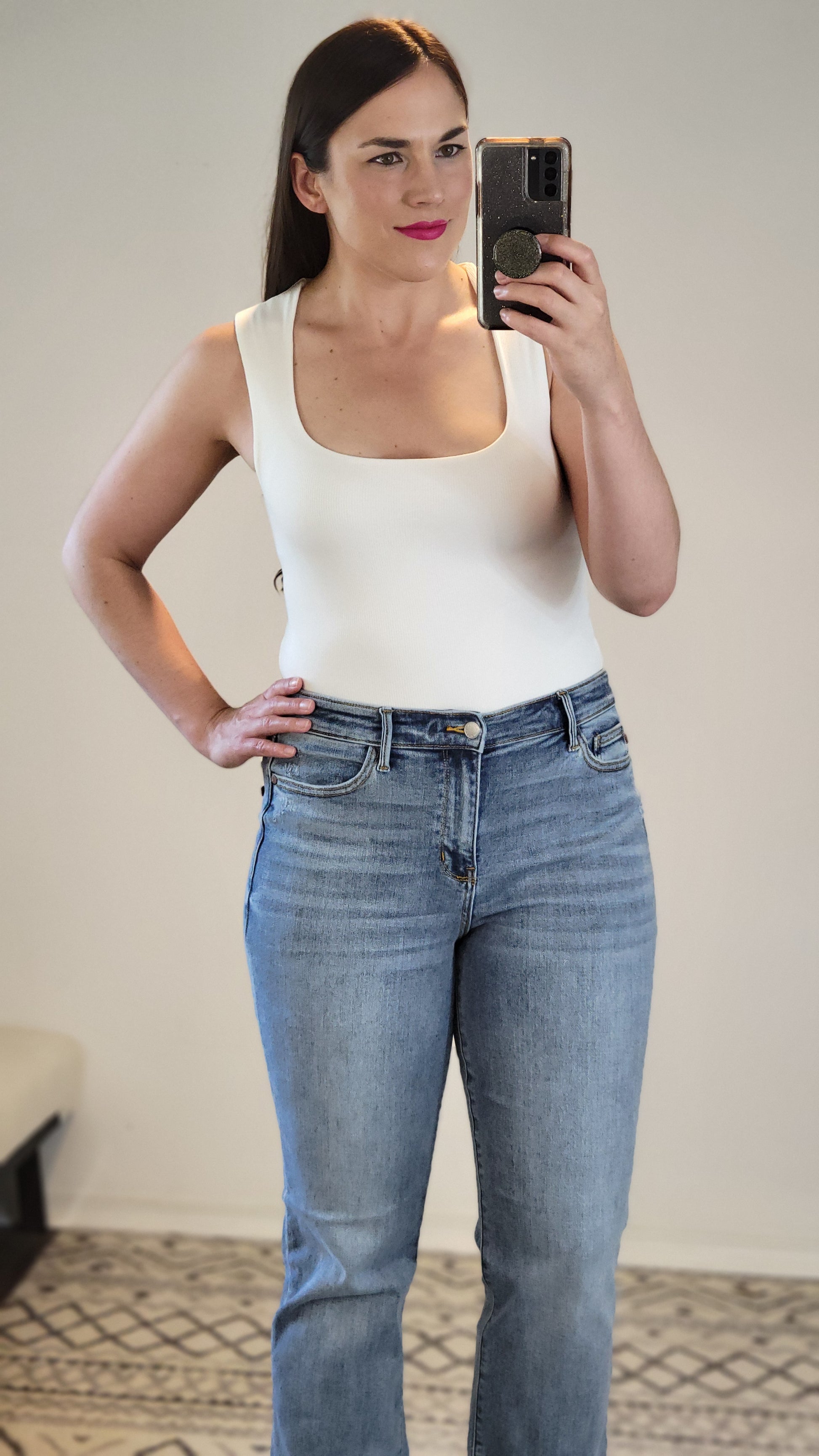 Details: The elevated basic you need! Outstanding quality, dreamy SOFT, and stretchy! The double layer is lightweight and smoothes everything. You can wear it with a regular bra. The square neck is beautiful and the length is perfect for tucking into high waist bottoms without a lot of extra material. You can also leave it untucked: let it hit the jean line and create a rushed look.