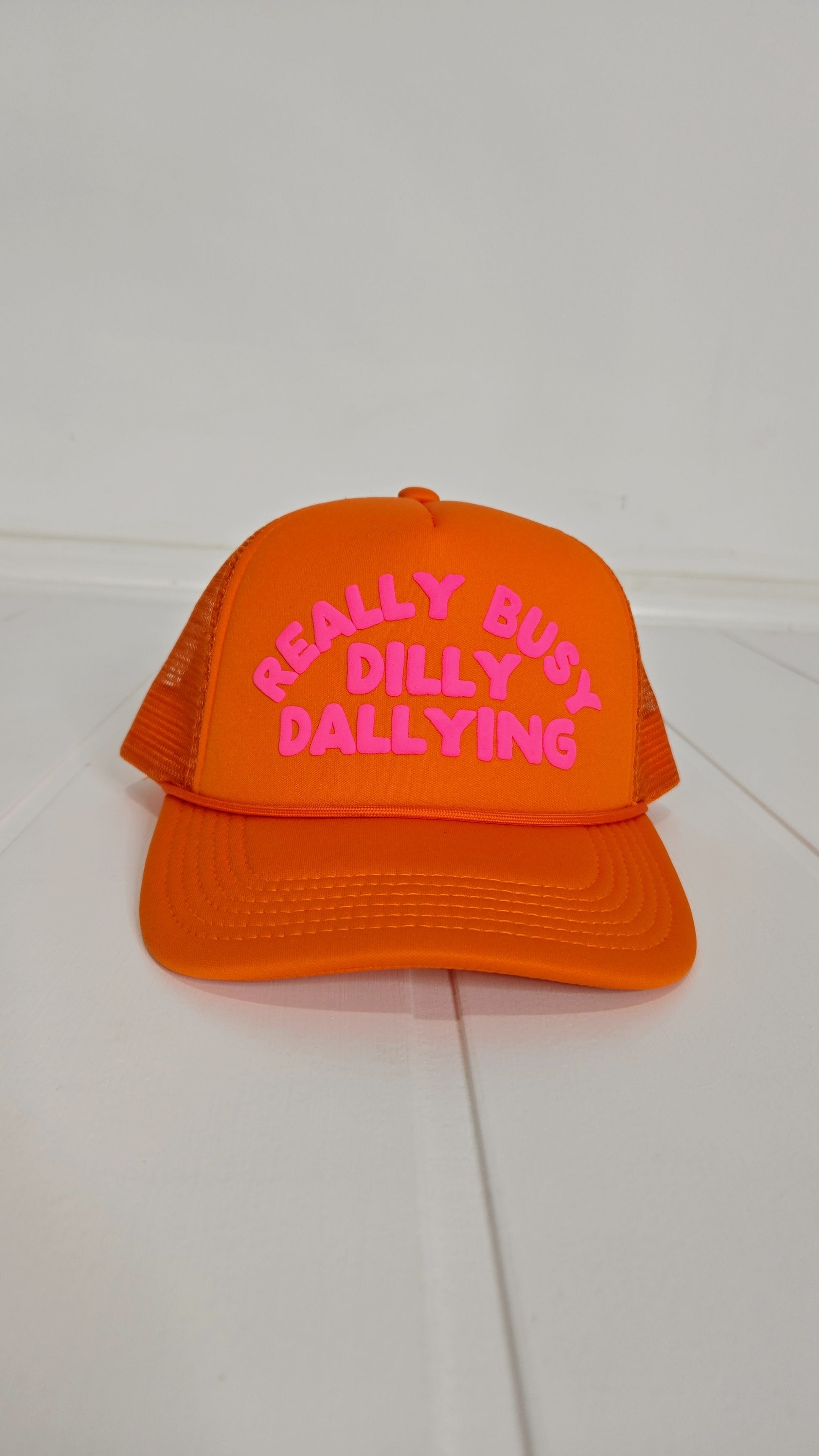 Description: Meet your new go-to hat for errands, coffee runs, and days when you’re productively procrastinating. This bold orange trucker hat features playful hot pink puff lettering that reads “Really Busy Dilly Dallying,” because, let’s be honest — you’re doing your best! With a breathable mesh back, adjustable snap closure, and a structured front, this hat adds a pop of fun to any casual outfit. Perfect for messy hair days, weekend markets, or just embracing your laid-back vibe in style.