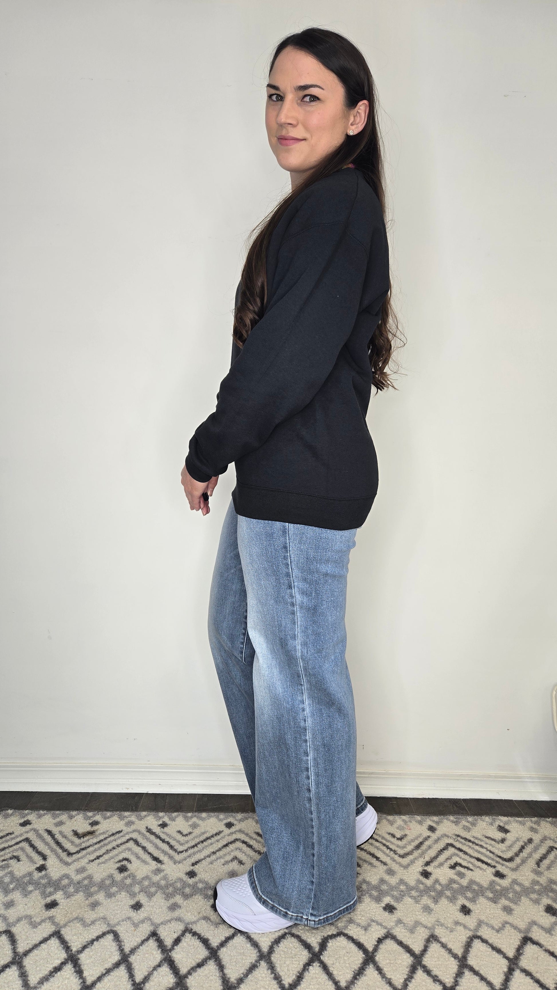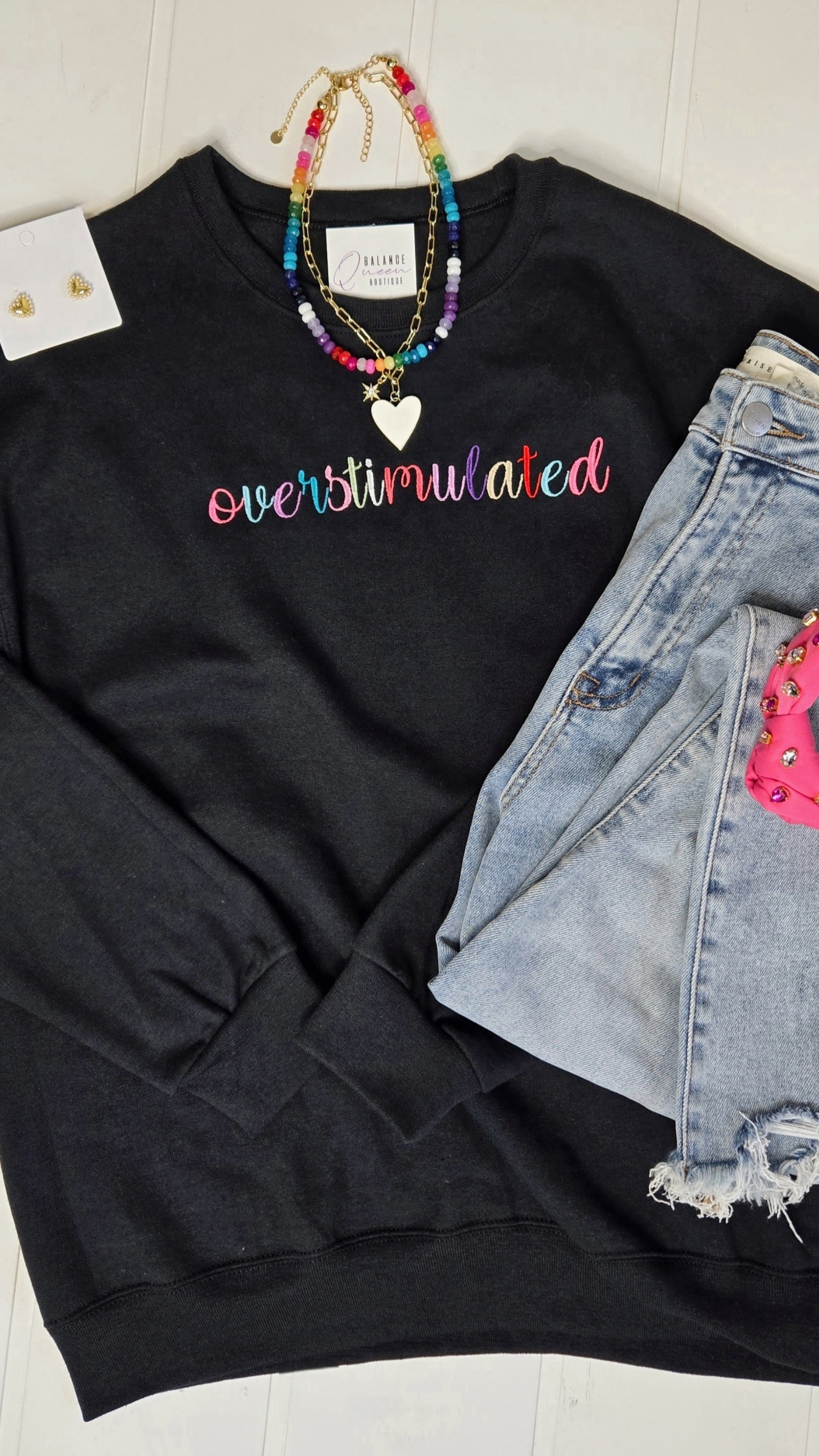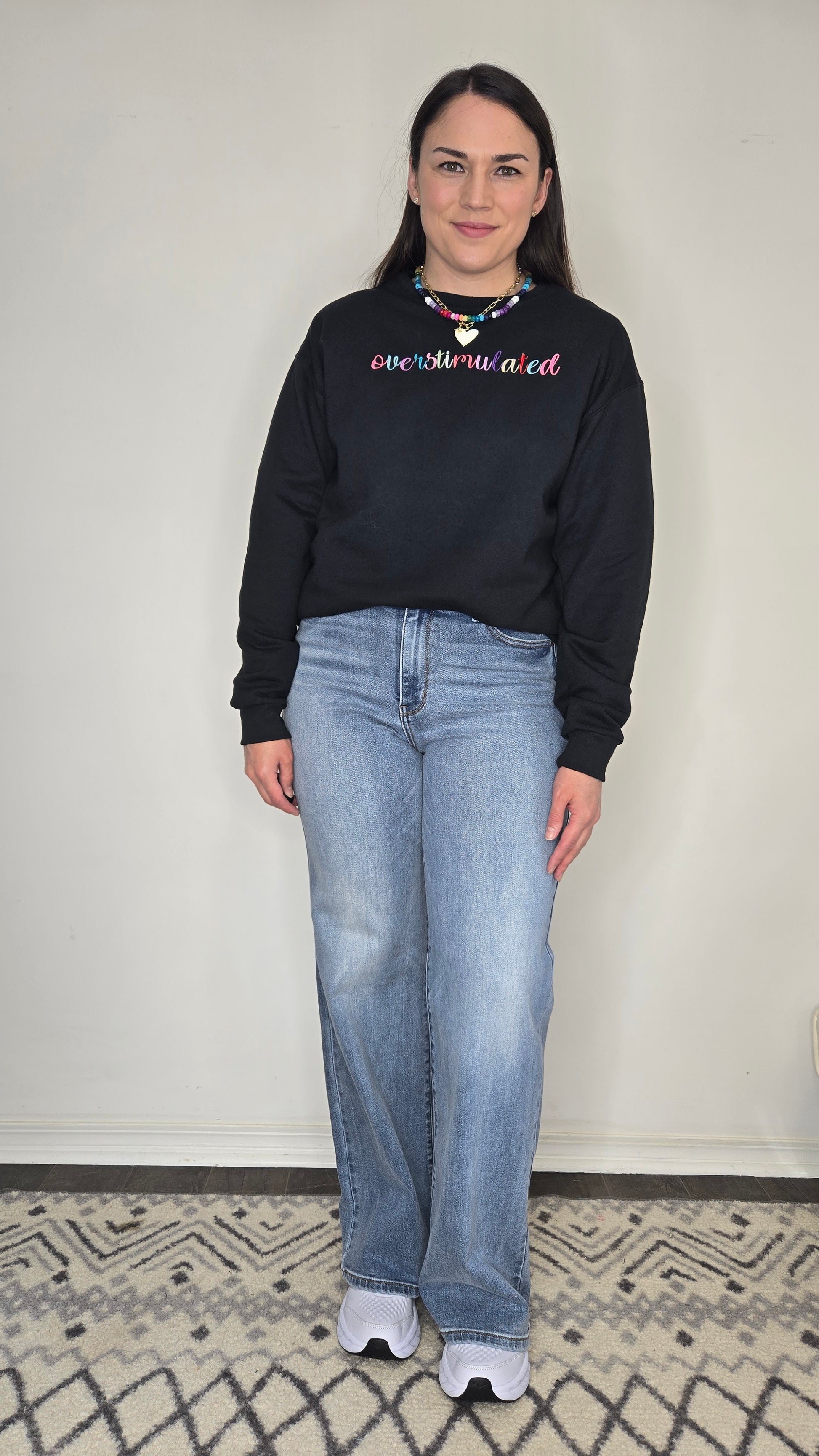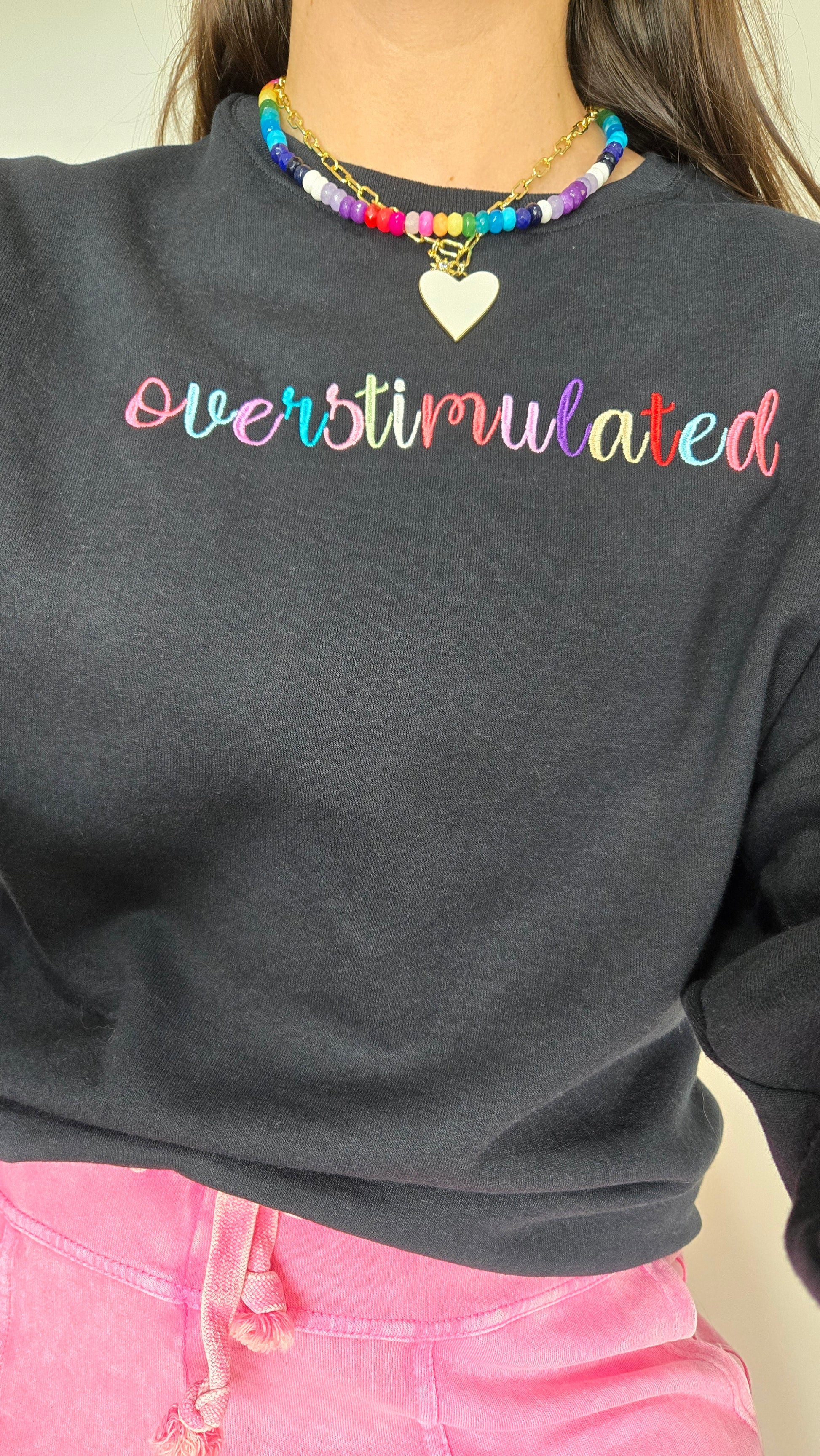 Description: A colorful mood for your overstimulated moments. This cozy black crewneck features bold, multicolor embroidery in a playful script—perfect for anyone who feels a lot and owns it. Made on a soft Jerzees fleece blend, it’s comfy enough for lounging, stylish enough for errands, and totally on-brand for overstimulated teachers, moms, and everyday humans alike.