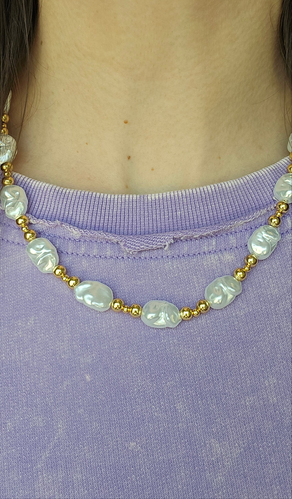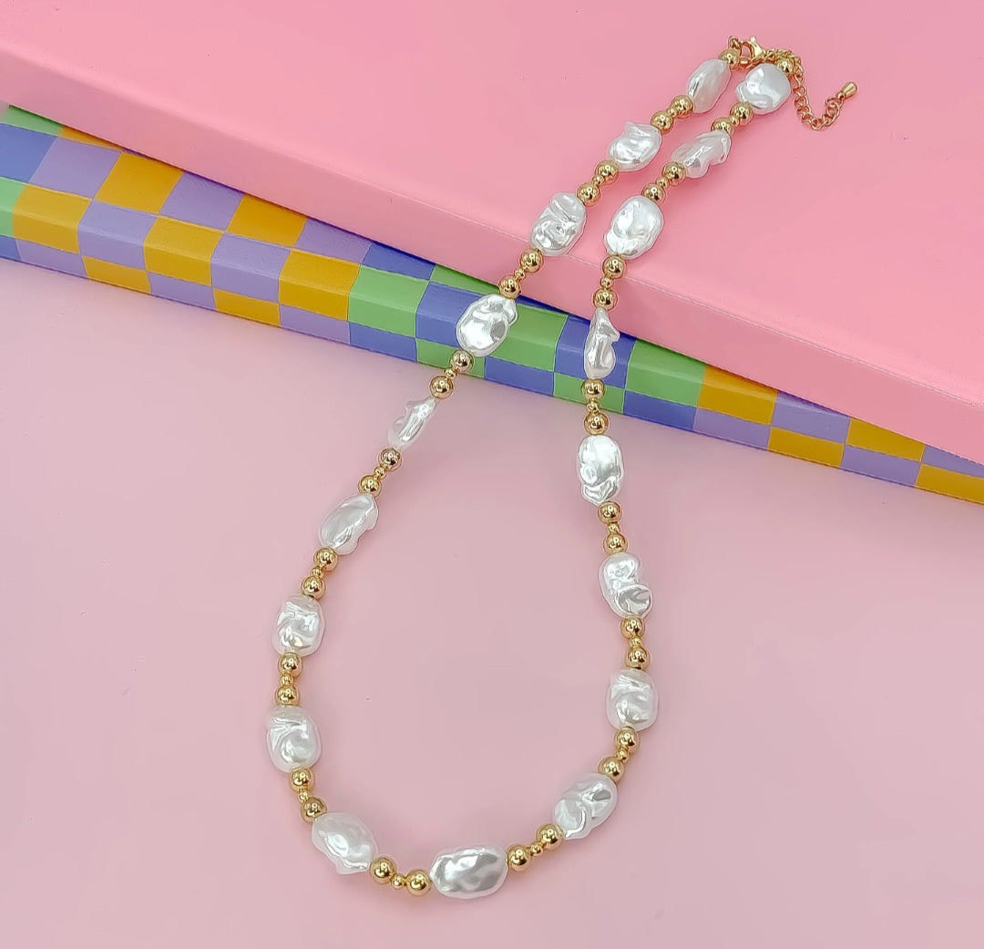 Elevate your everyday look with this luxe pearl and gold bead necklace. Featuring irregular faux pearls paired with glossy gold-toned beads, this piece adds instant charm and elegance. Whether layered with other favorites or worn solo, it's the perfect mix of classic and playful—making it a must-have for any jewelry lover’s collection. Adjustable clasp for a just-right fit.