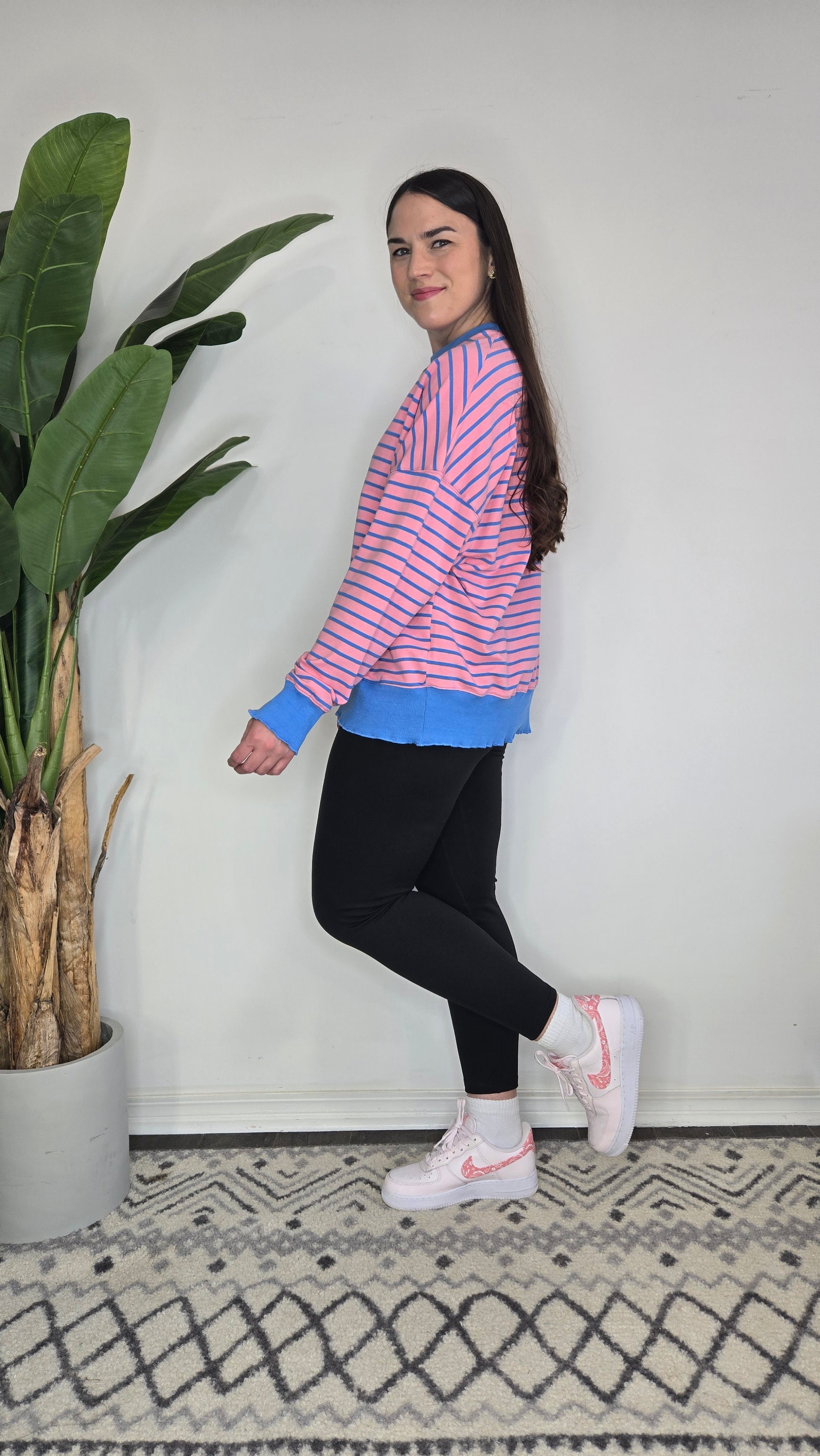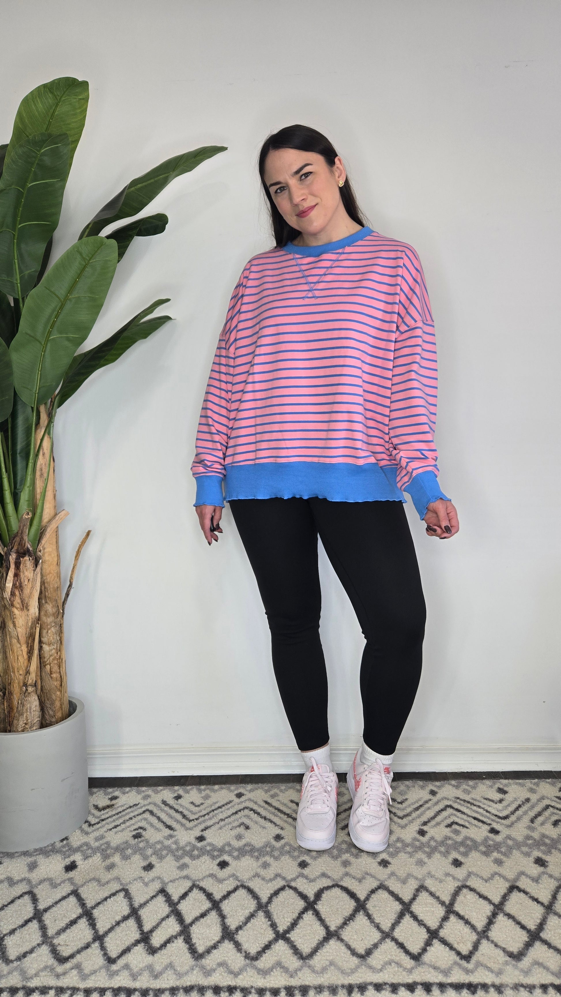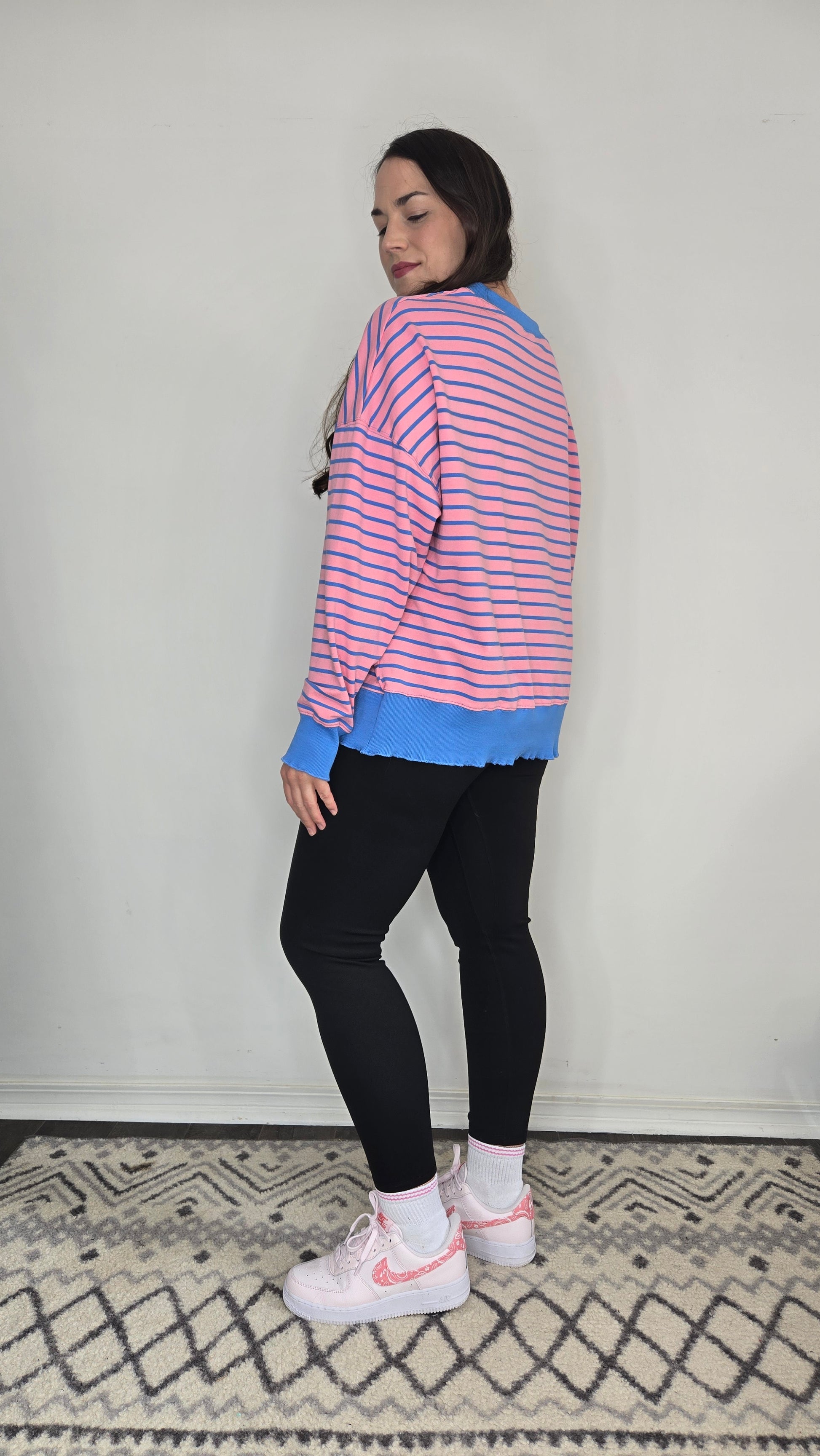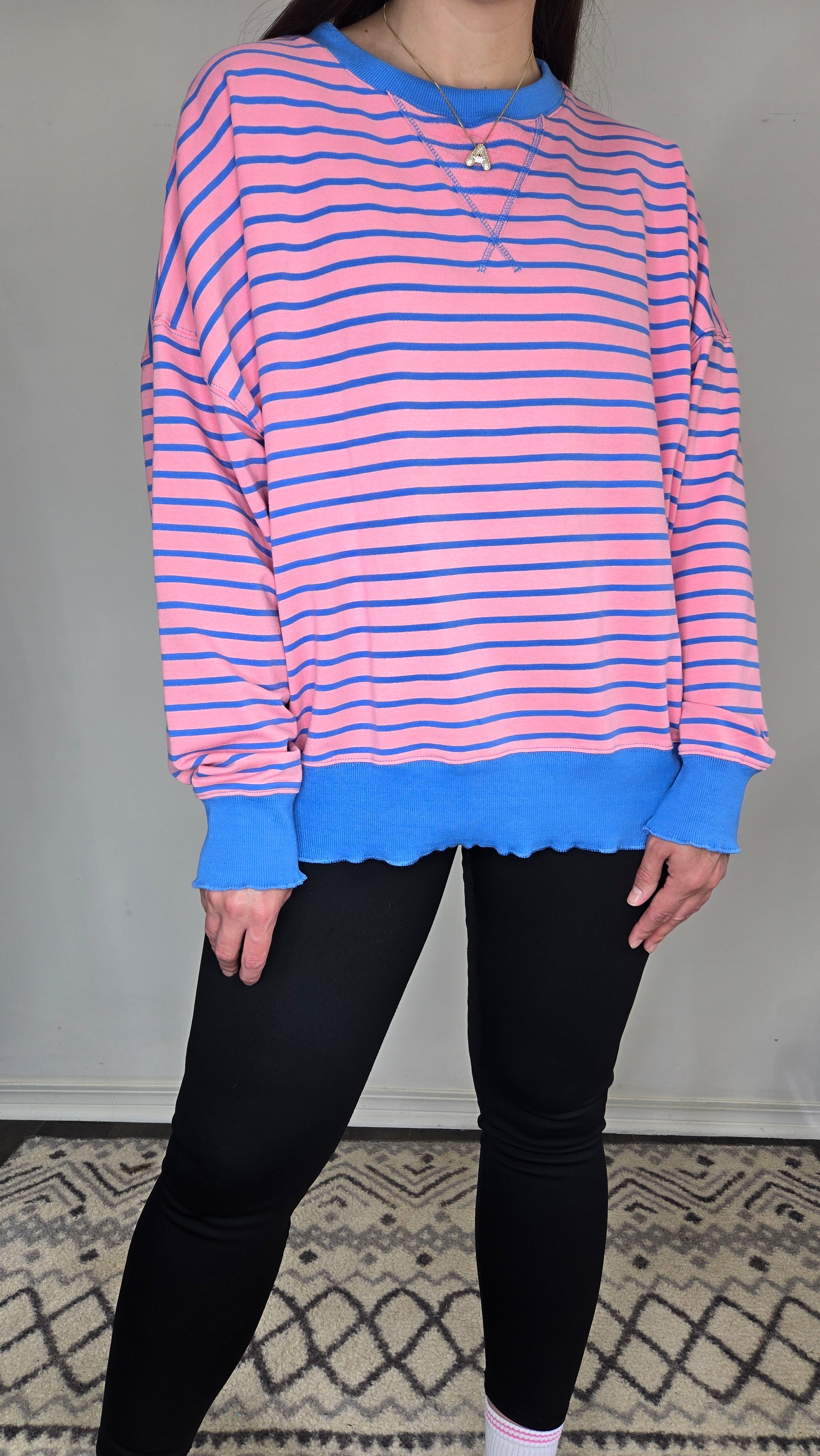 Description: This lightweight pink and blue striped pullover features a relaxed fit, dropped shoulders, and contrast blue ribbed trim. Soft, cozy, and easy to throw on for school, errands, or lounging—bright color made effortless.
