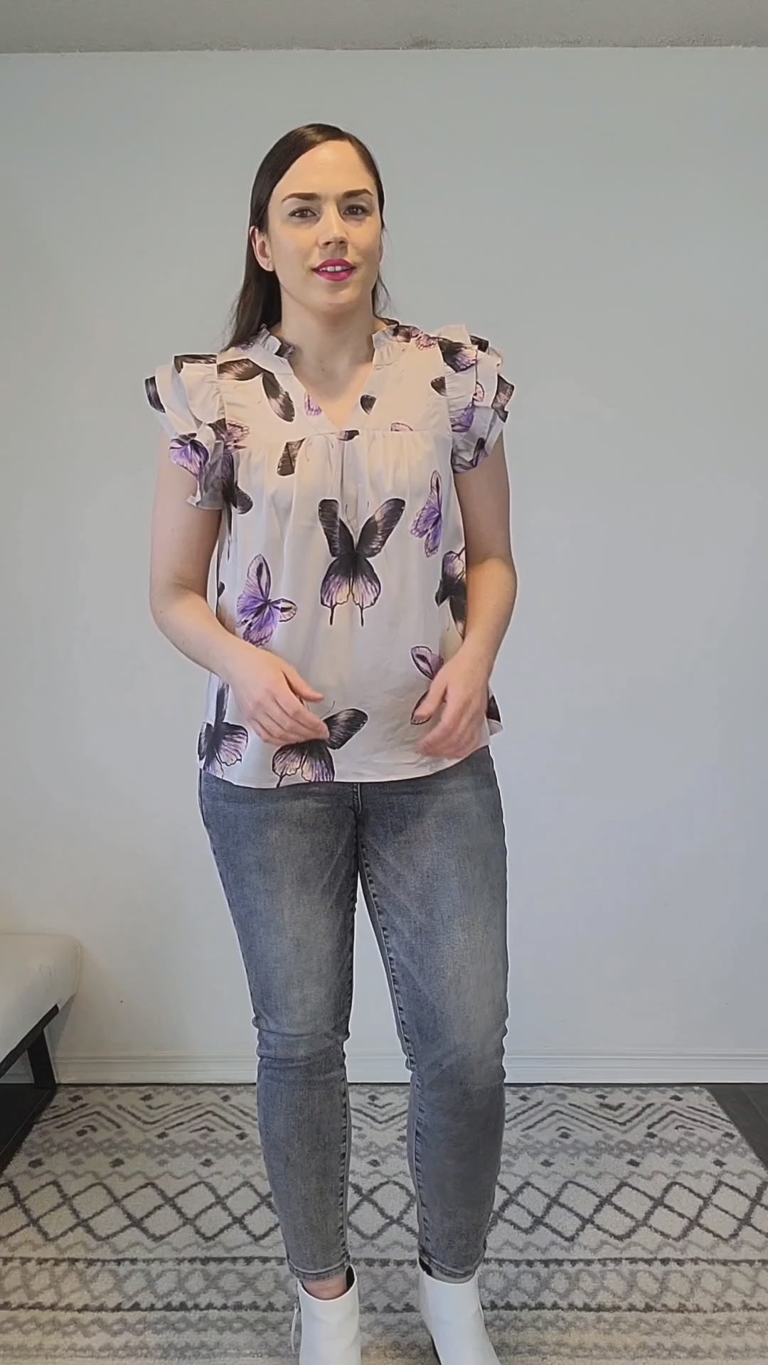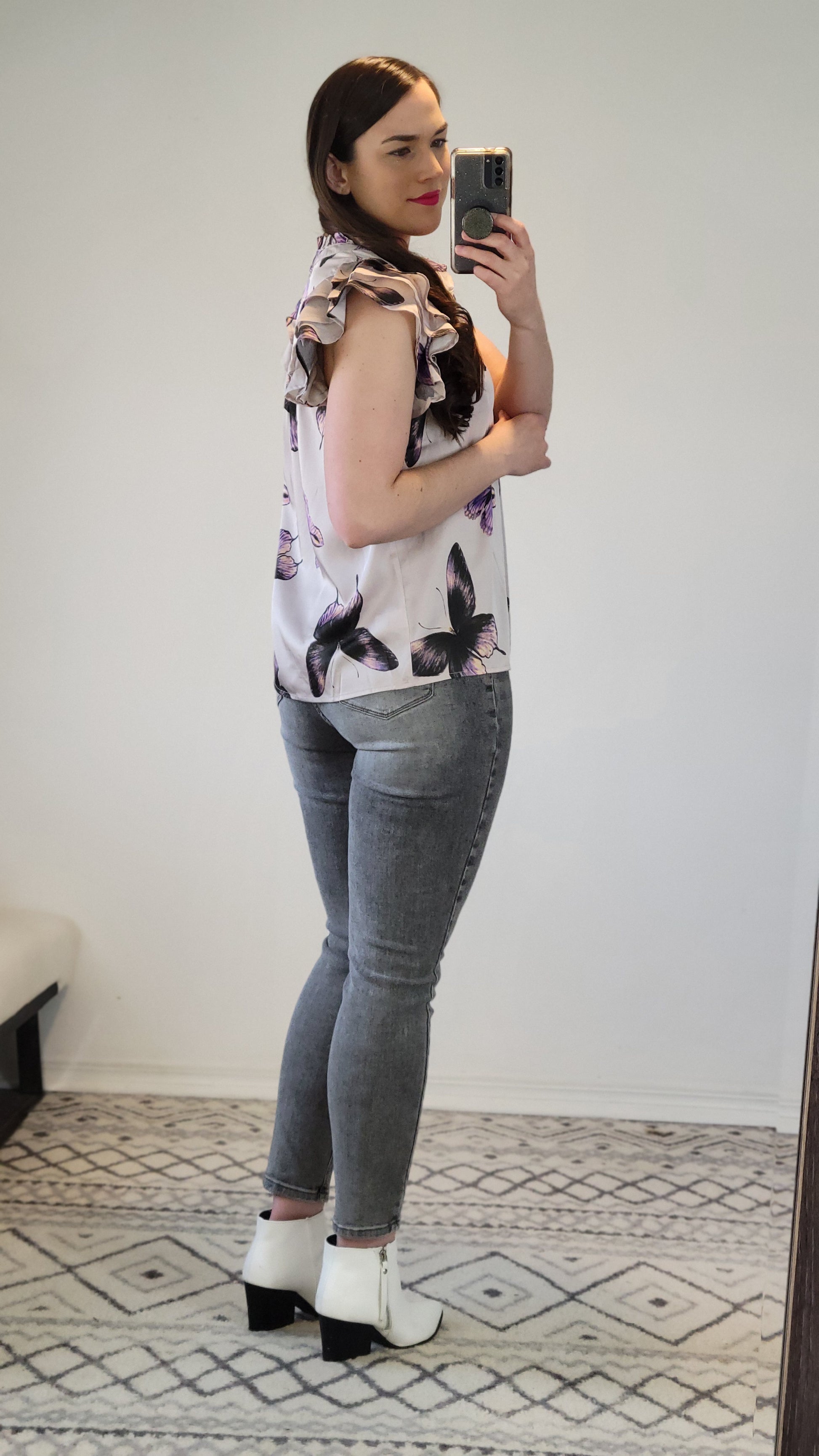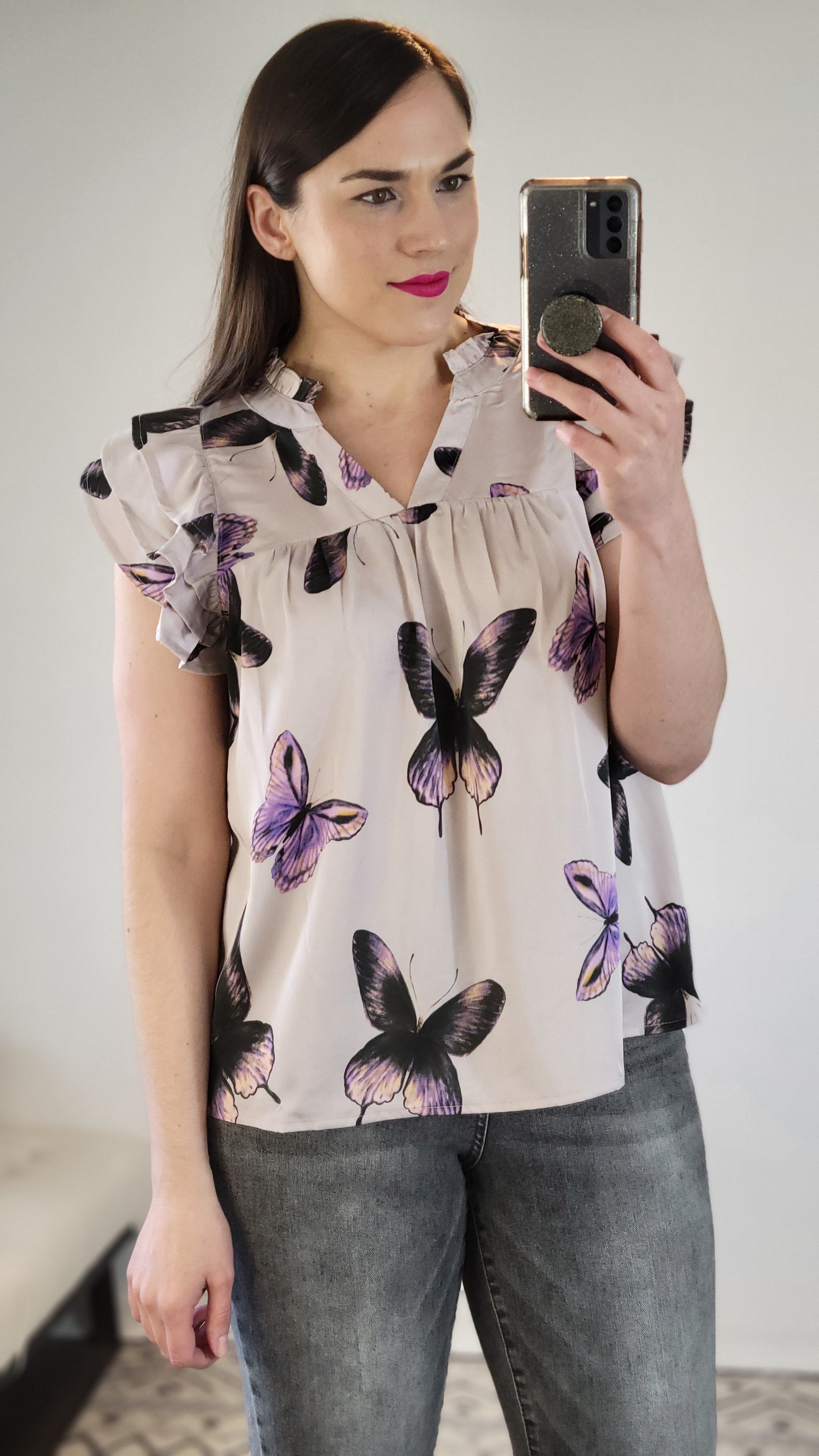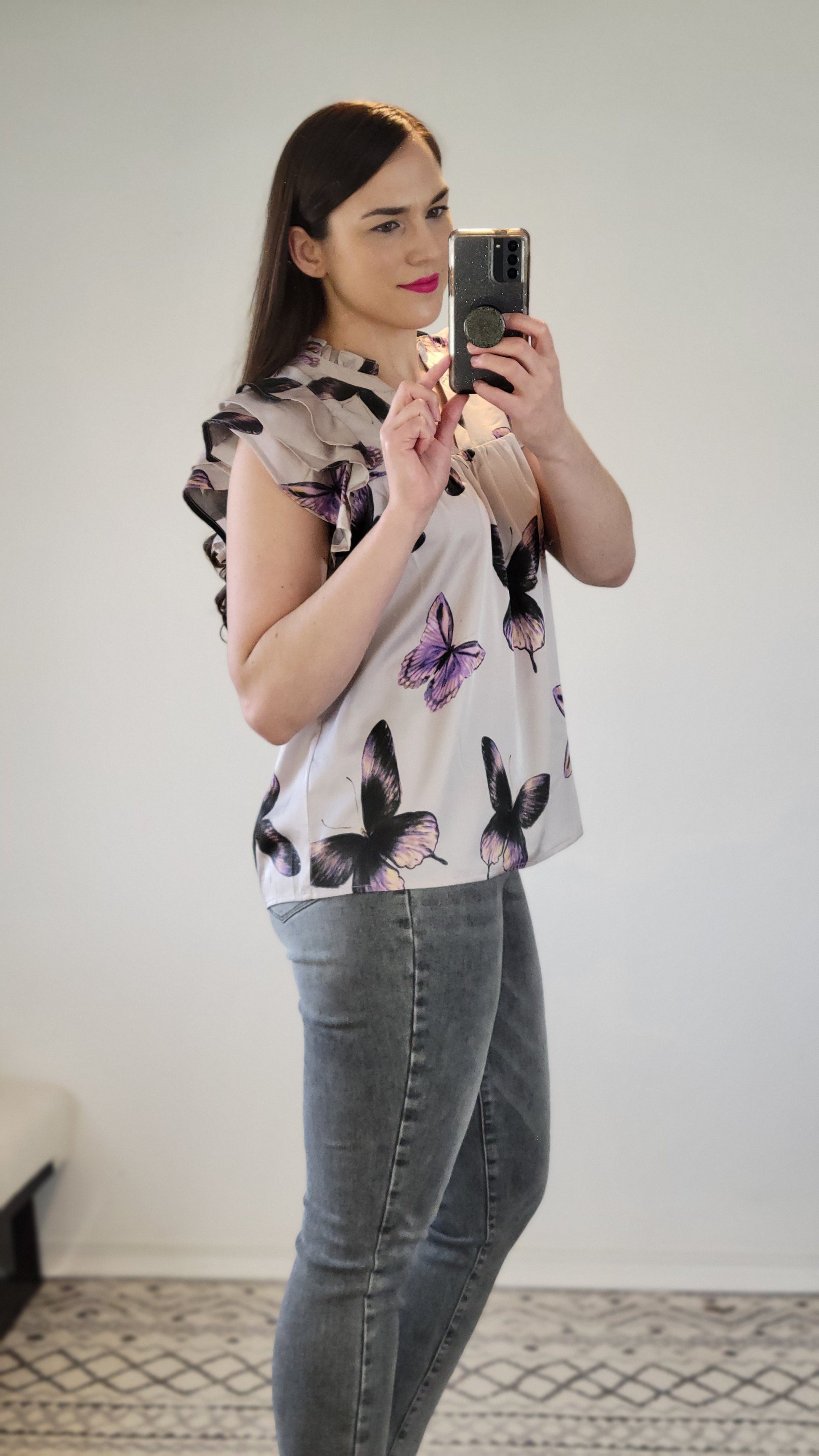 Details: This dressy top is so unique and stunning! The beautiful tiered ruffle sleeves and gorgeous butterfly print are so feminine and elegant. It is satin smooth and comfortable as well. It is sure to be a favorite in your closet!