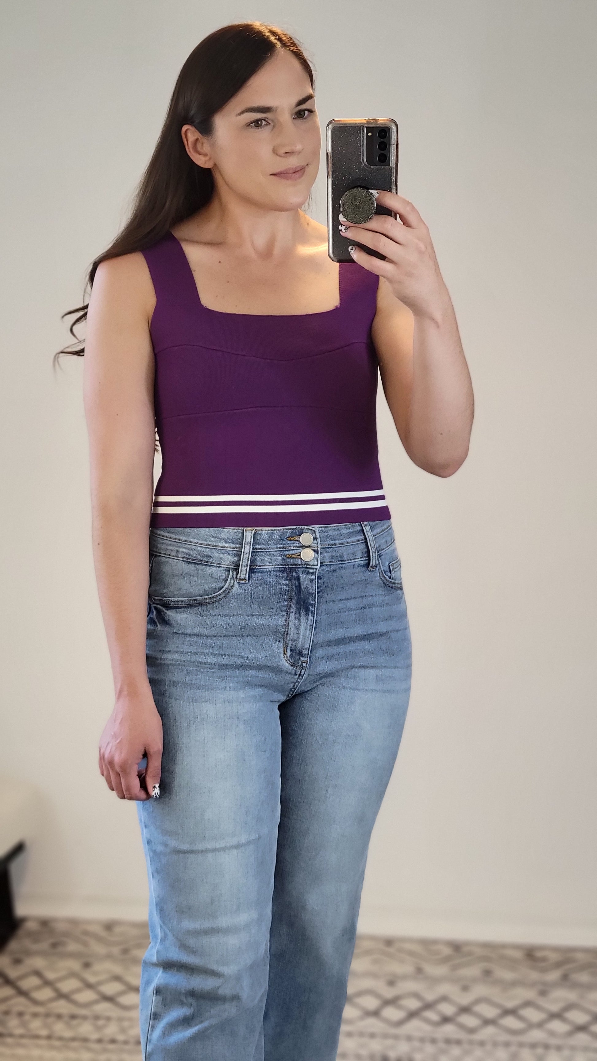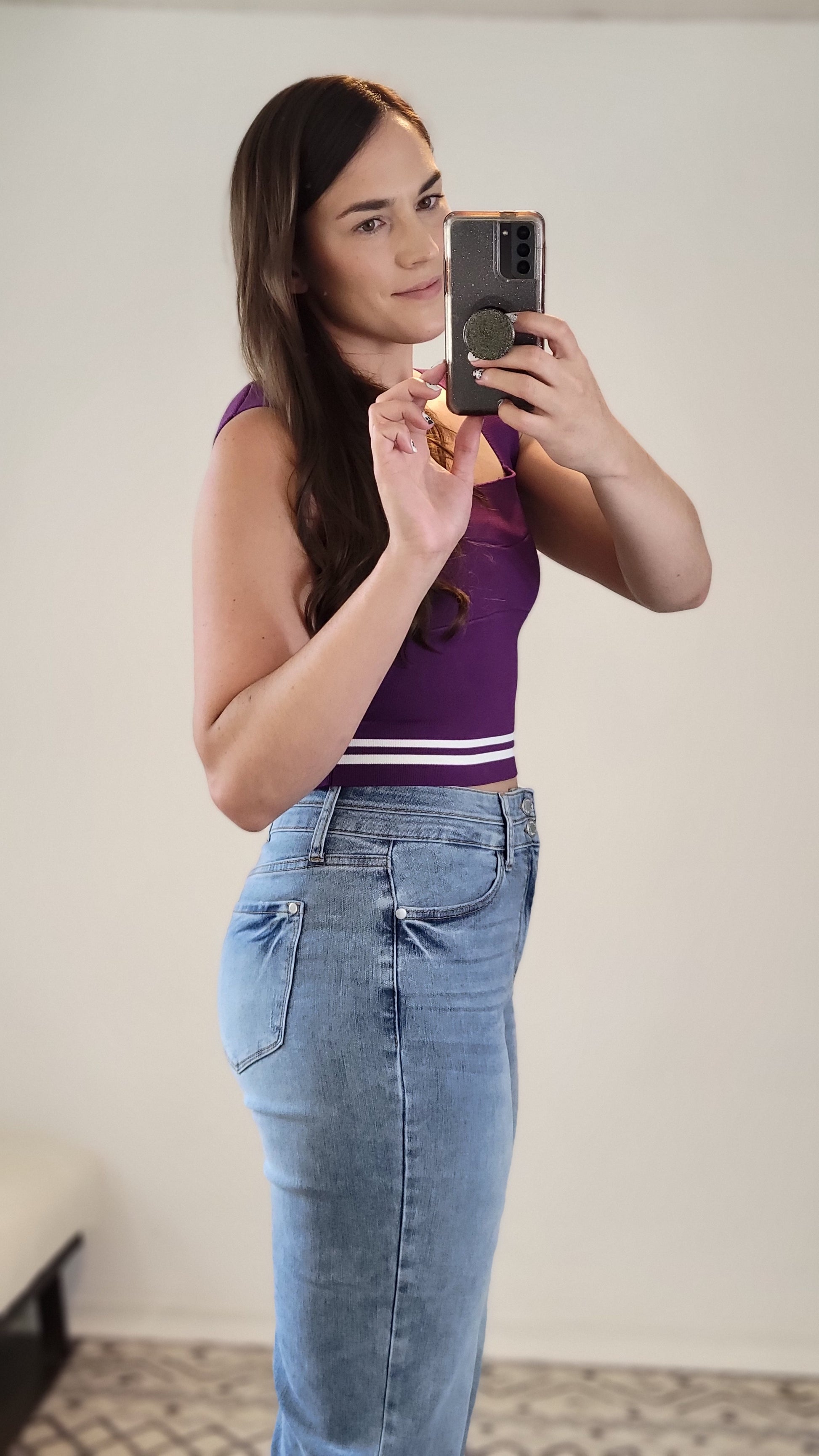 Details: This sporty game day crop top is so fun! Such a gorgeous purple. It has lots of hold and a thick material so you can wear it with pasties without them showing. We are loving the square neckline and the length! It looks so cute with wide leg crop jeans and some sneakers.