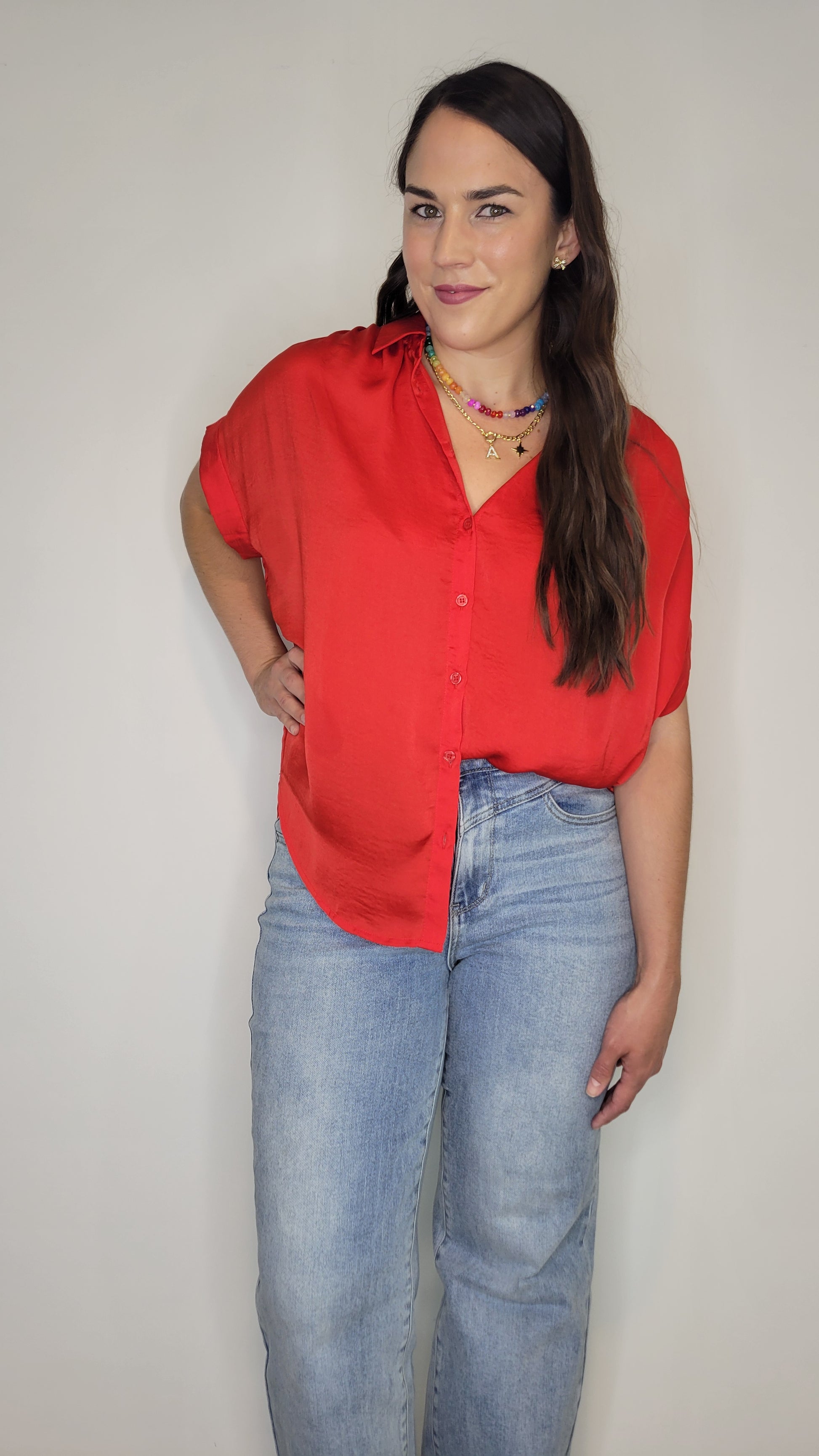 Red Satin Collar Button Up Top “Rosalie” (S)