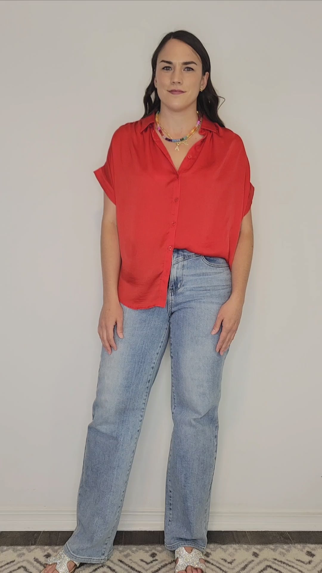 Details: This blouse is a gorgeous! It is is such a pretty red satin. Collared with red buttons. Soft and comfortable material. Cuffed short sleeves. Ruched shoulders. Lightweight and relaxed fit. Swoop hem and longer in the back. It looks great with a french tuck. She looks good with jeans or put her with some dress pants!