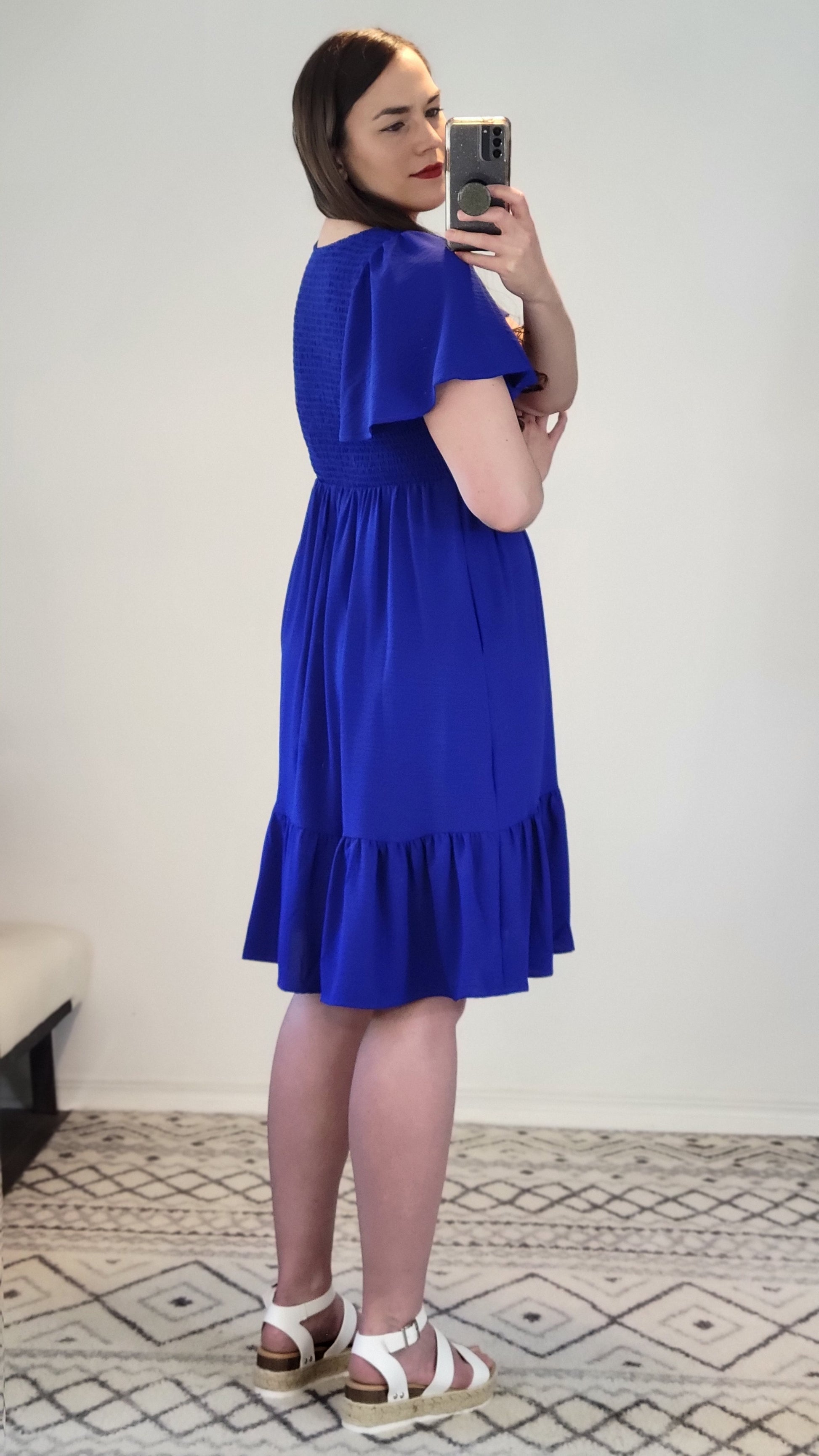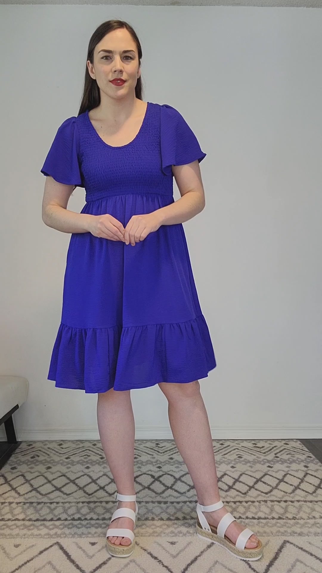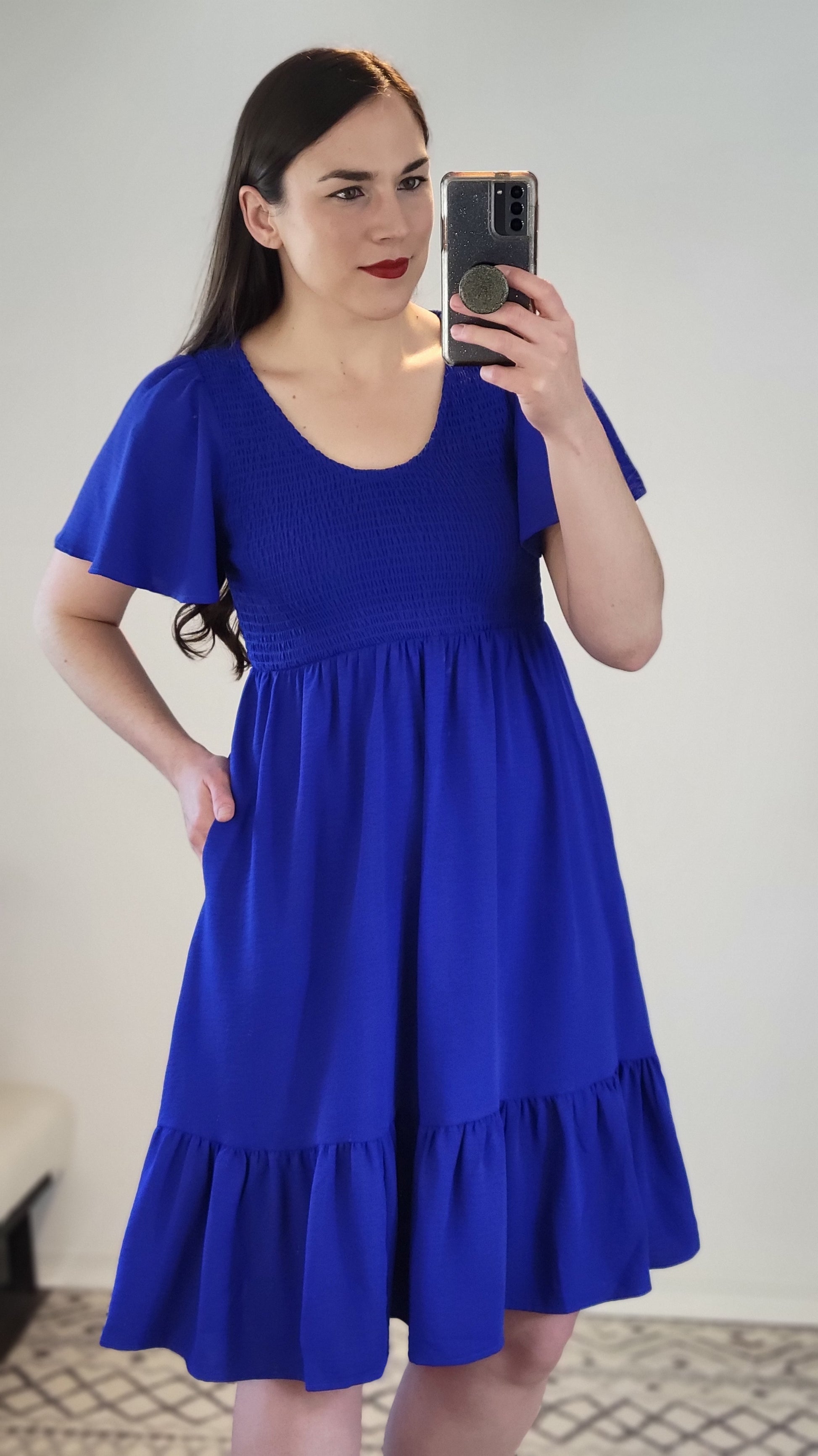 Details: This vibrant royal blue dress is perfect. Smocking throughout the top, airflow material, flutter sleeves, and pockets. The length is more modest for a mini dress. Loving this look for the fourth of july.