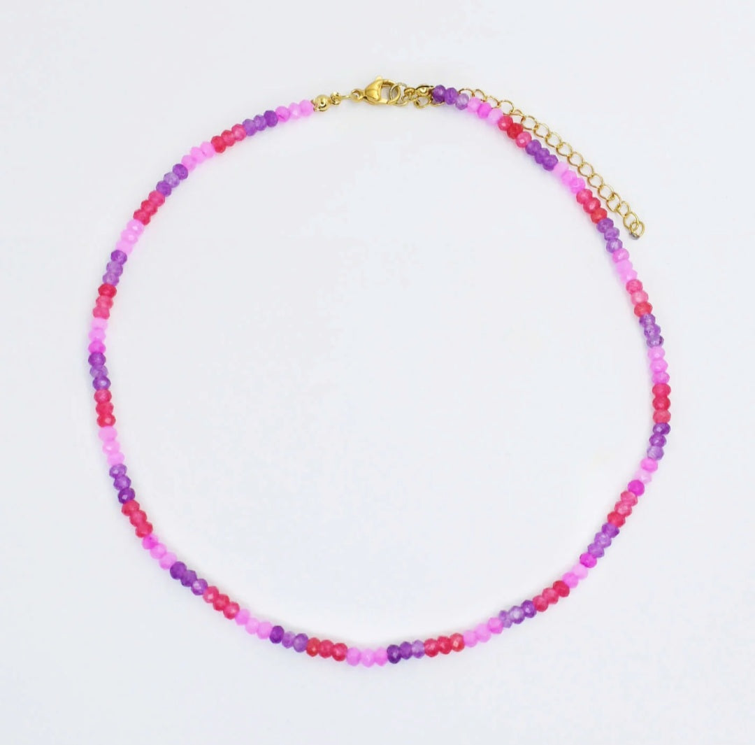 Add a playful pop of color to any outfit with this dainty gemstone necklace, featuring a vibrant mix of pink, purple, and red beads. Lightweight and delicate, this piece brings just the right touch of sparkle and personality. Perfect for layering or wearing solo, it’s an effortless way to brighten your day-to-day look. Finished with a gold extender chain for adjustable length and comfort.