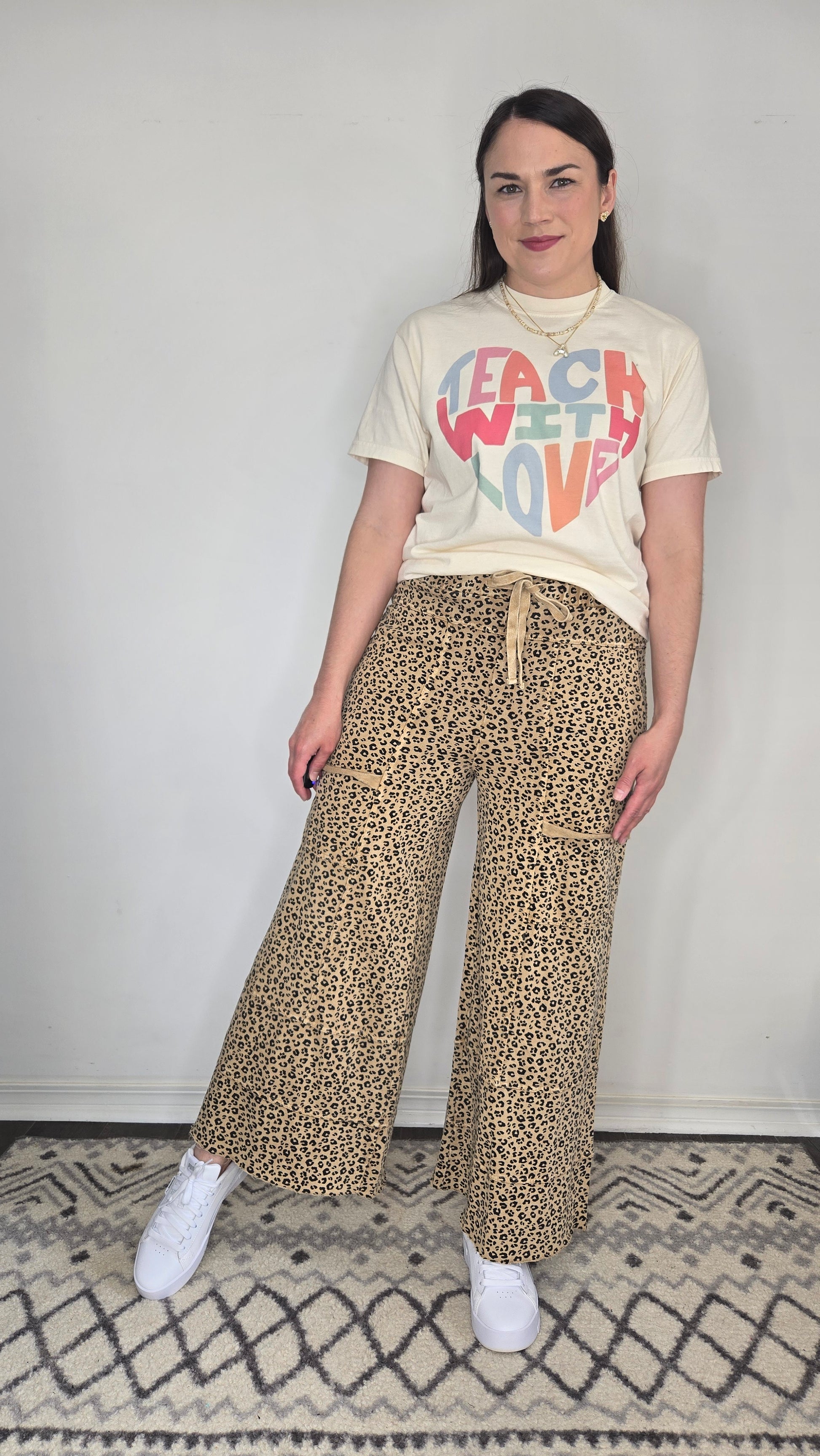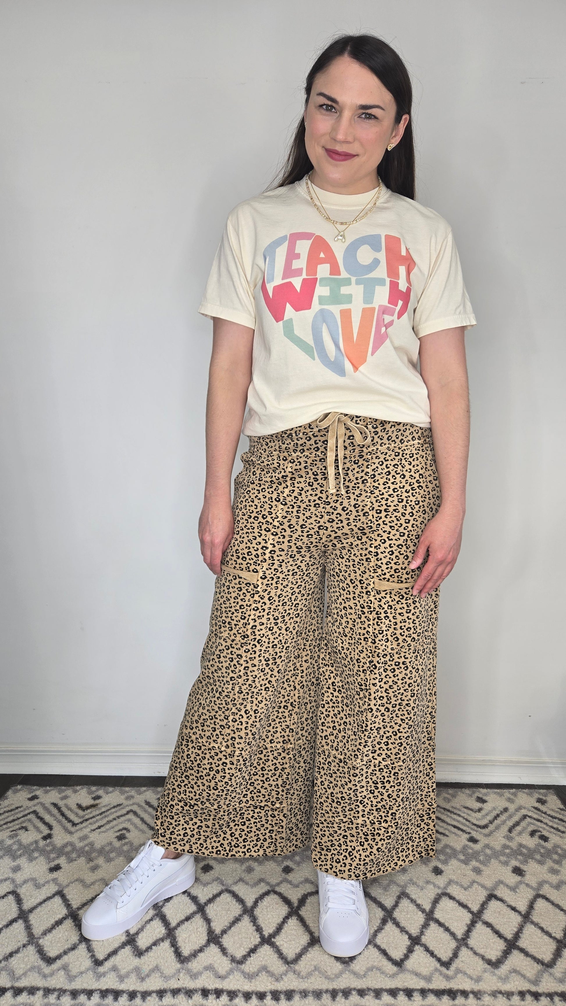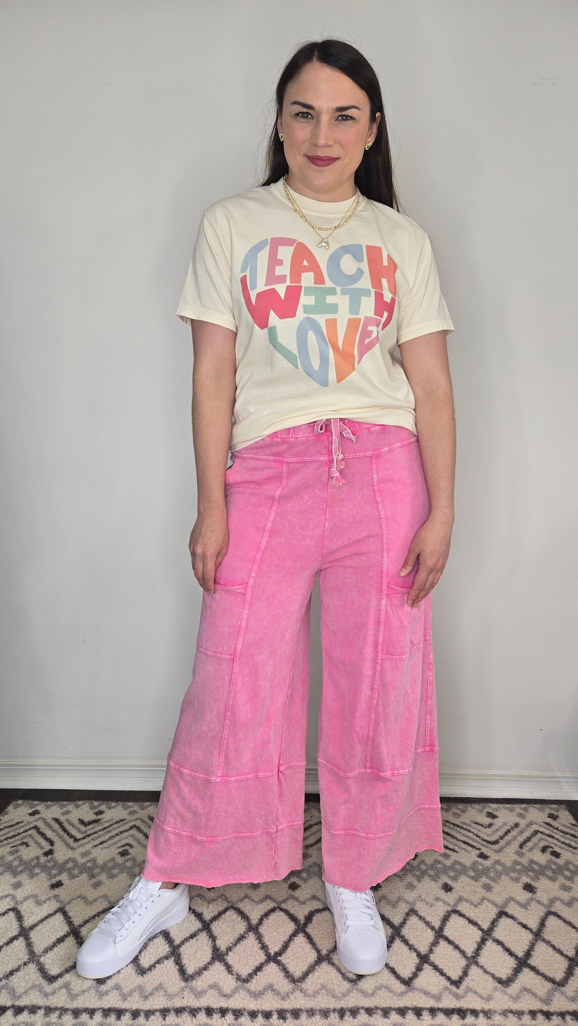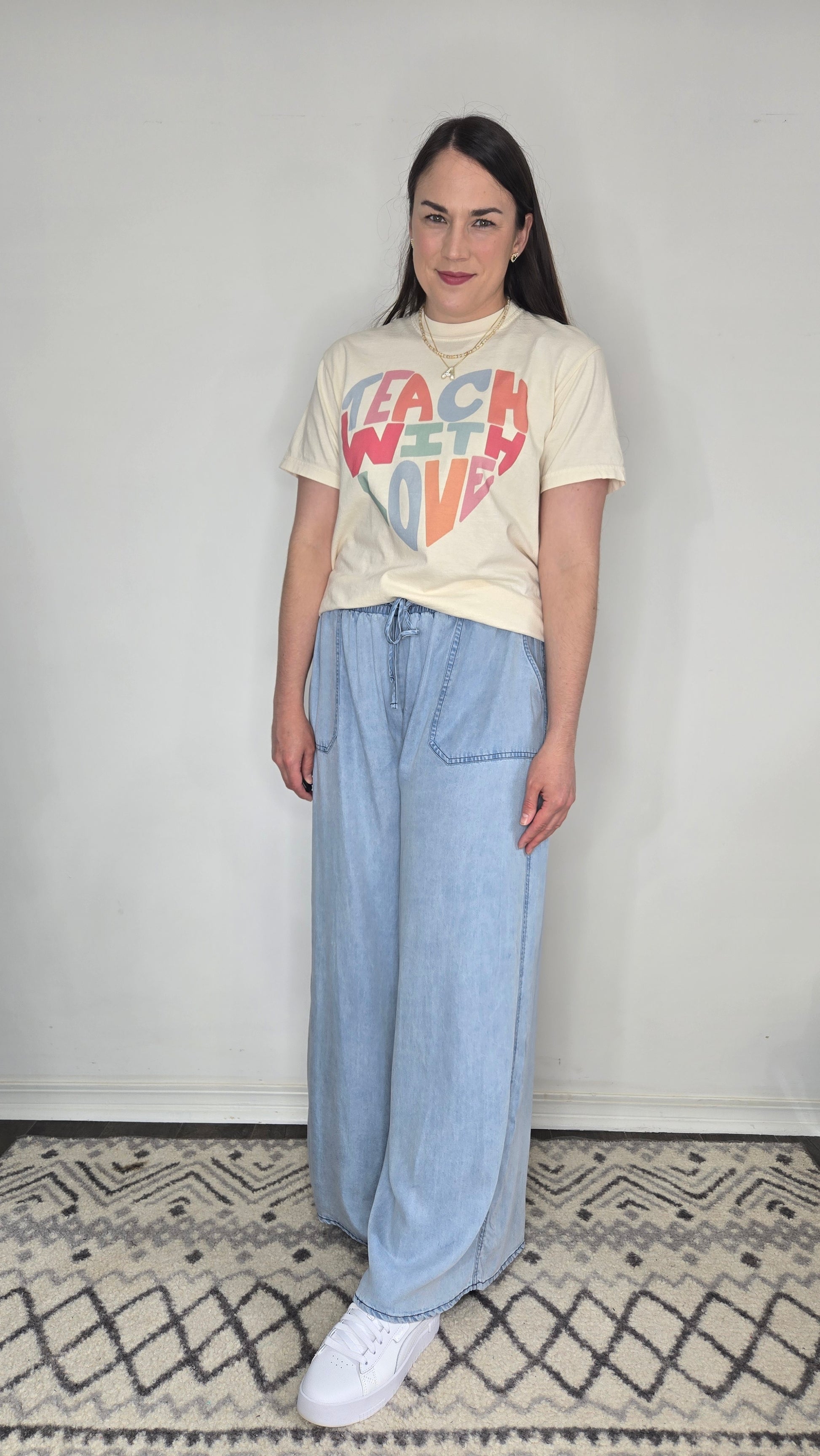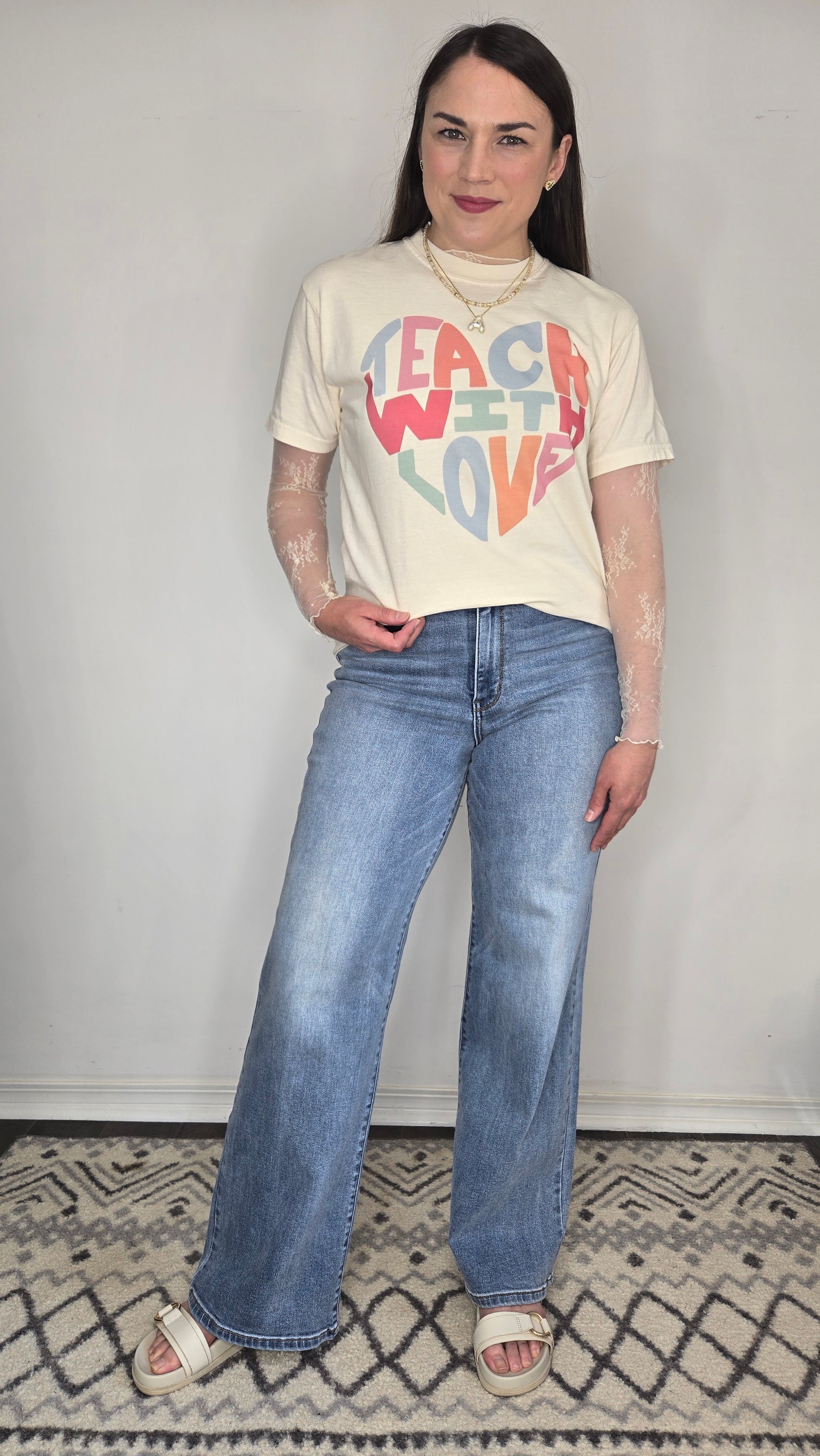 Description: This cheerful graphic tee features the uplifting message "Teach With Love" in playful, retro-inspired block letters arranged in a heart shape. The soft, vintage-style design pops with a mix of pastel and bold hues—pink, coral, blue, and sage—on a creamy, off-white base. Crafted from a lightweight, breathable fabric, it’s the perfect blend of comfort and inspiration for any teacher spreading positivity in and out of the classroom.