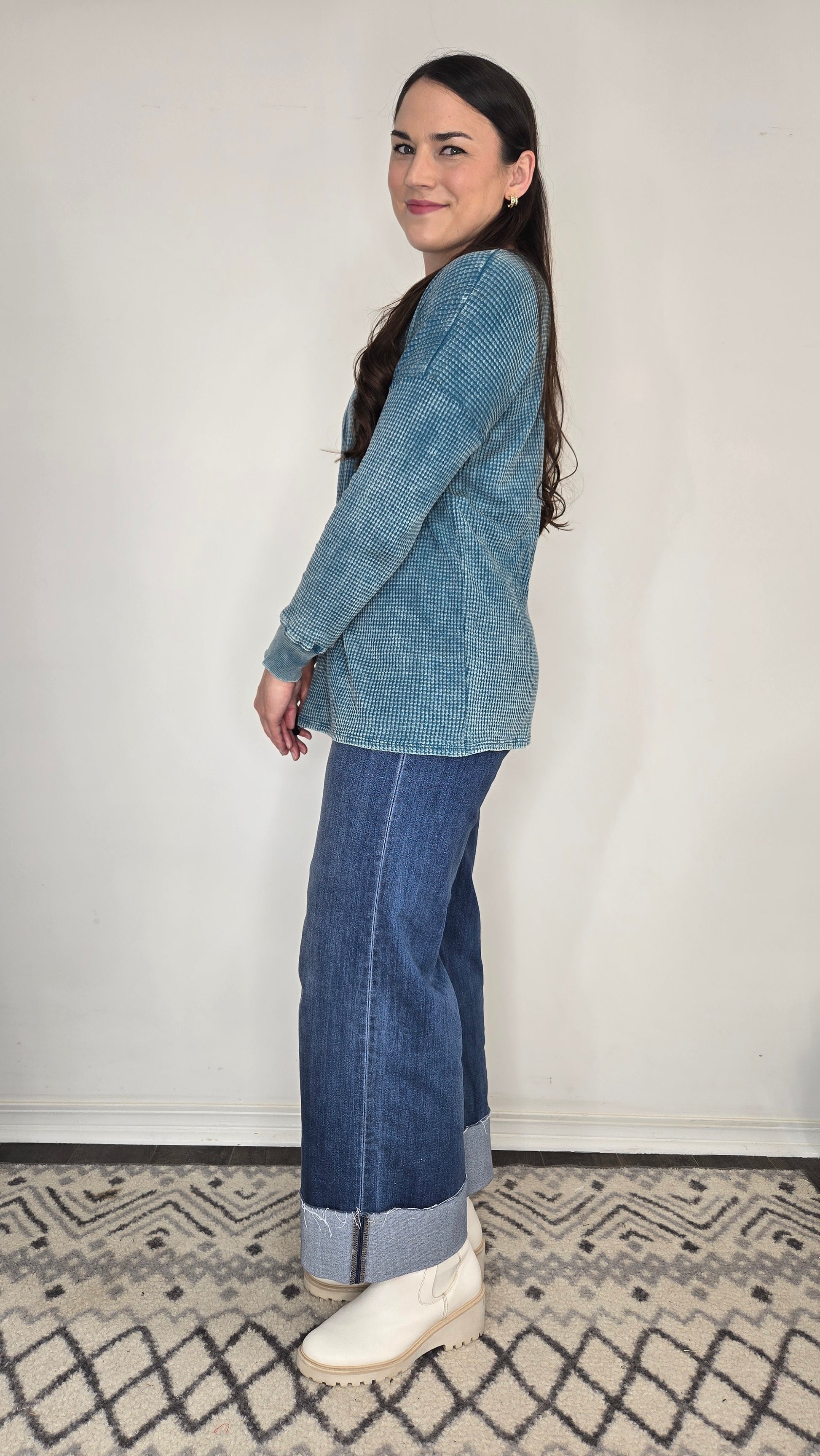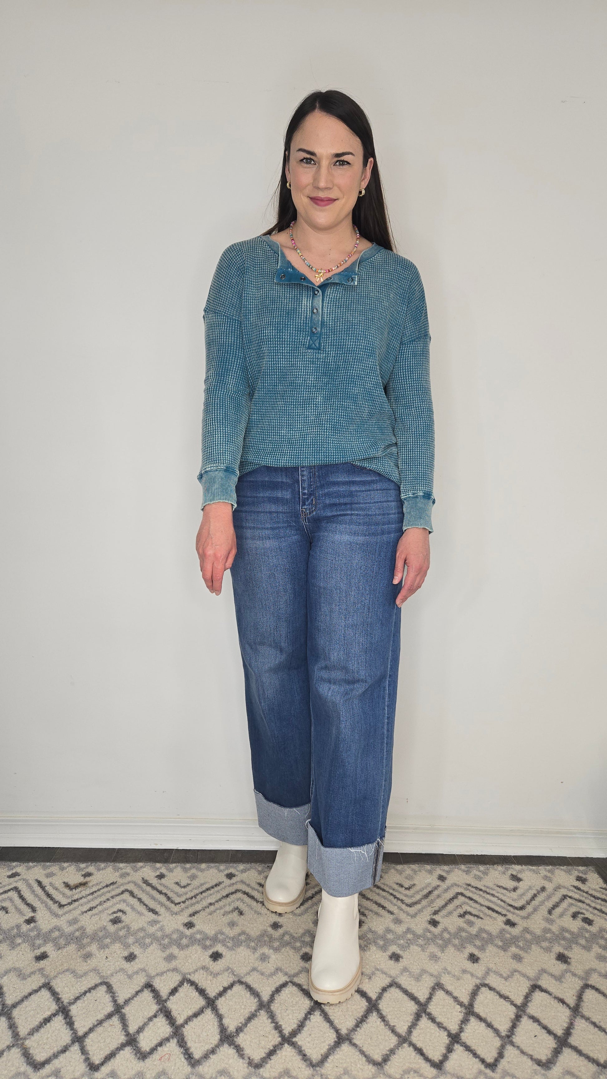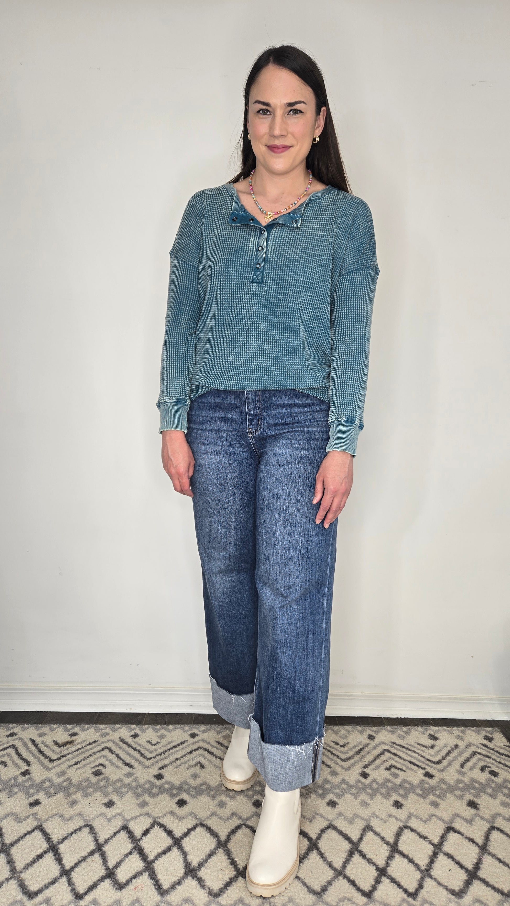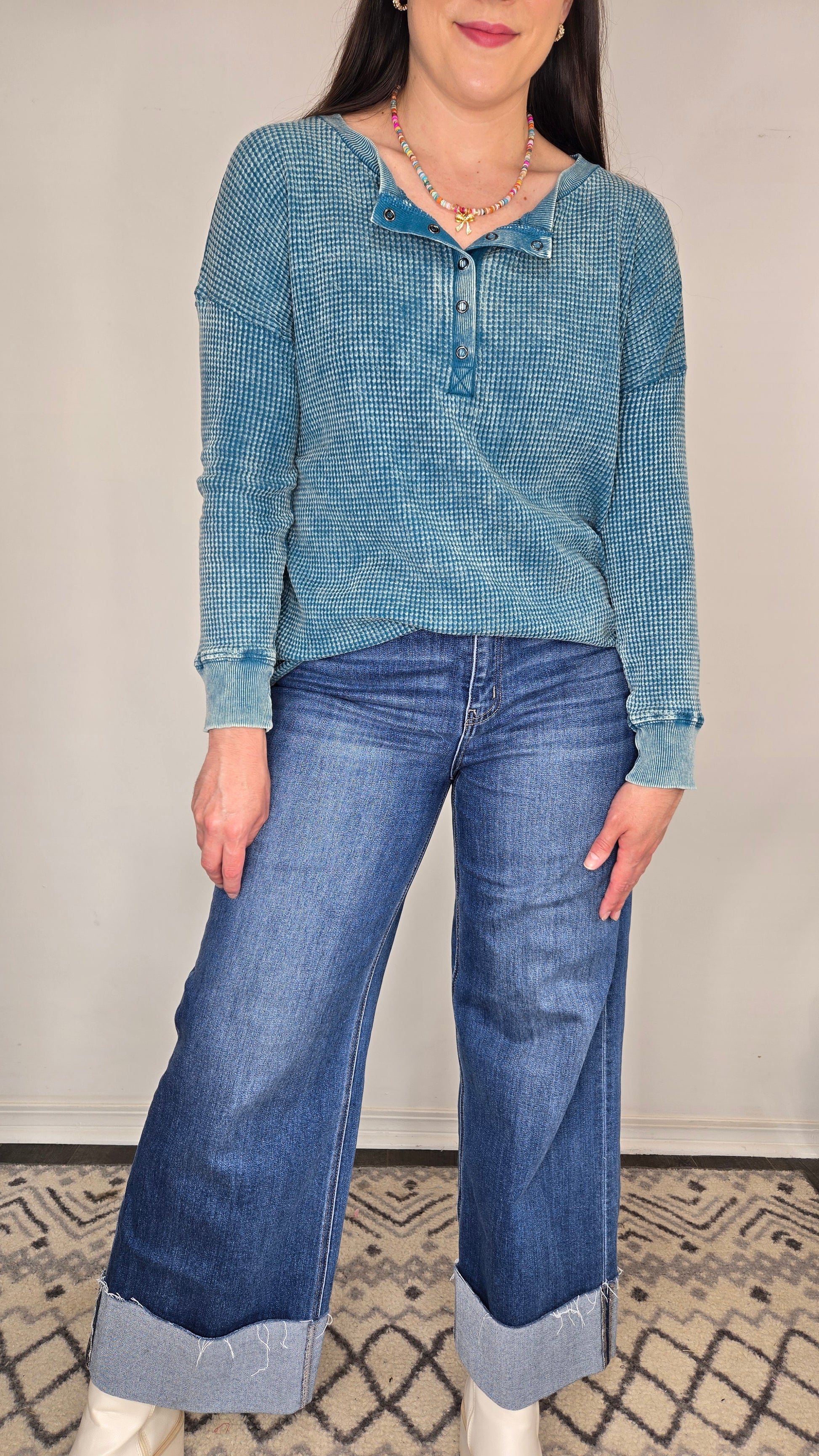 Teal Acid Wash Henley Waffle Long Sleeve Top "Tia"