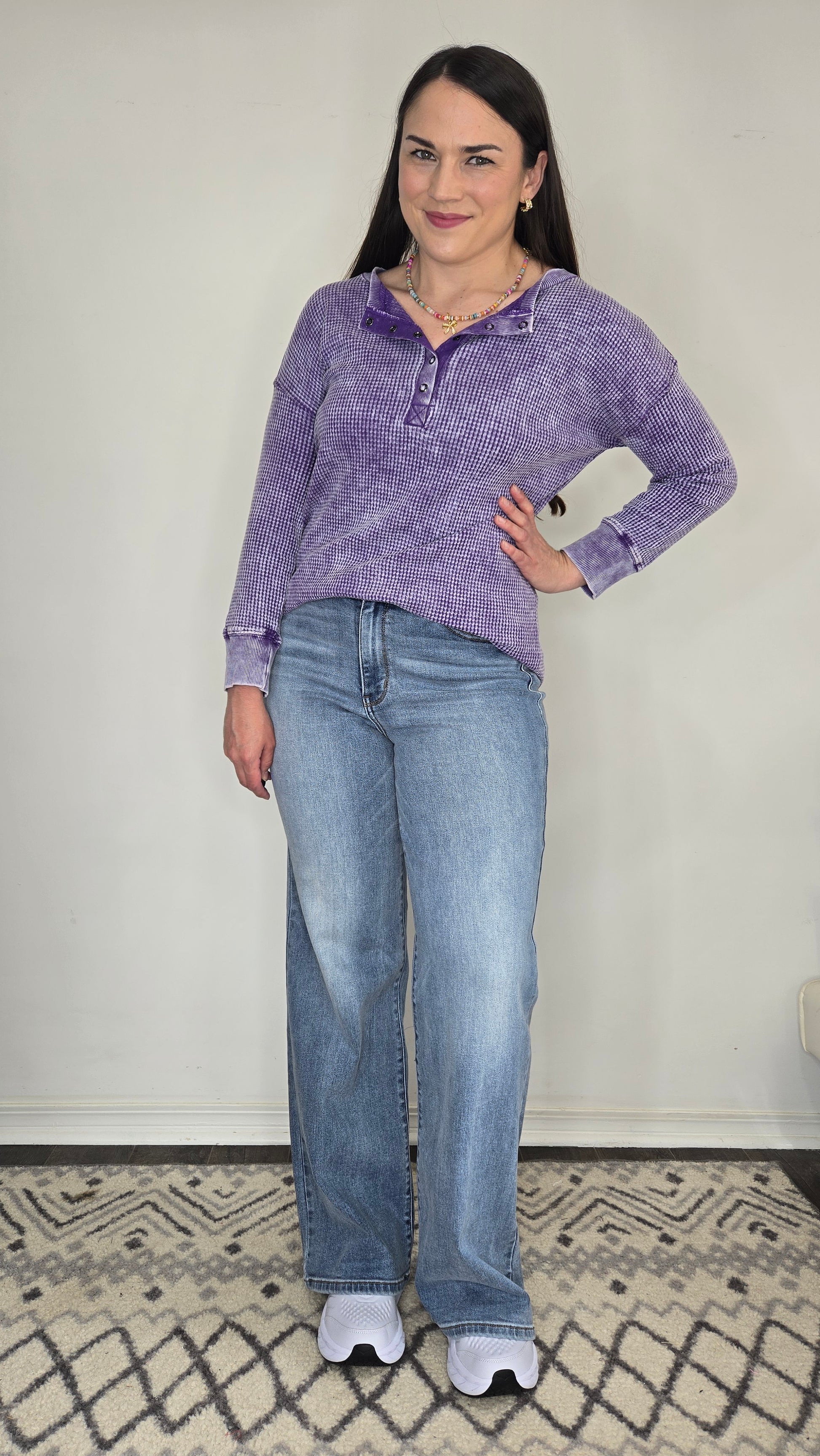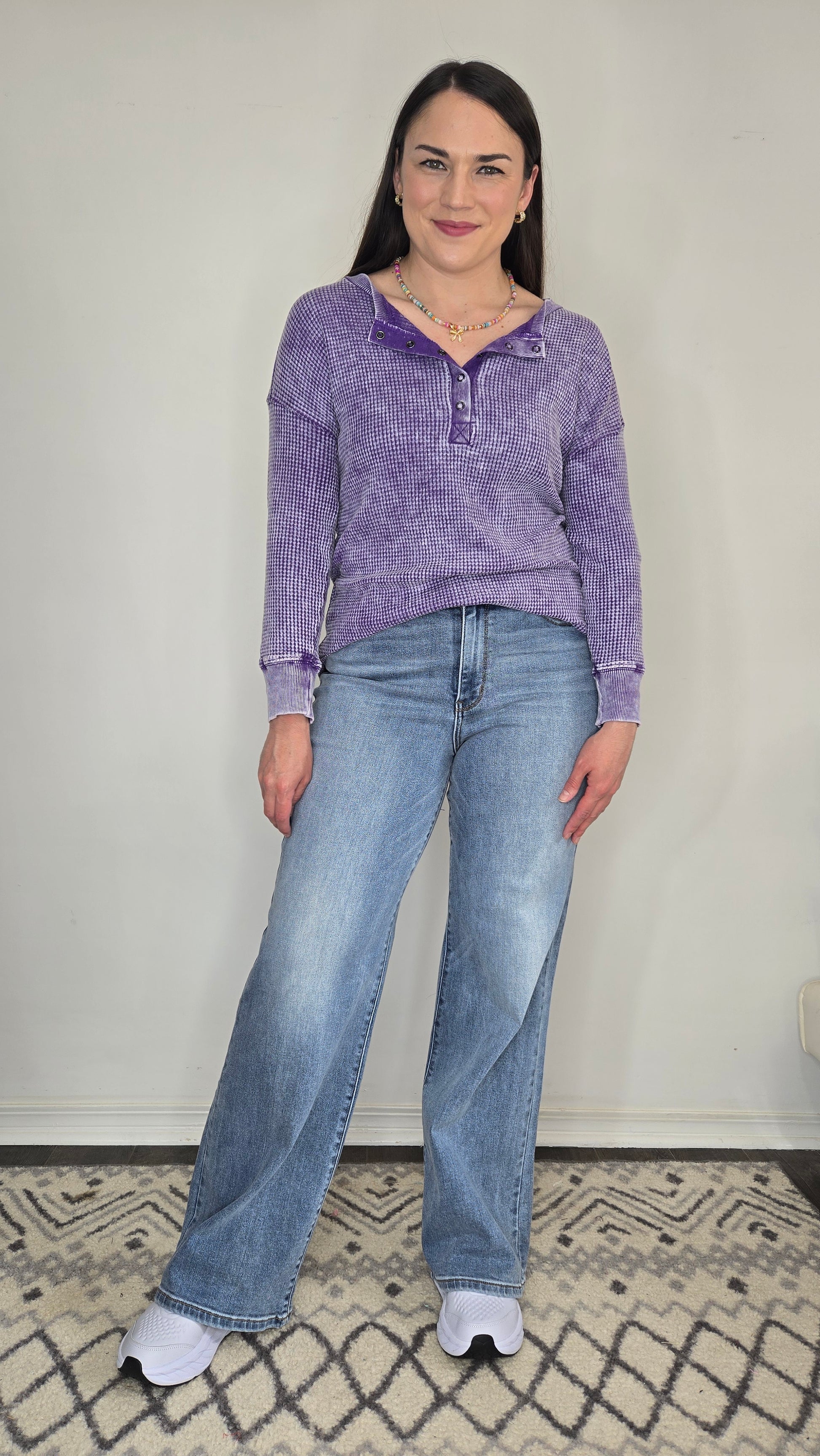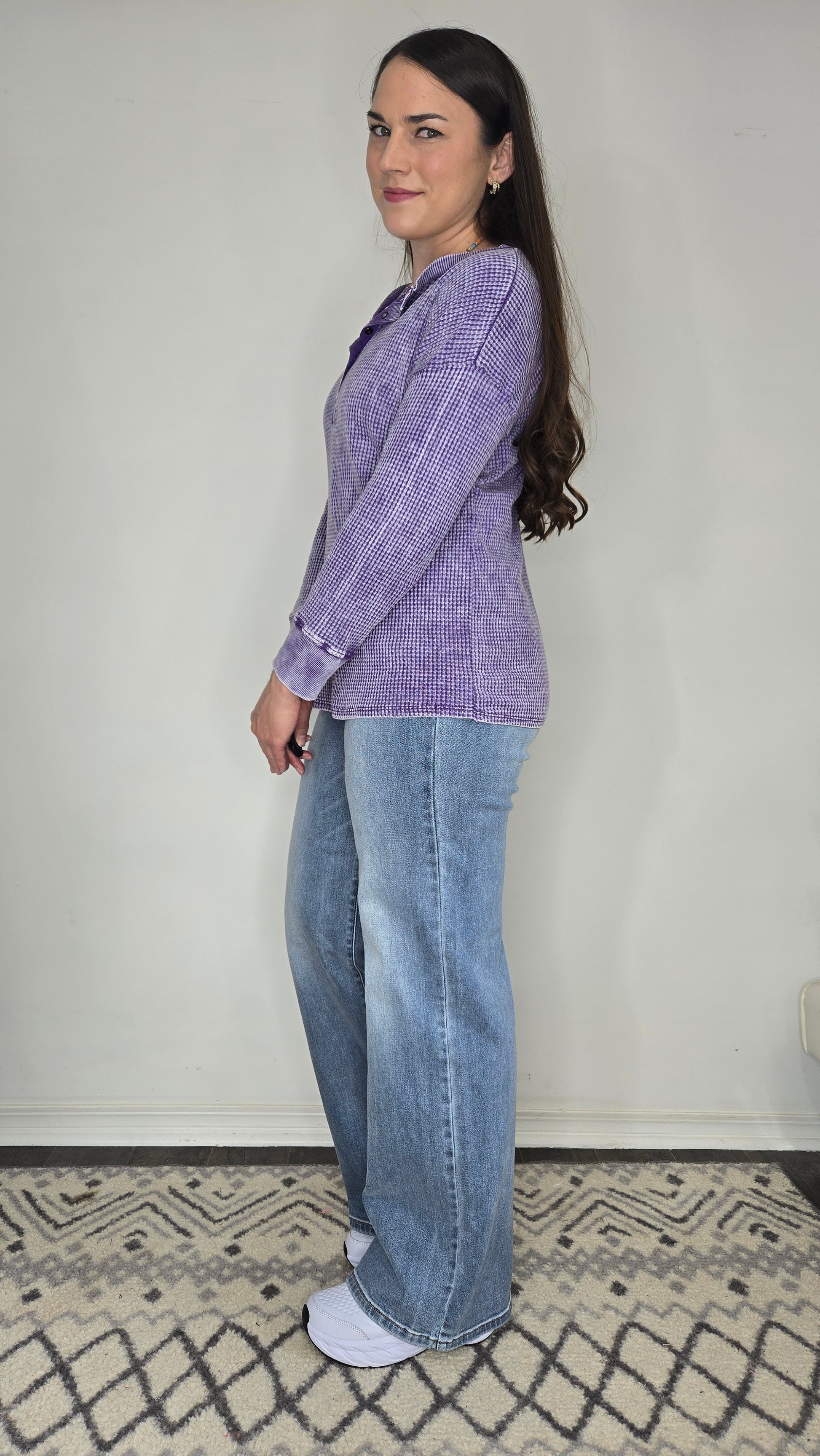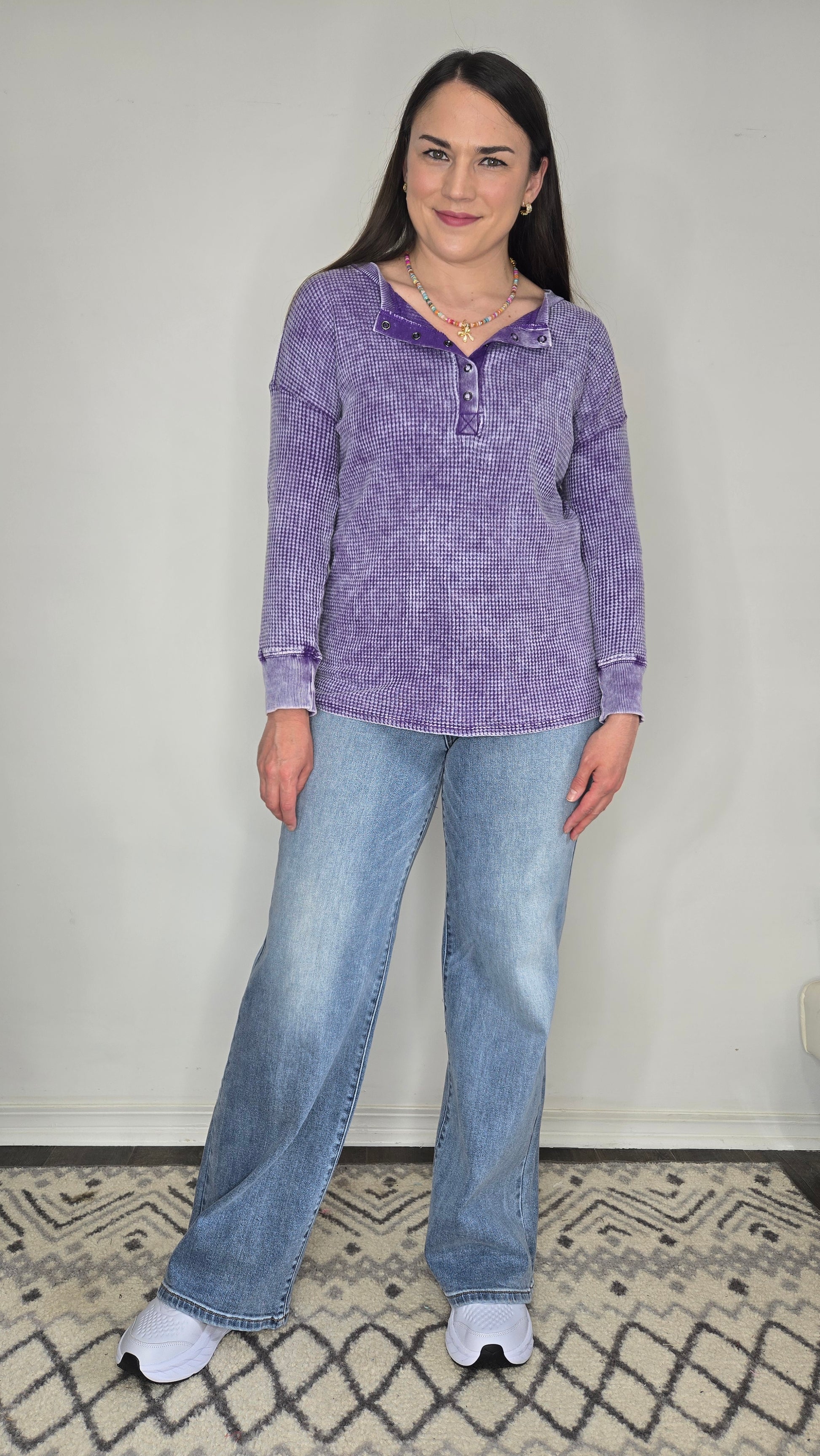 Violet Acid Wash Henley Waffle Long Sleeve Top "Vanessa"