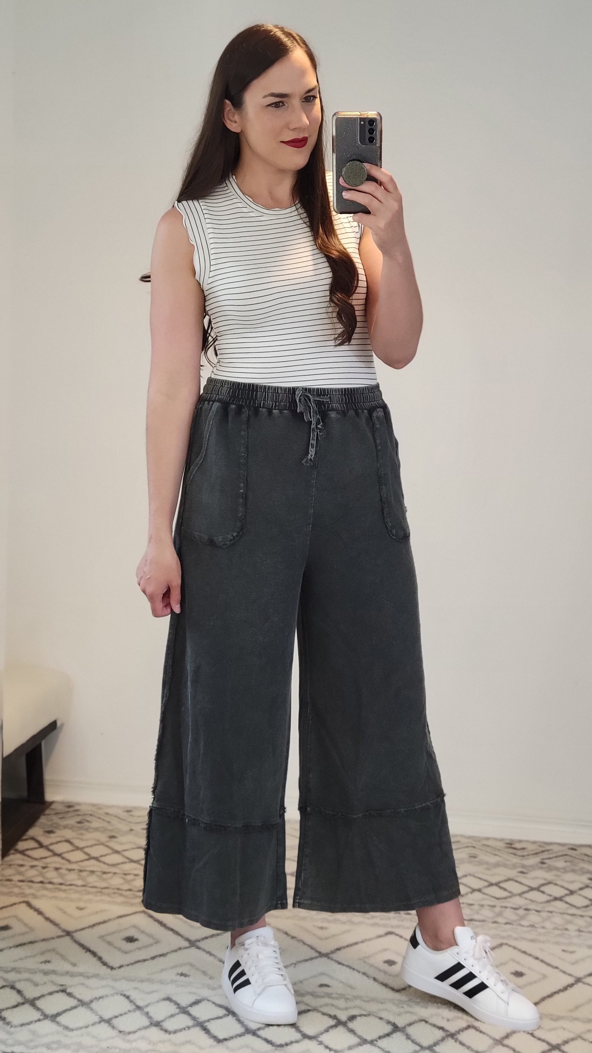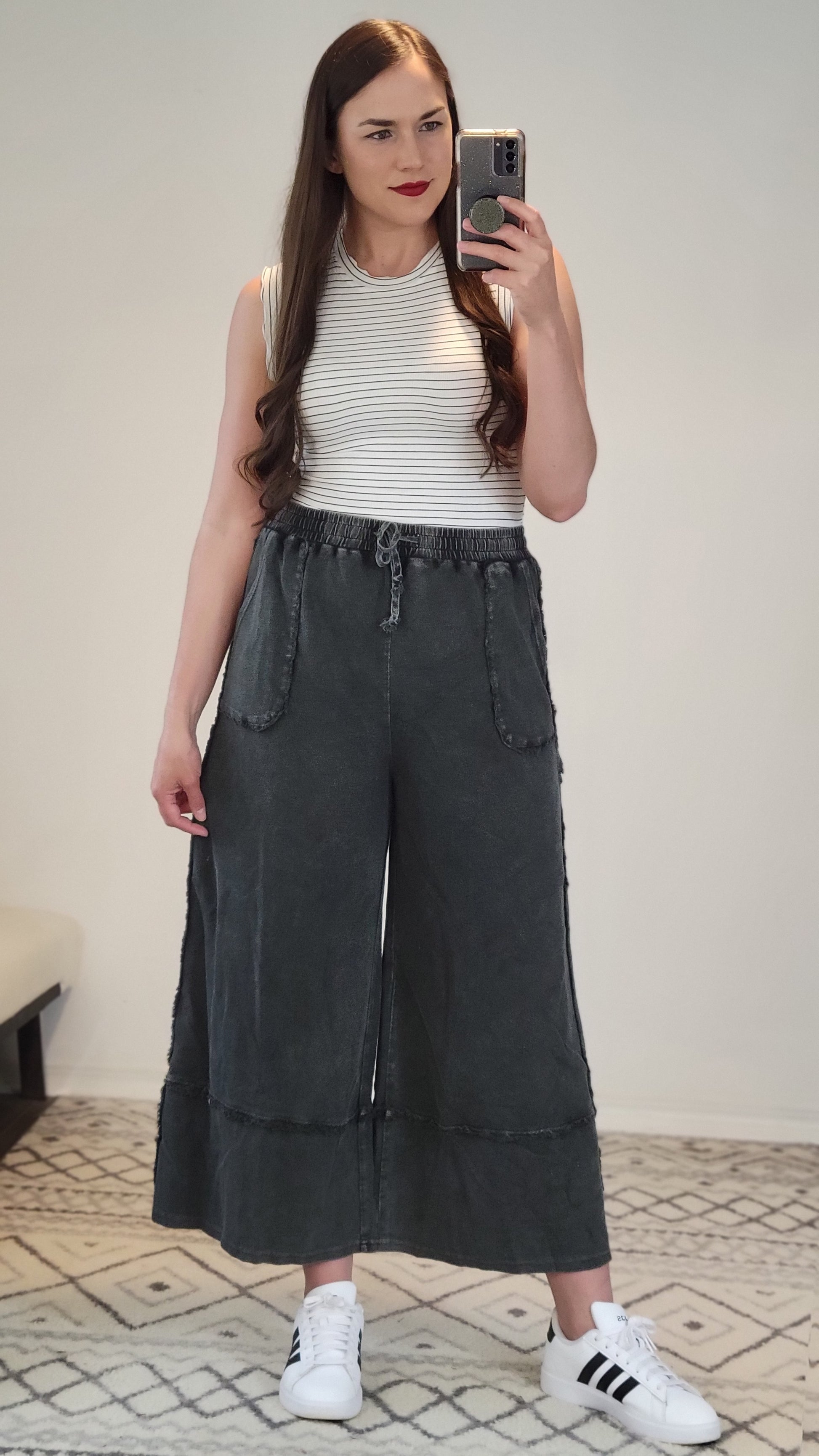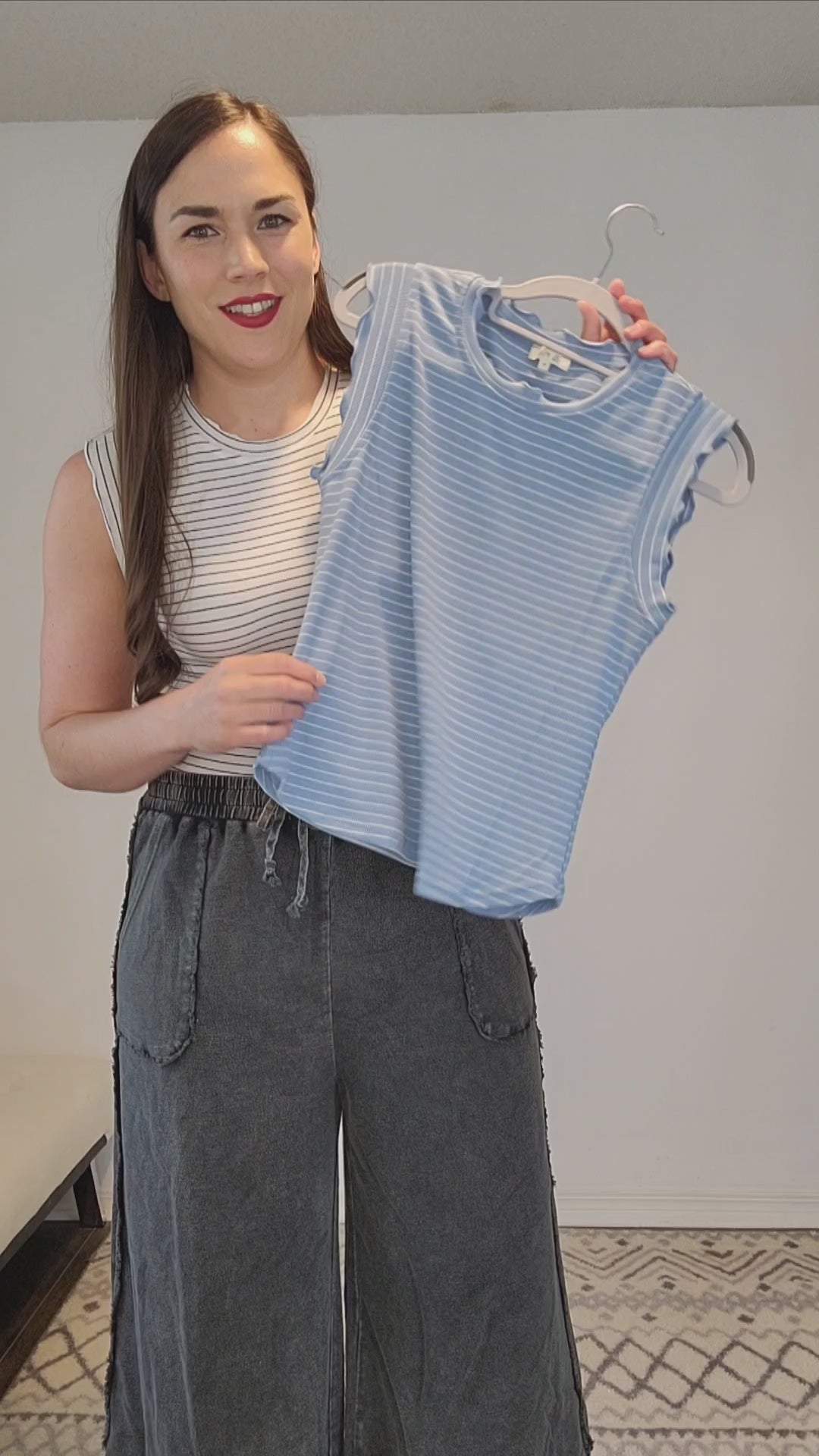 Details: Effortlessly easy and so essential, this timeless sleeveless top features a ruffle detailing on the neck and sleeve. Stretchy, soft, ribbed, and lightweight fabric. Slightly swooped hemline. The length is perfect for tucking into high waist bottoms without a lot of extra material. It’s so versatile and goes with a lot.