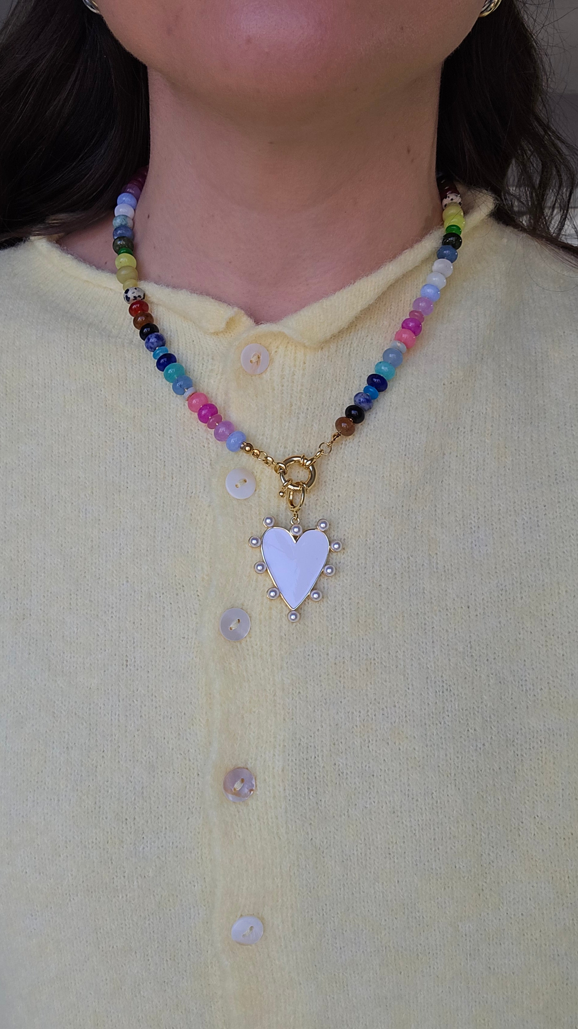 Sweet, feminine, and effortlessly eye-catching. The White Gold Heart Charm features a glossy white heart framed in gold and trimmed with delicate bead accents for a soft, textured look. Clip it onto any clasp-style necklace to add a touch of charm and everyday elegance to your style.